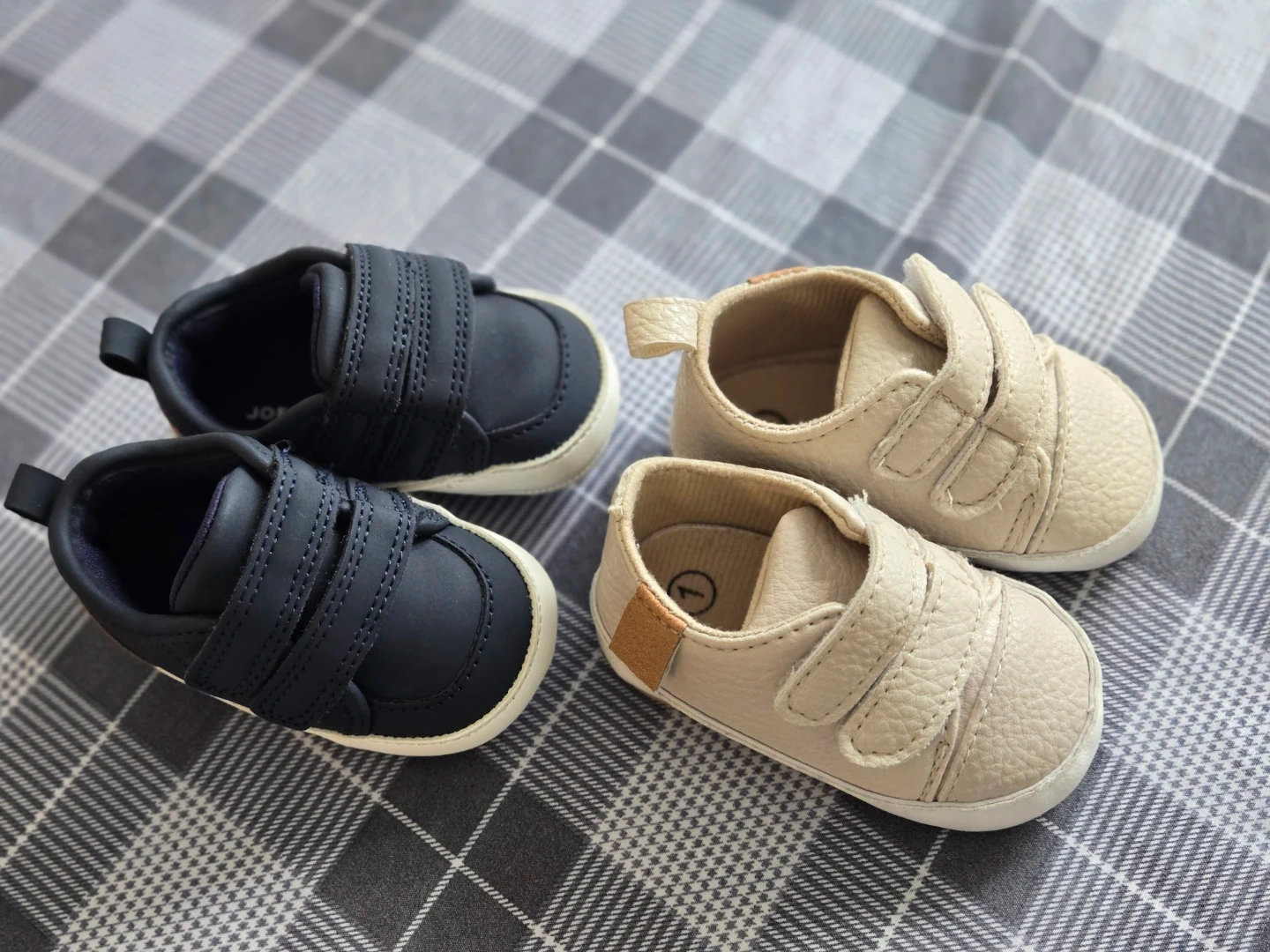 Pair of baby crib shoes, one blue black(Joe Fresh) and one beige(Baby). These little shoes have velcro closures for easy on and off.