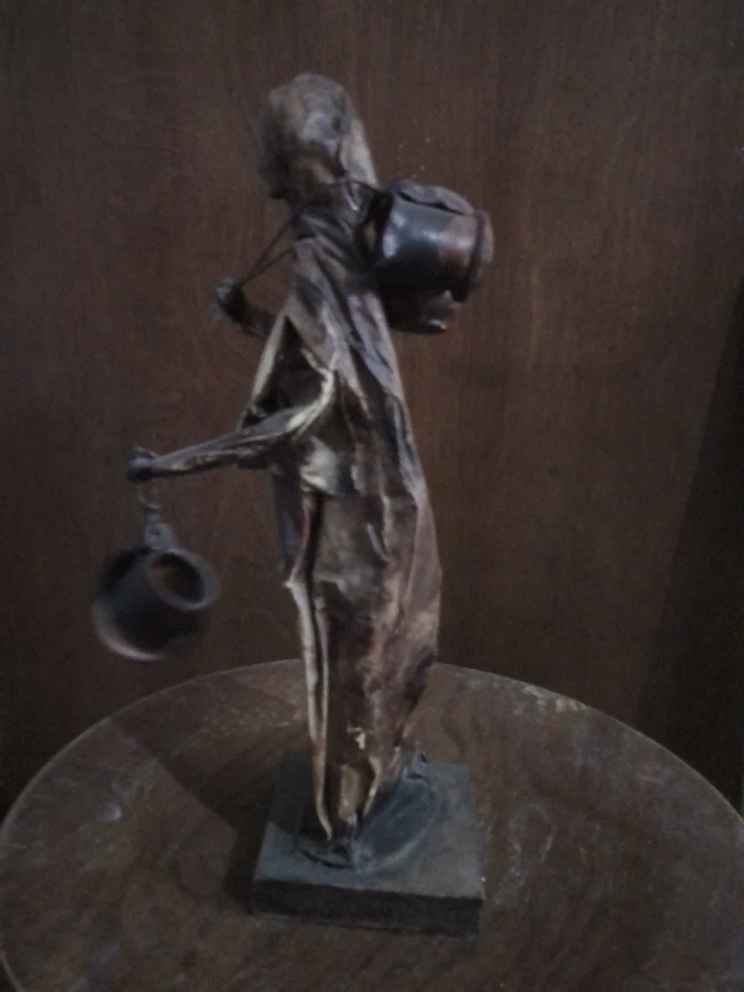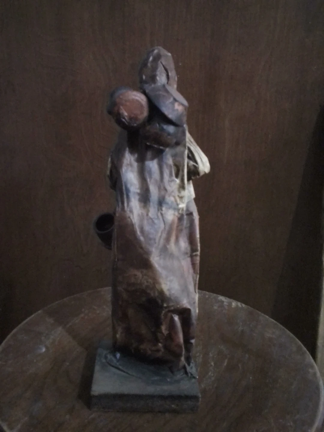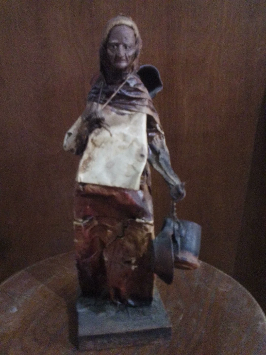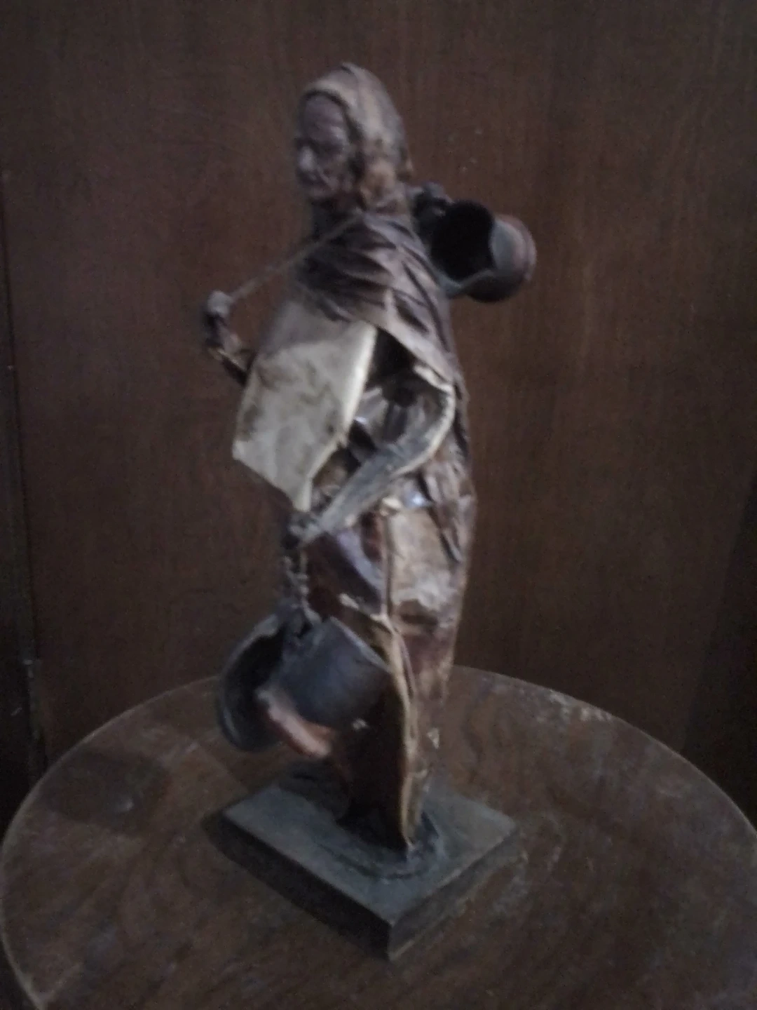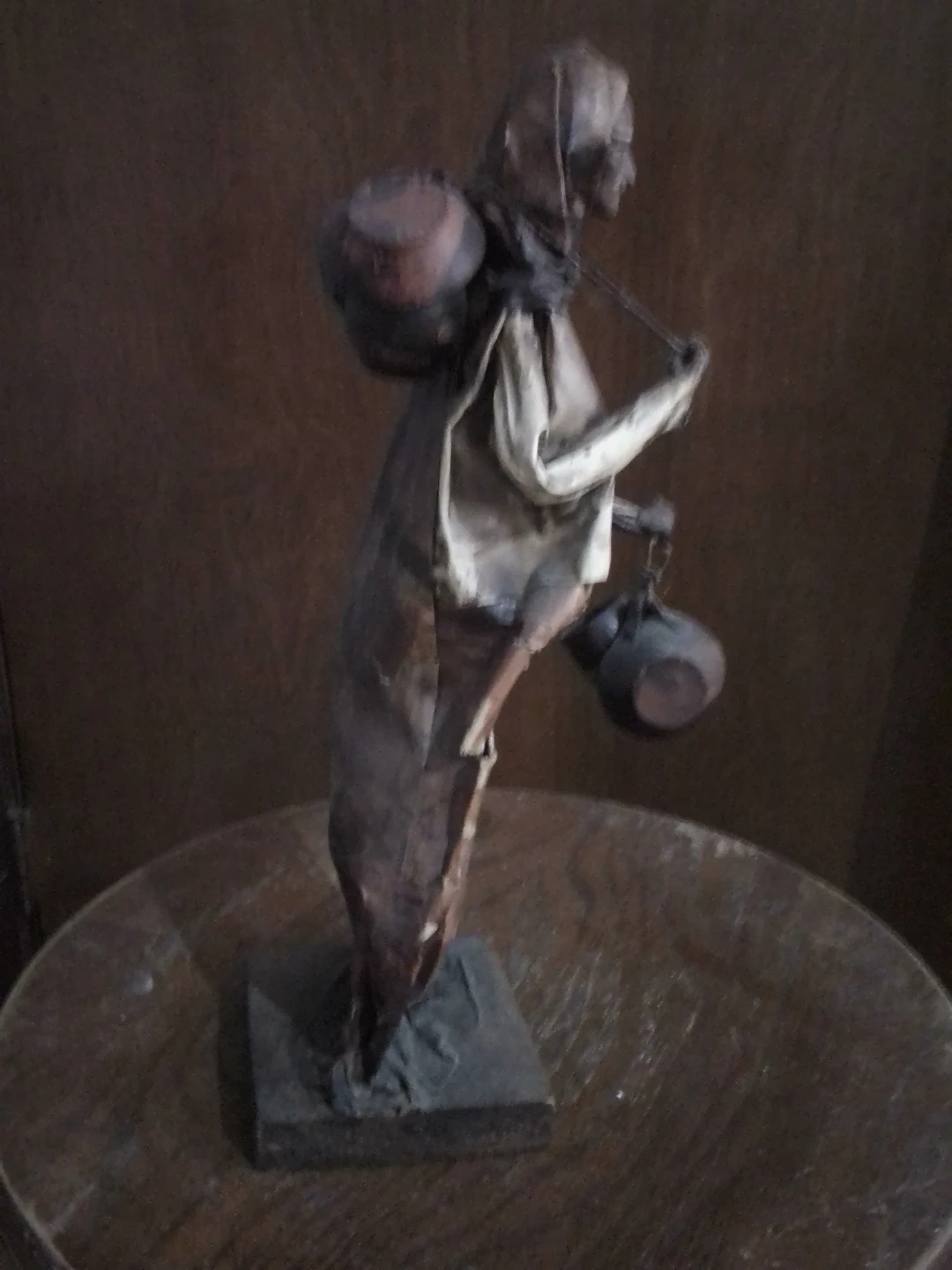 This is a unique paper mache figurine of a woman carrying pots. It depicts a traditional scene with great detail. The figurine has a rustic appearance.
