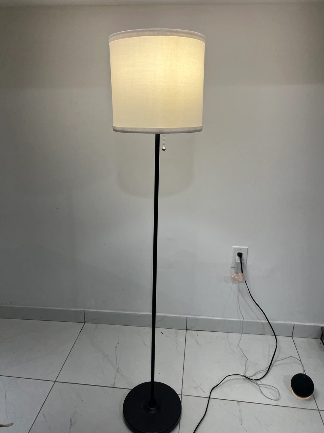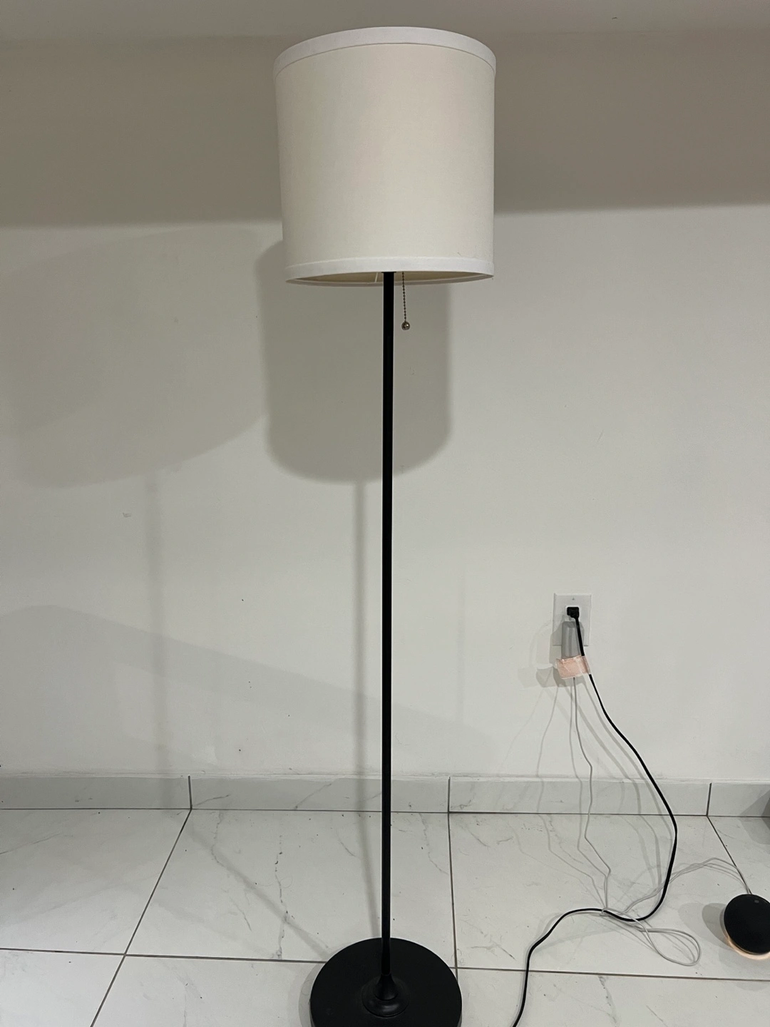 A tall floor lamp. Features a black metal pole. It has a round base. The lampshade is a light color. This lamp is ideal for creating a warm and inviting atmosphere in any room.