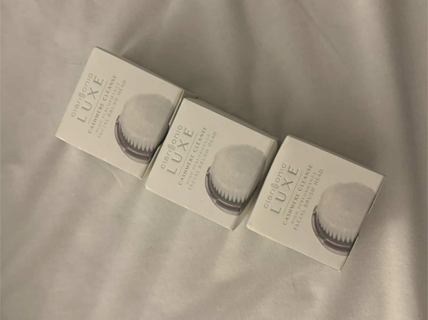 This listing is for three brand new Clarisonic Luxe Cashmere Cleanse High Performance Facial Brush Heads. They're designed for a gentle yet effective cleanse. Each brush head is new in its box. Cashmere bristles.