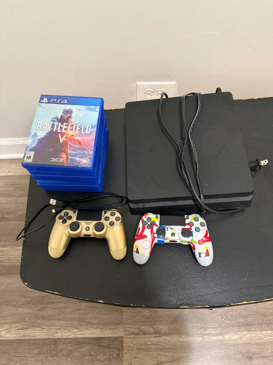This is a PlayStation 4 Slim console. It comes with two controllers, one gold and one with a custom paint job. Includes multiple copies of the game Battlefield V. All necessary cables are present.