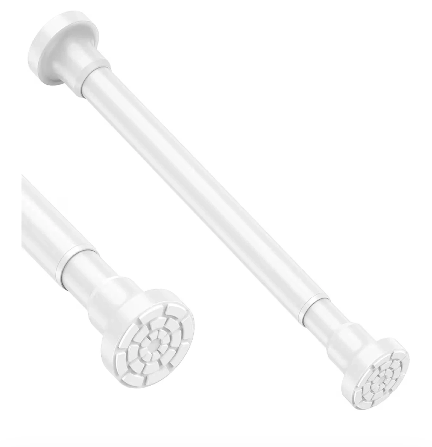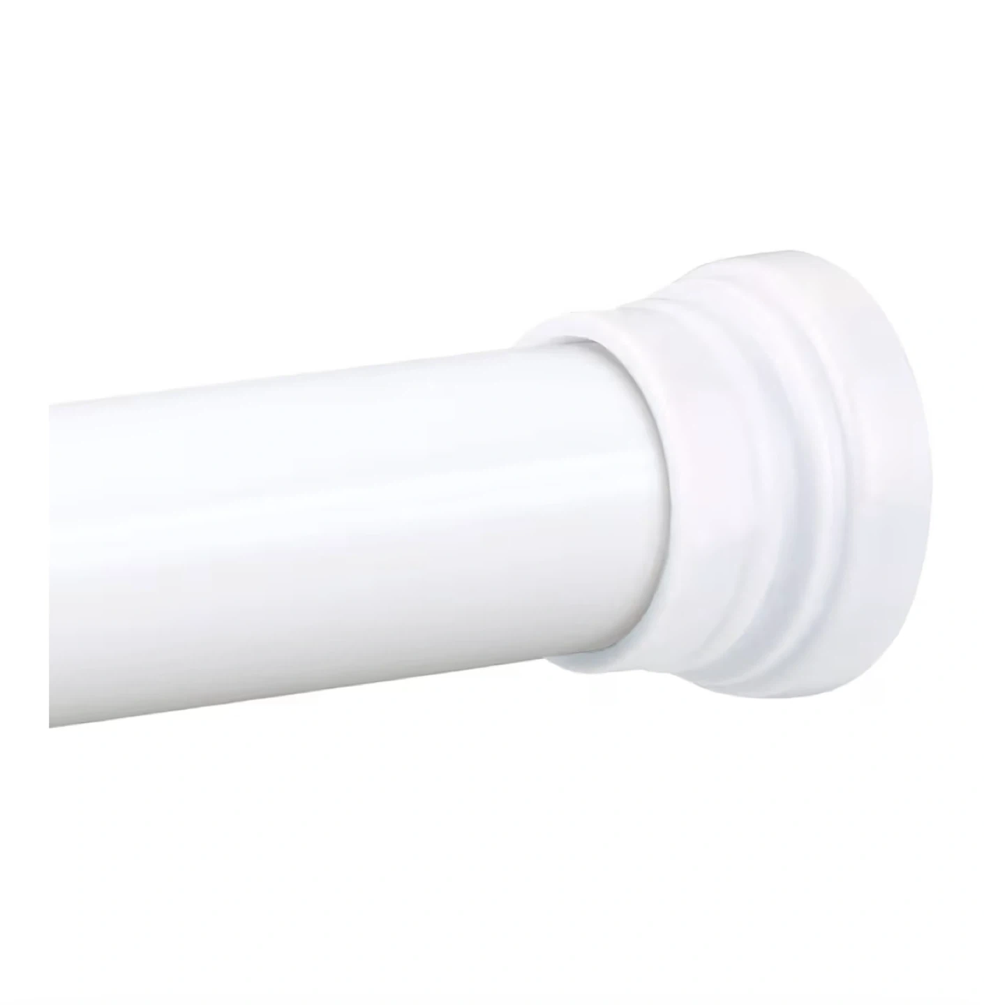 Here's a white tension shower curtain rod. It's in great shape and ready to be installed in your bathroom. It's easy to install and adjust to fit your shower space. A simple and practical solution for your shower curtain needs