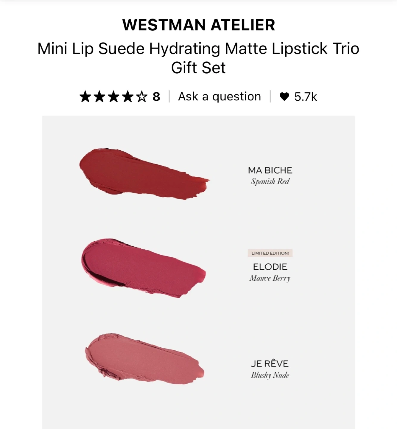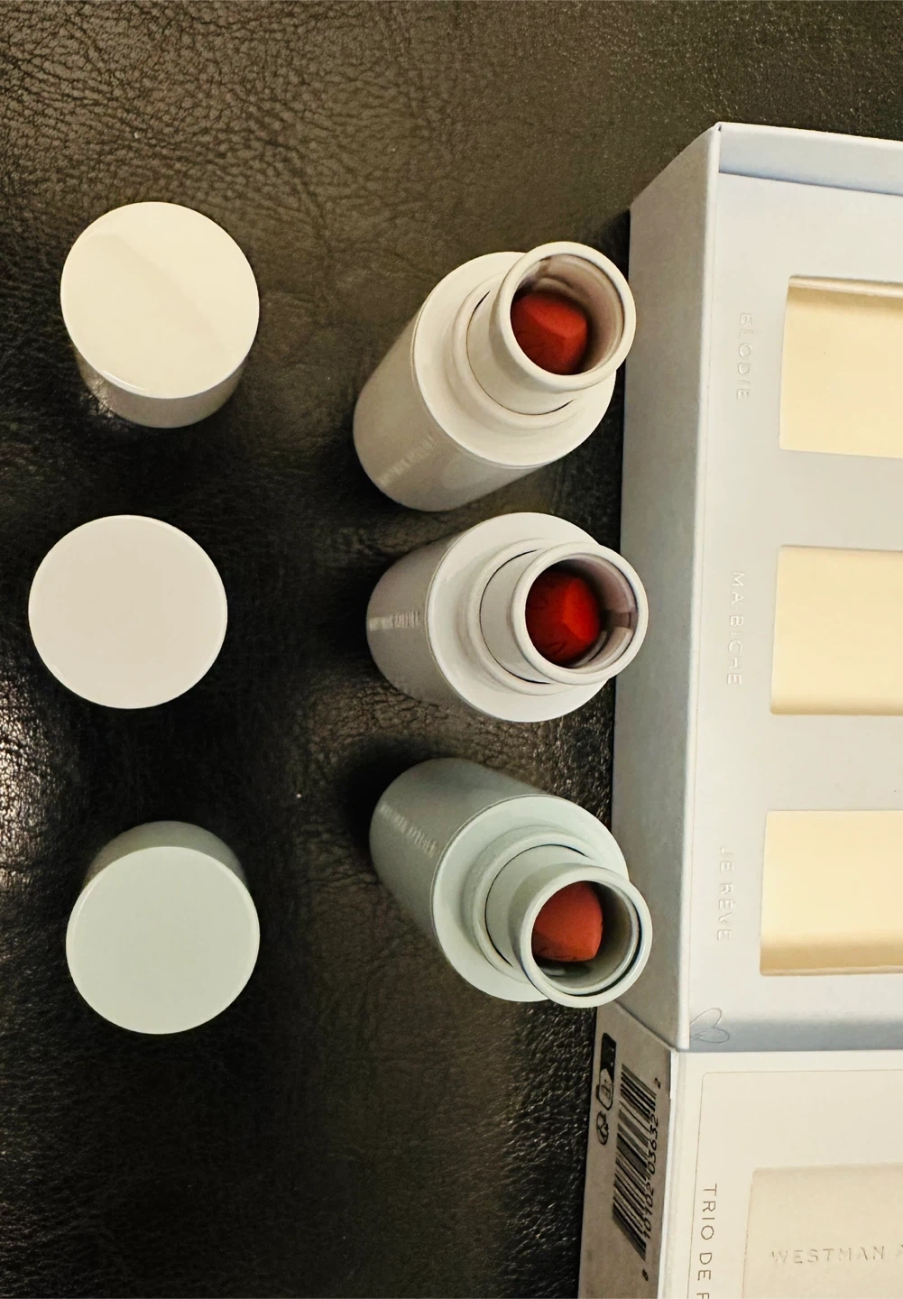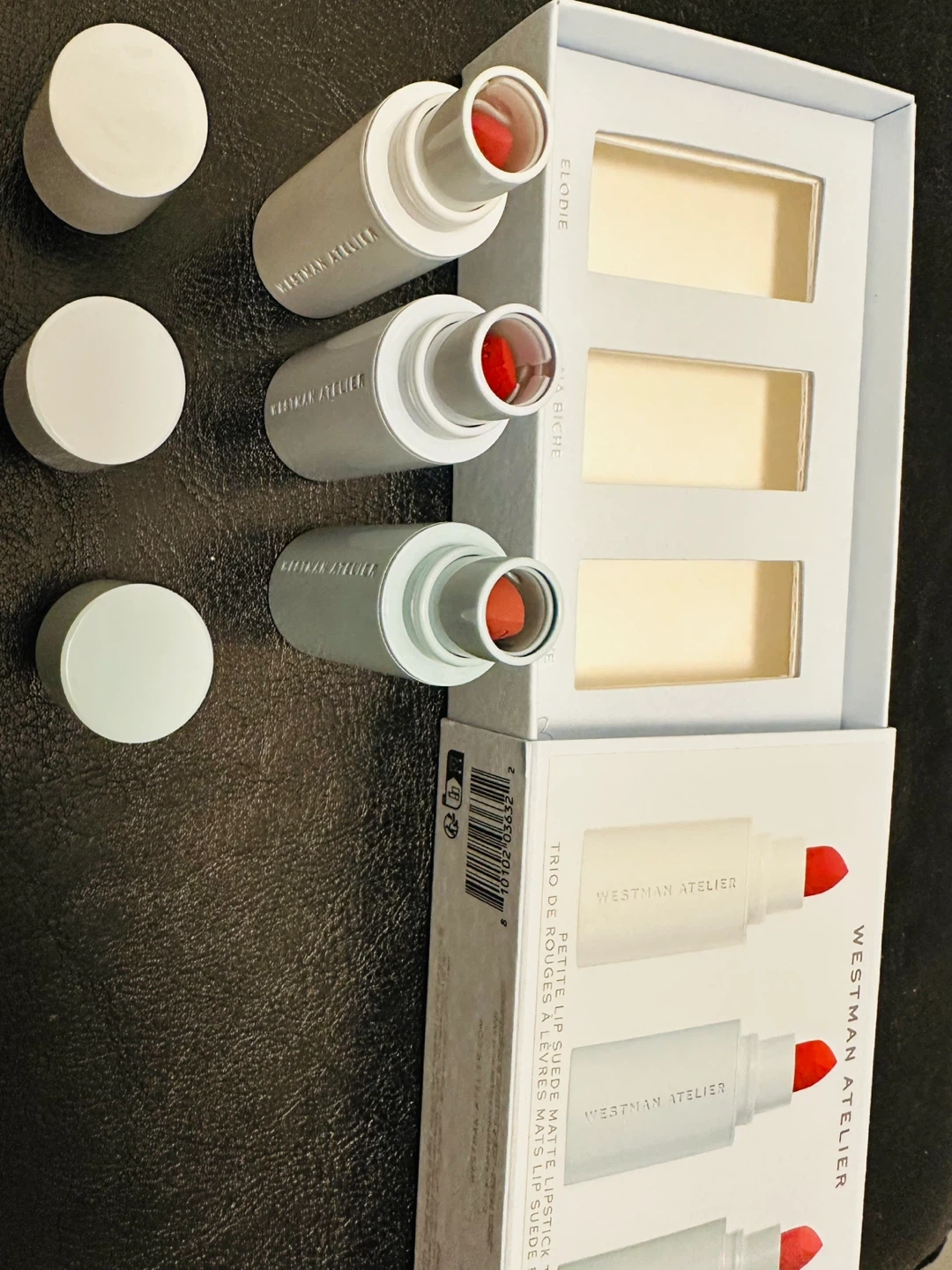 Selling a Westman Atelier Mini Lip Suede Hydrating Matte Lipstick Trio Gift Set. The set includes three beautiful shades: Ma Biche (Spanish Red), Elodie (Mauve Berry), and Je Rêve (Blush Nude). Perfect for creating a variety of looks!