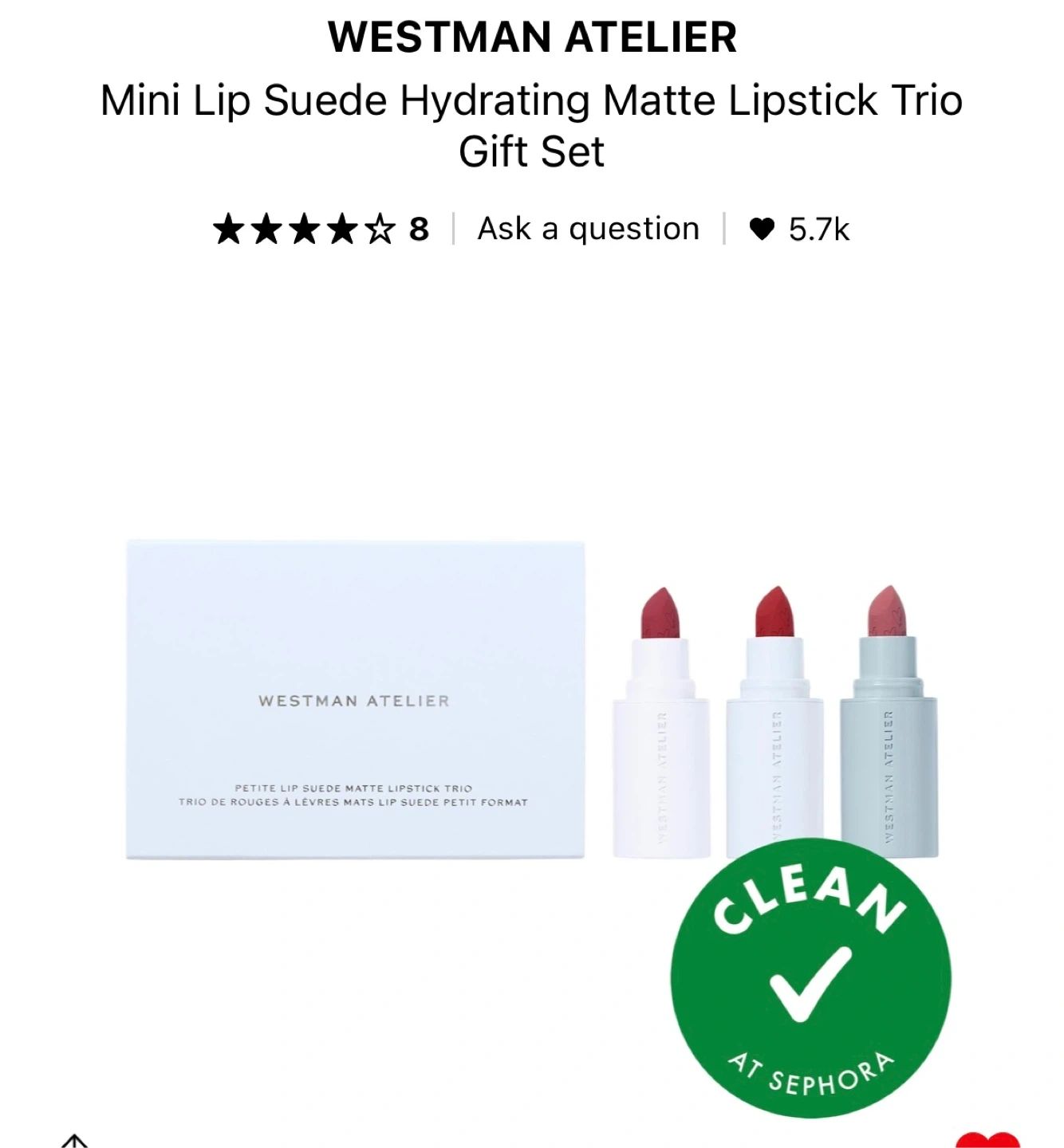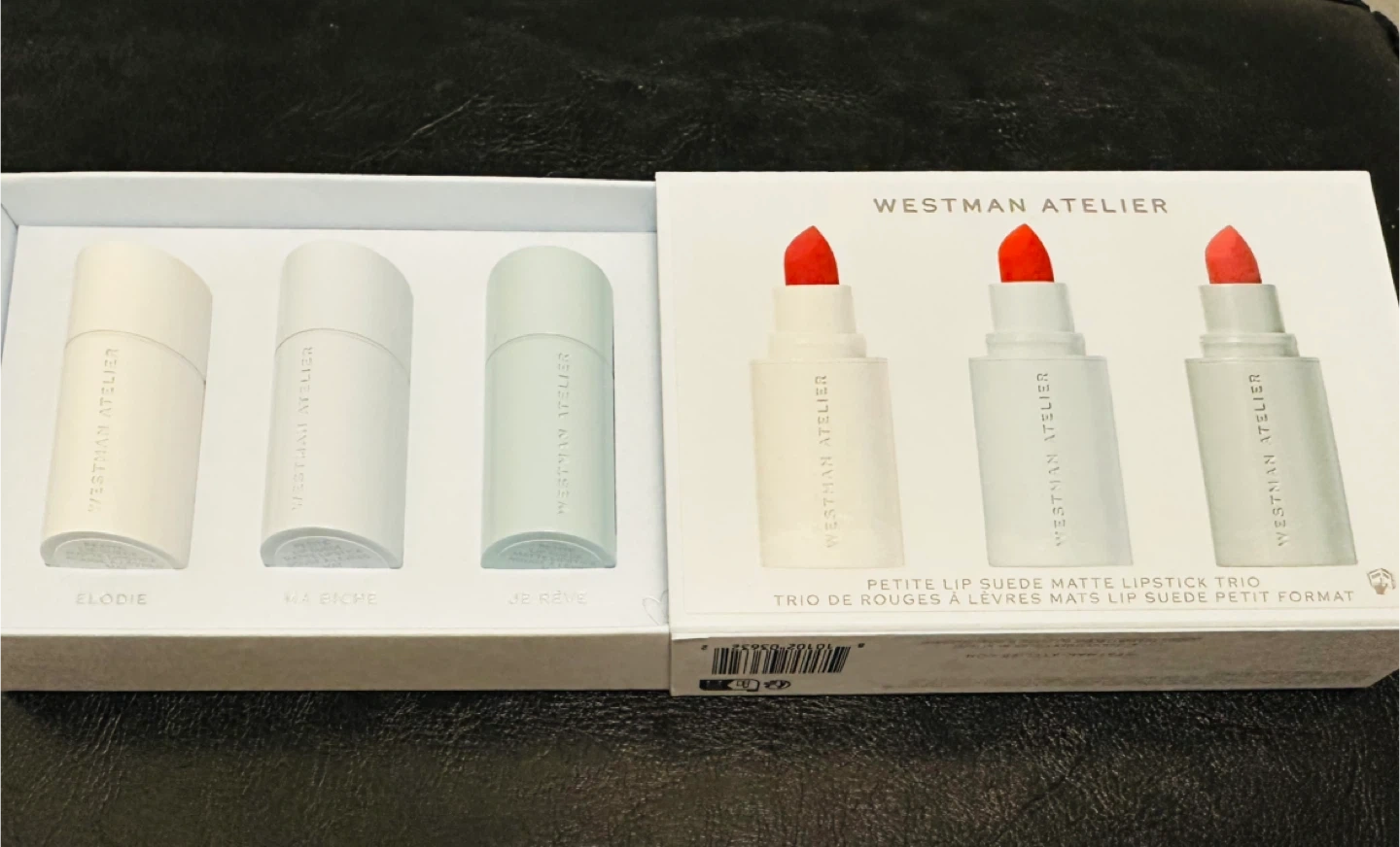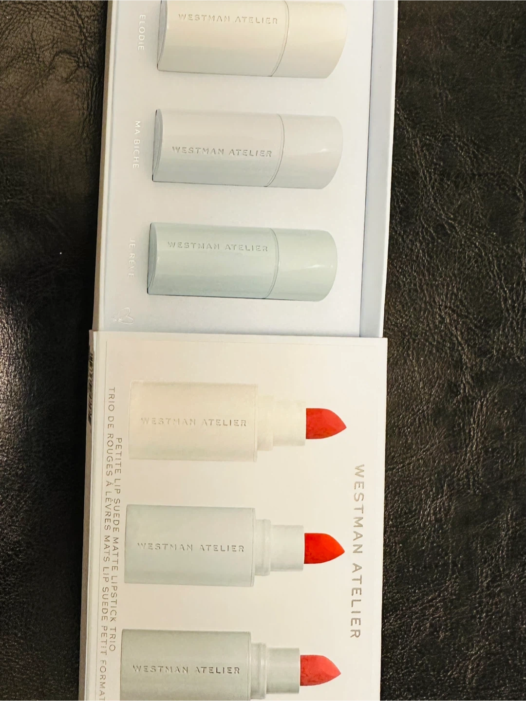 Selling a Westman Atelier Mini Lip Suede Hydrating Matte Lipstick Trio Gift Set. The set includes three beautiful shades: Ma Biche (Spanish Red), Elodie (Mauve Berry), and Je Rêve (Blush Nude). Perfect for creating a variety of looks!