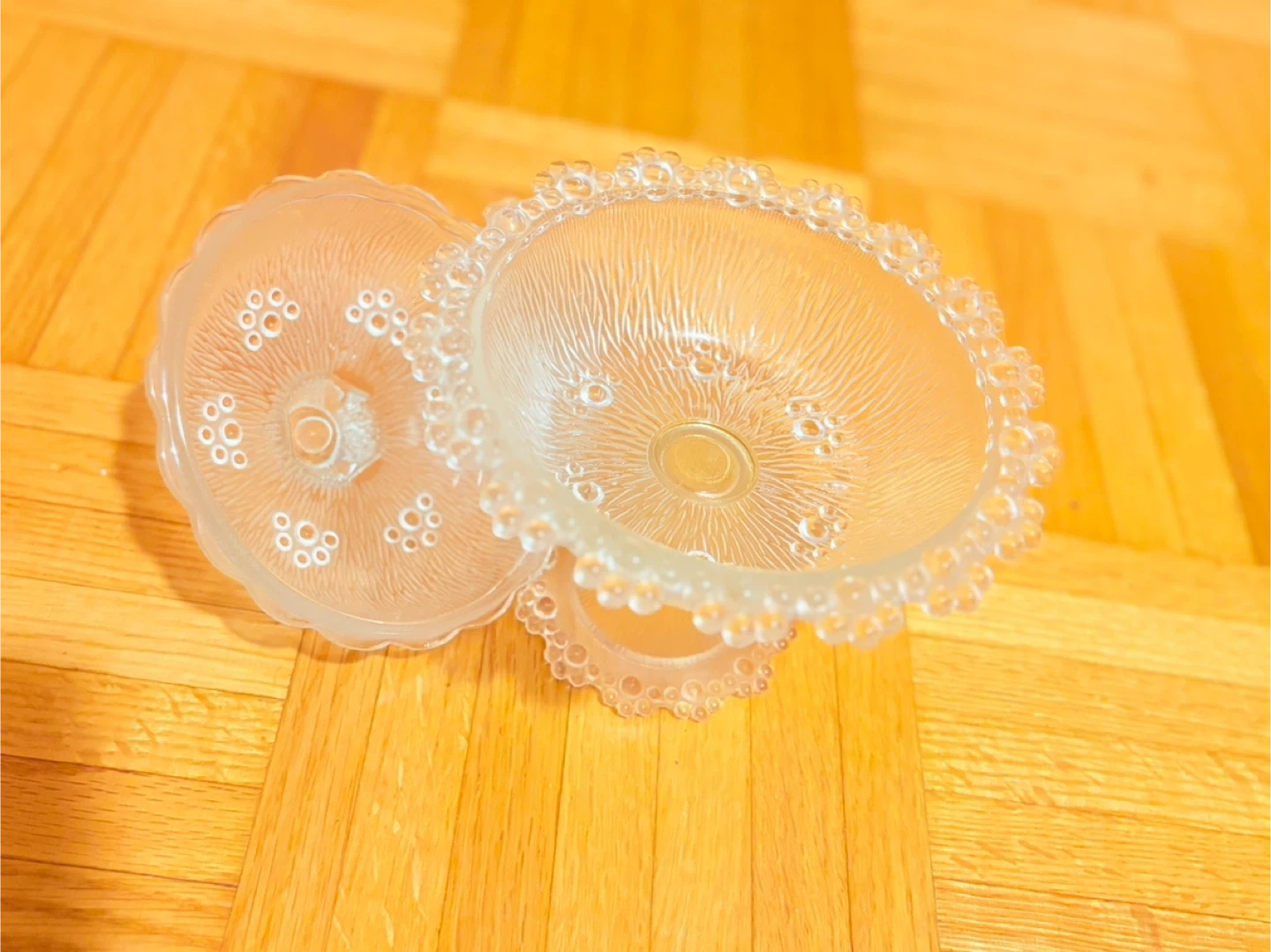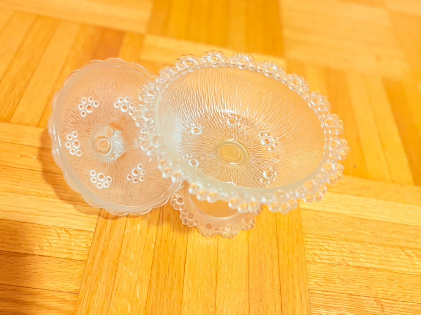 Selling a clear glass pedestal candy dish with a lid. It's in great shape and would look lovely on a table or counter. Perfect for candies, small treats, or even little trinkets!