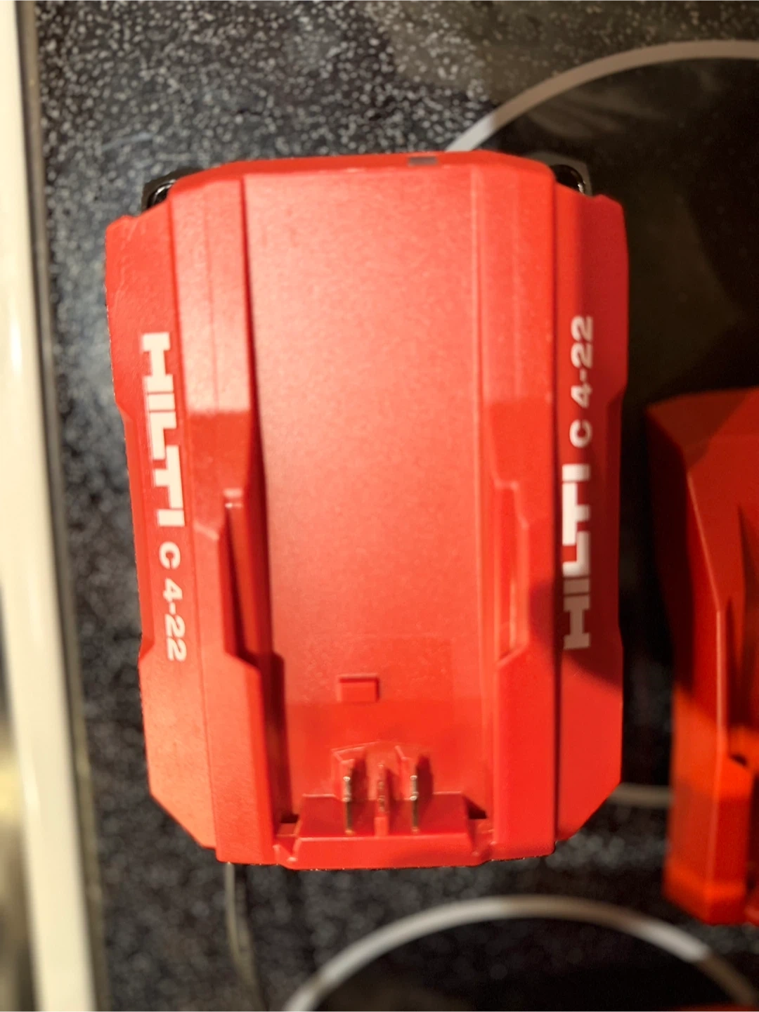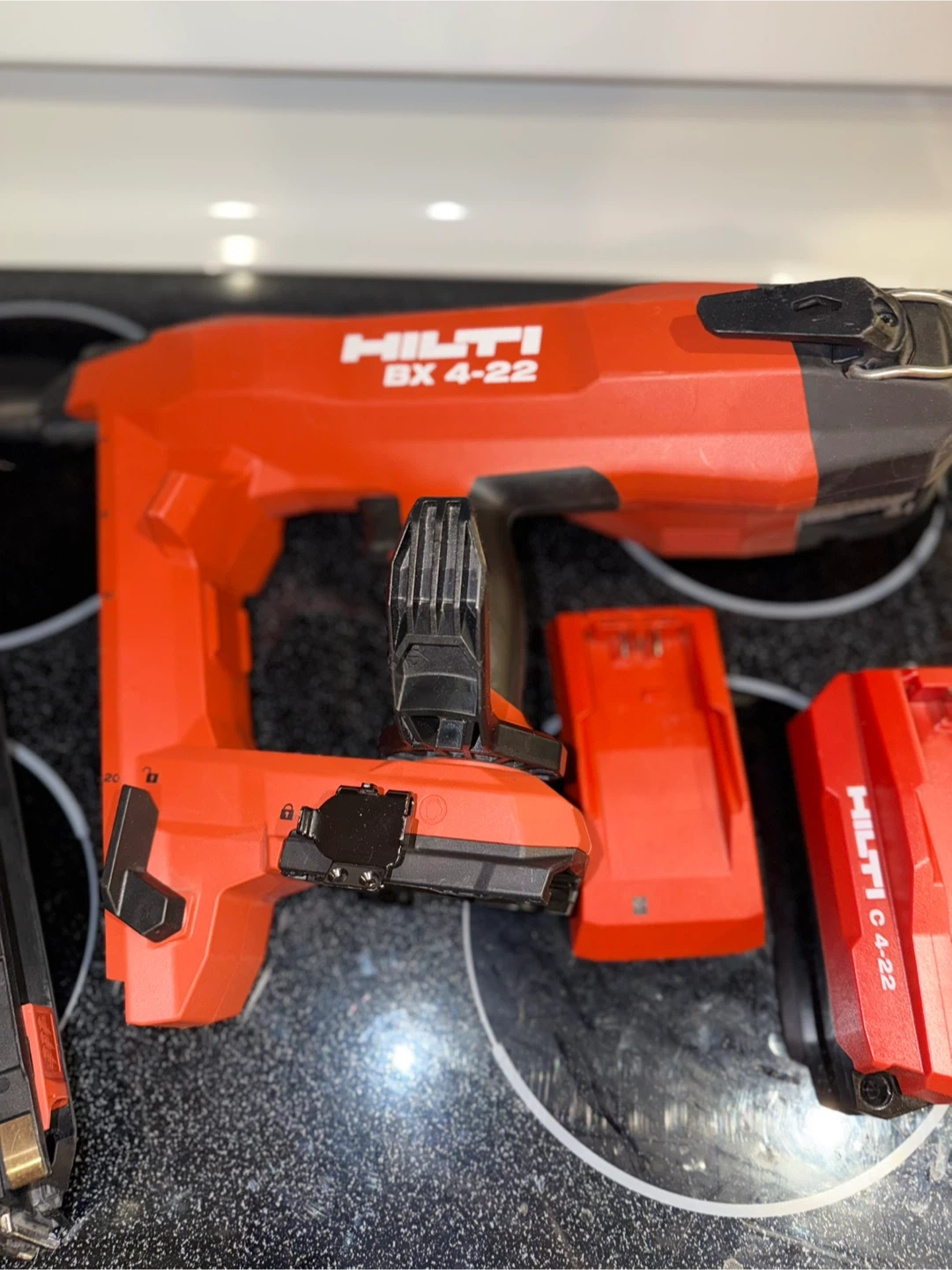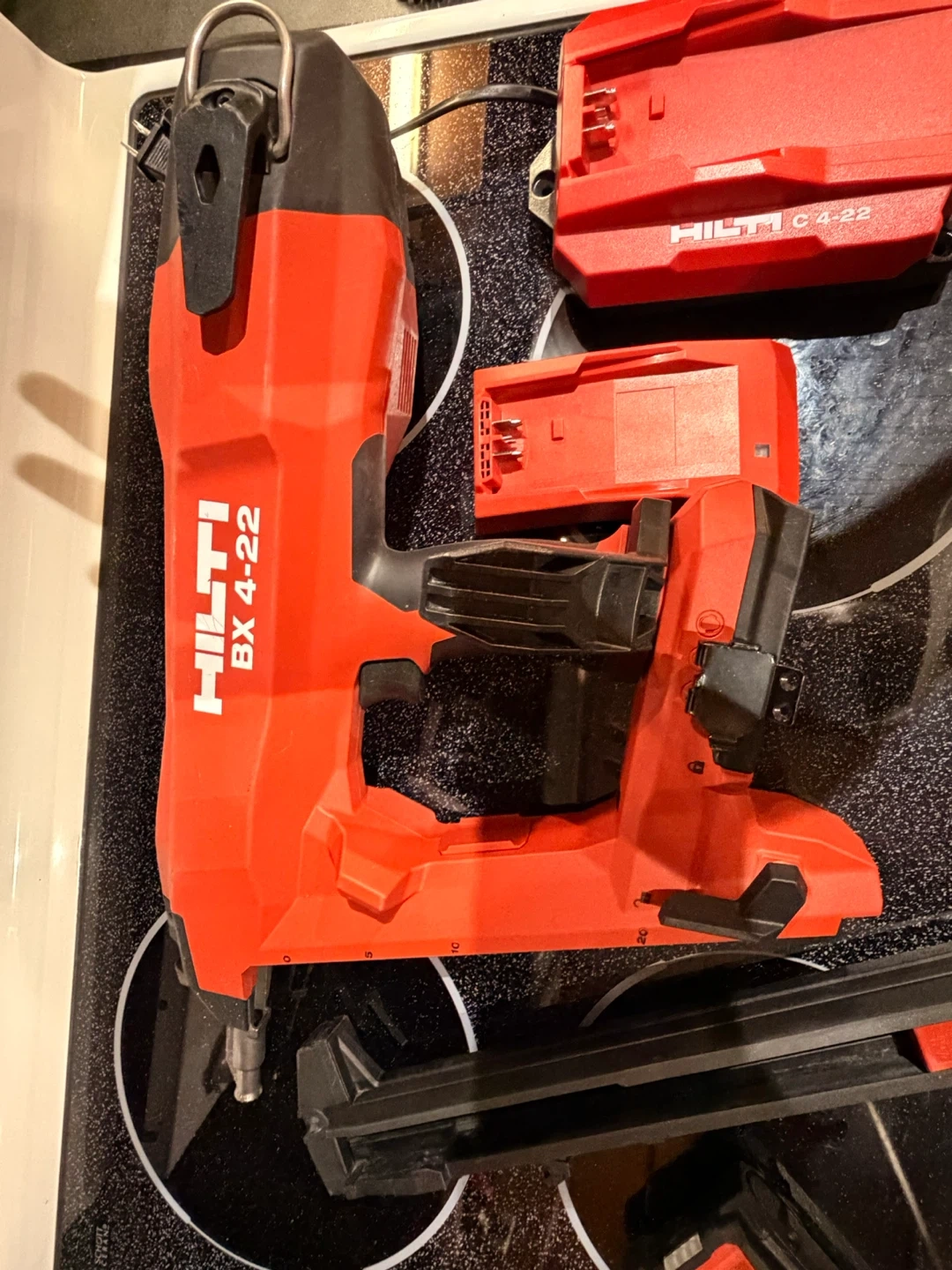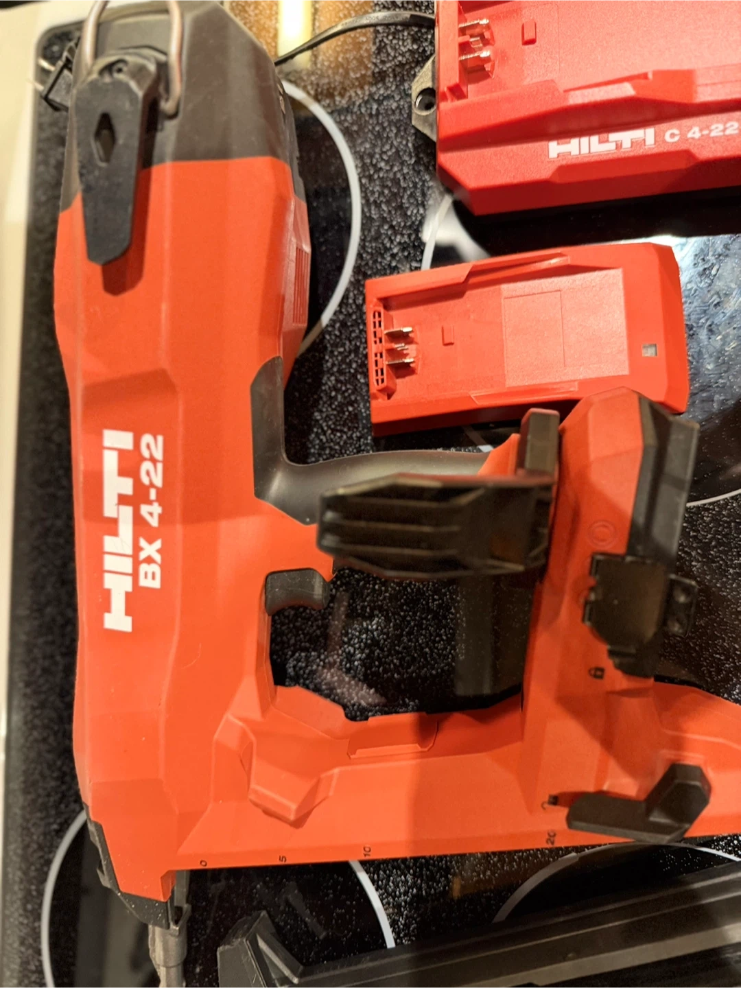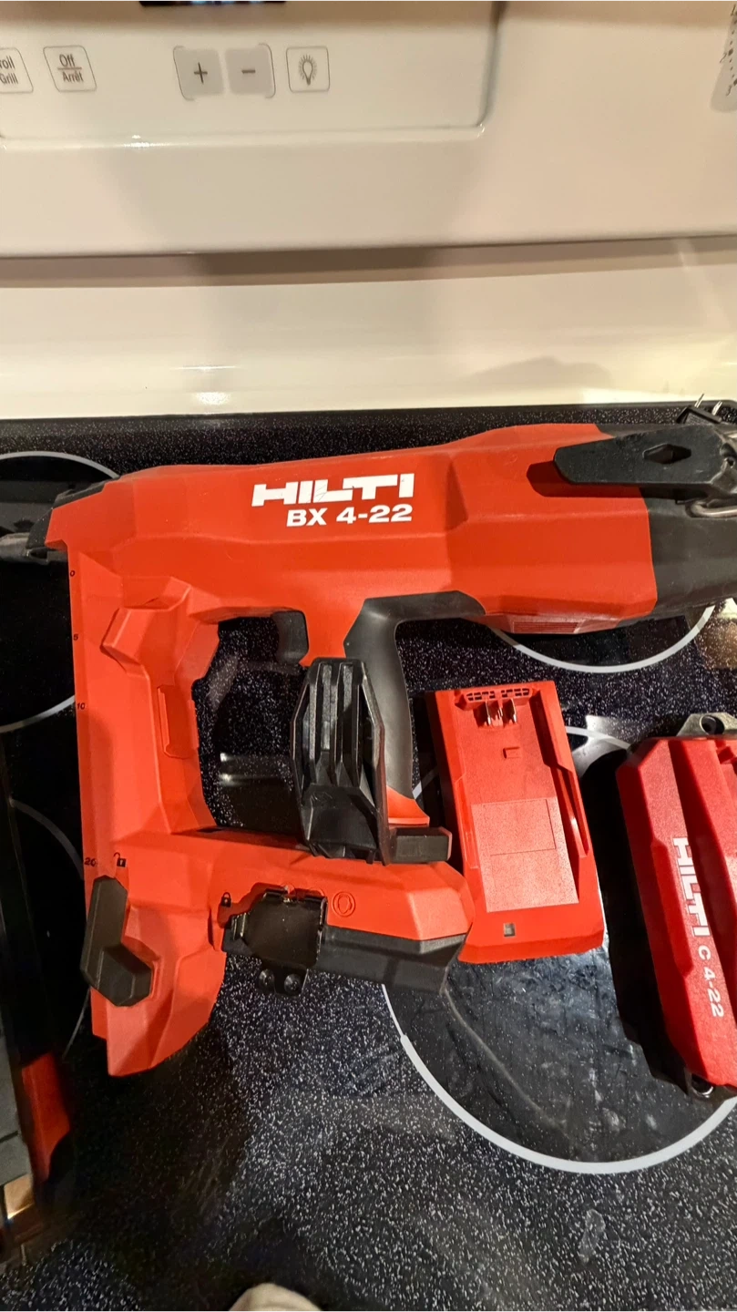 This is a Hilti BX 4-22 cordless concrete nailer. It comes with a battery and a charger. It's a powerful tool for construction jobs.