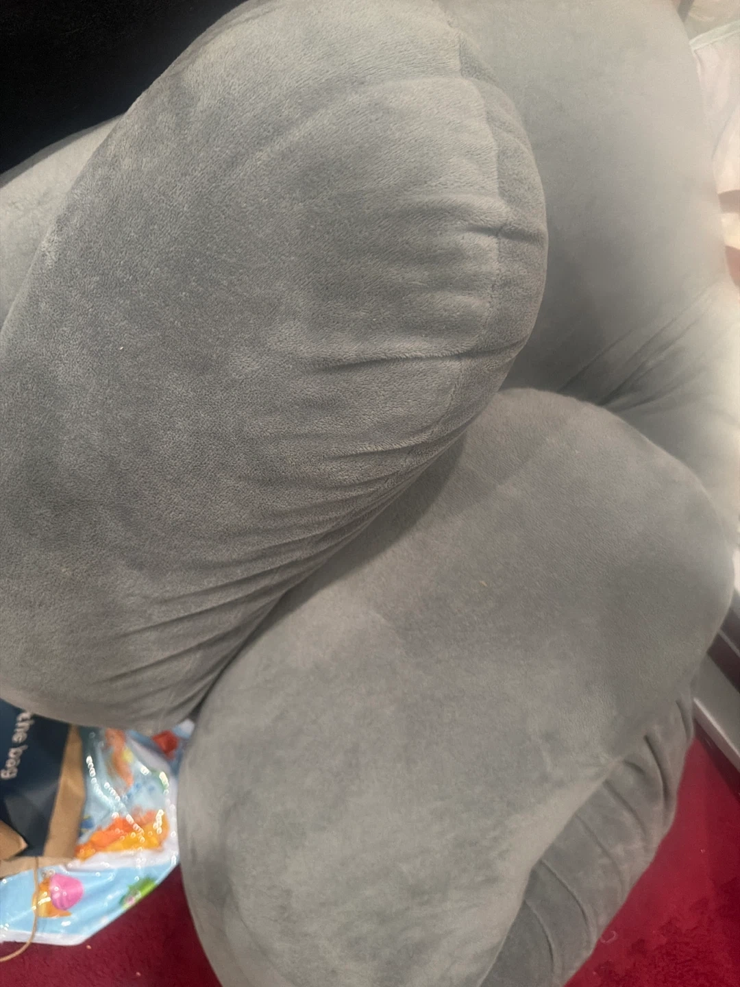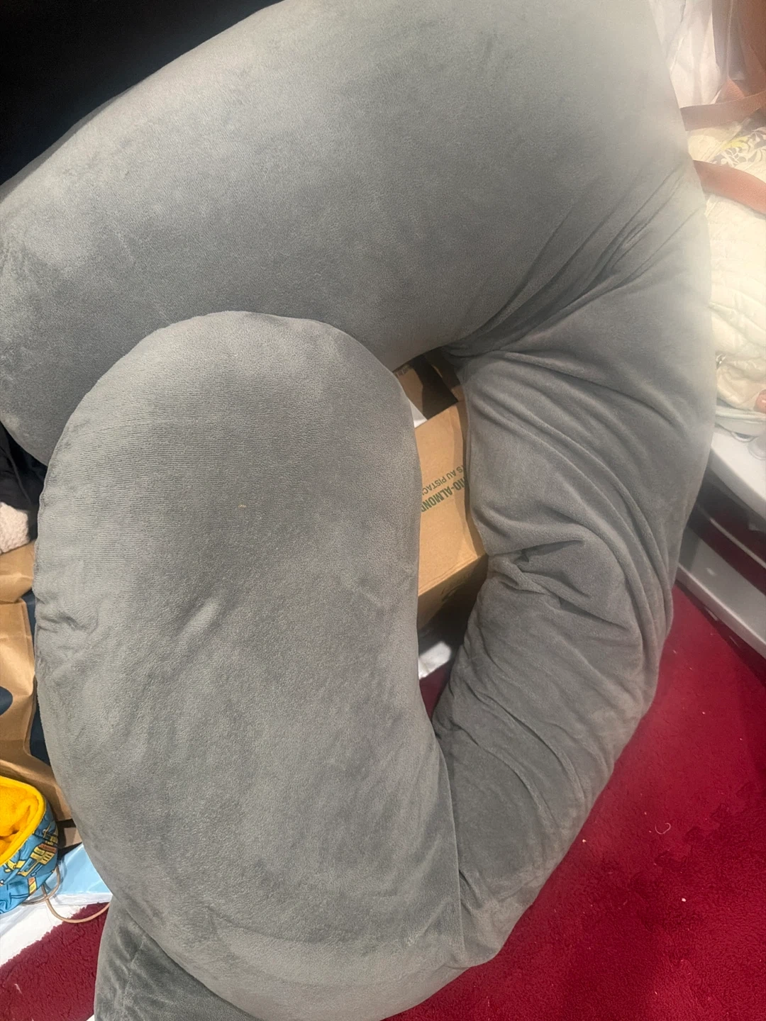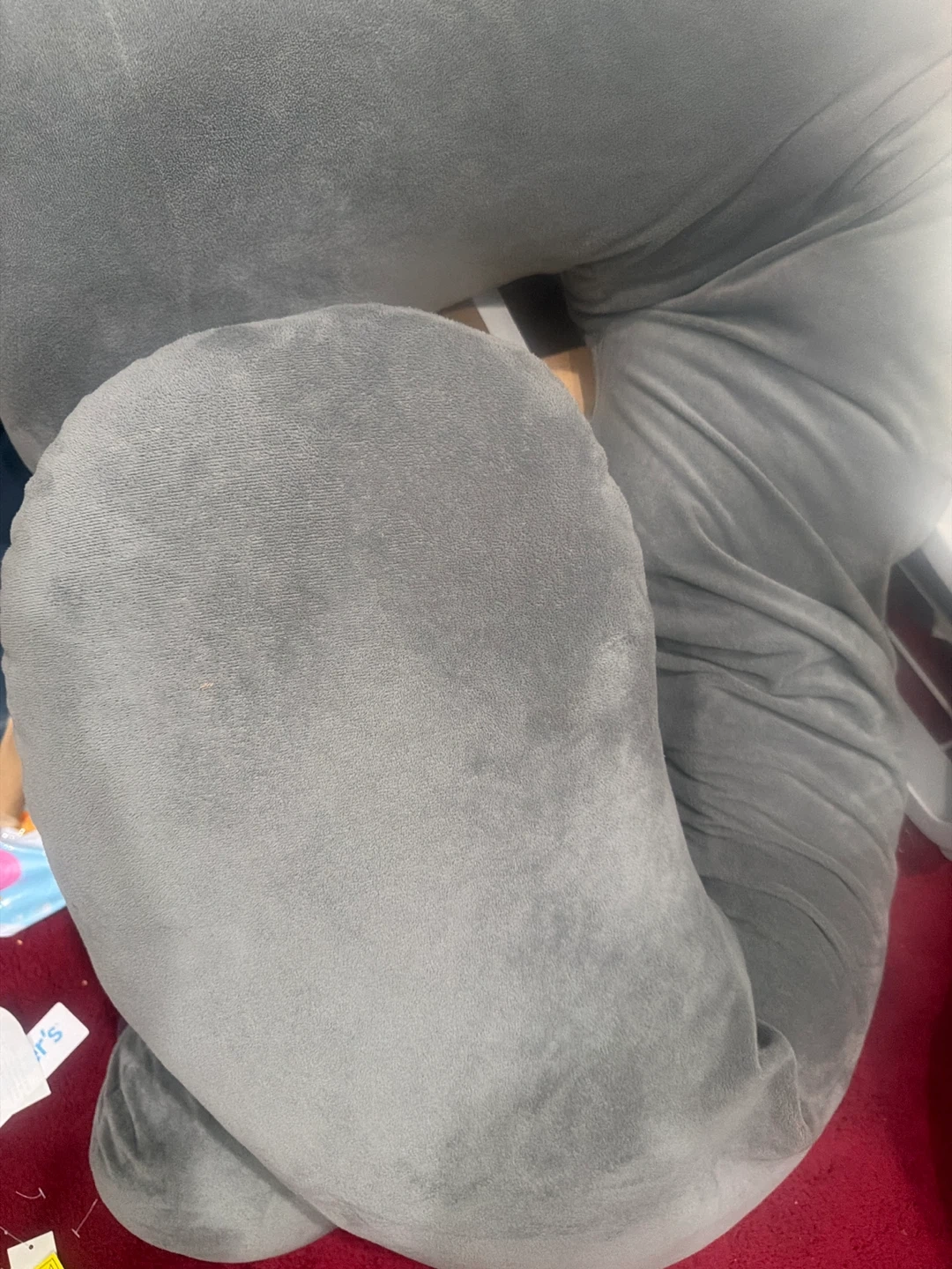 This is a plush pregnancy pillow in a soft gray color. Its shape offers full body support during the pregnancy and even after pregnancy while nursing.