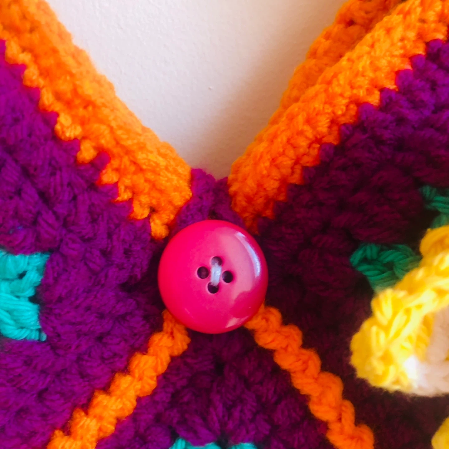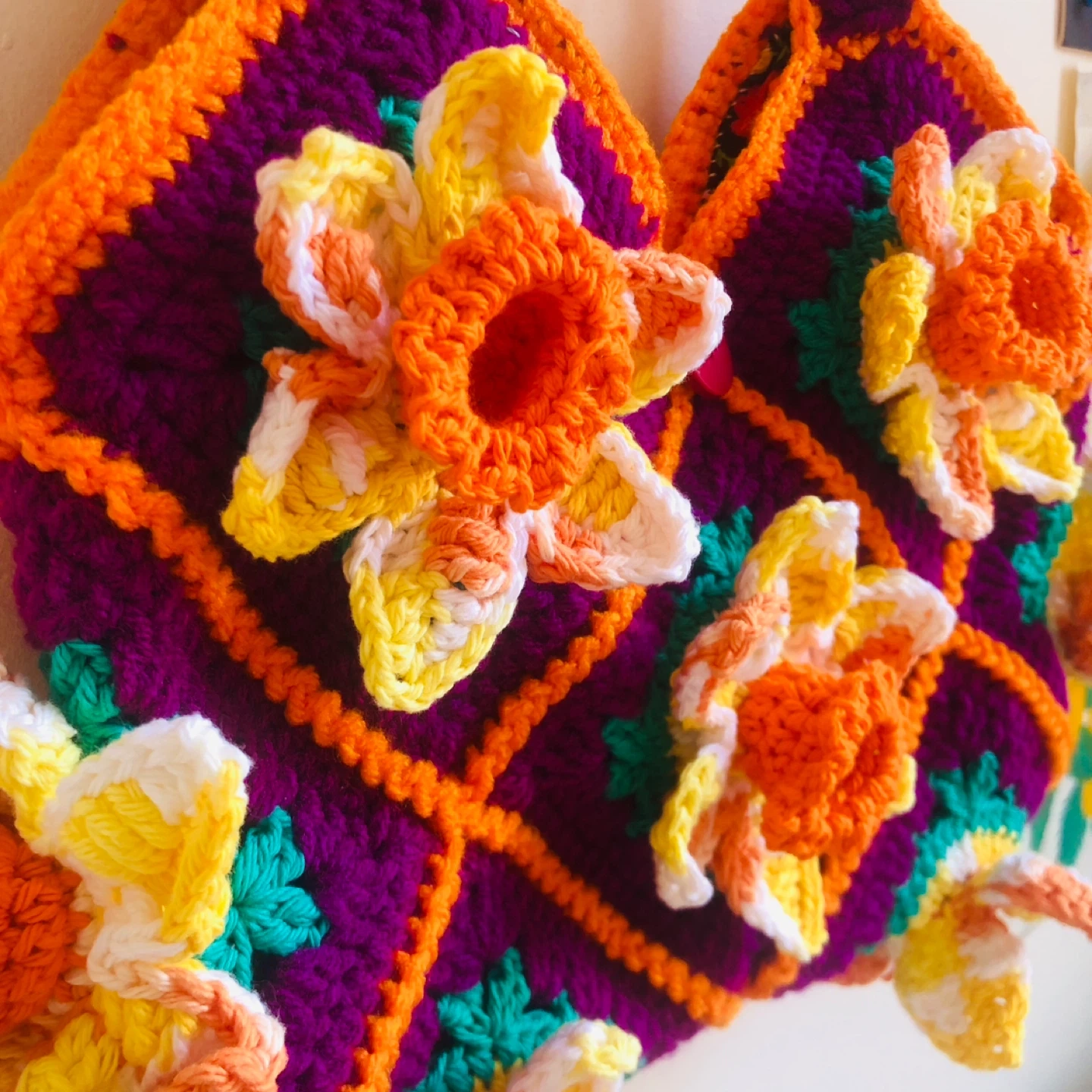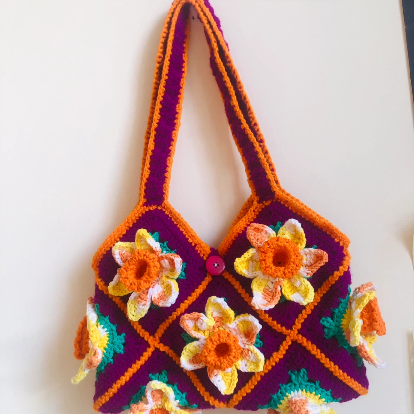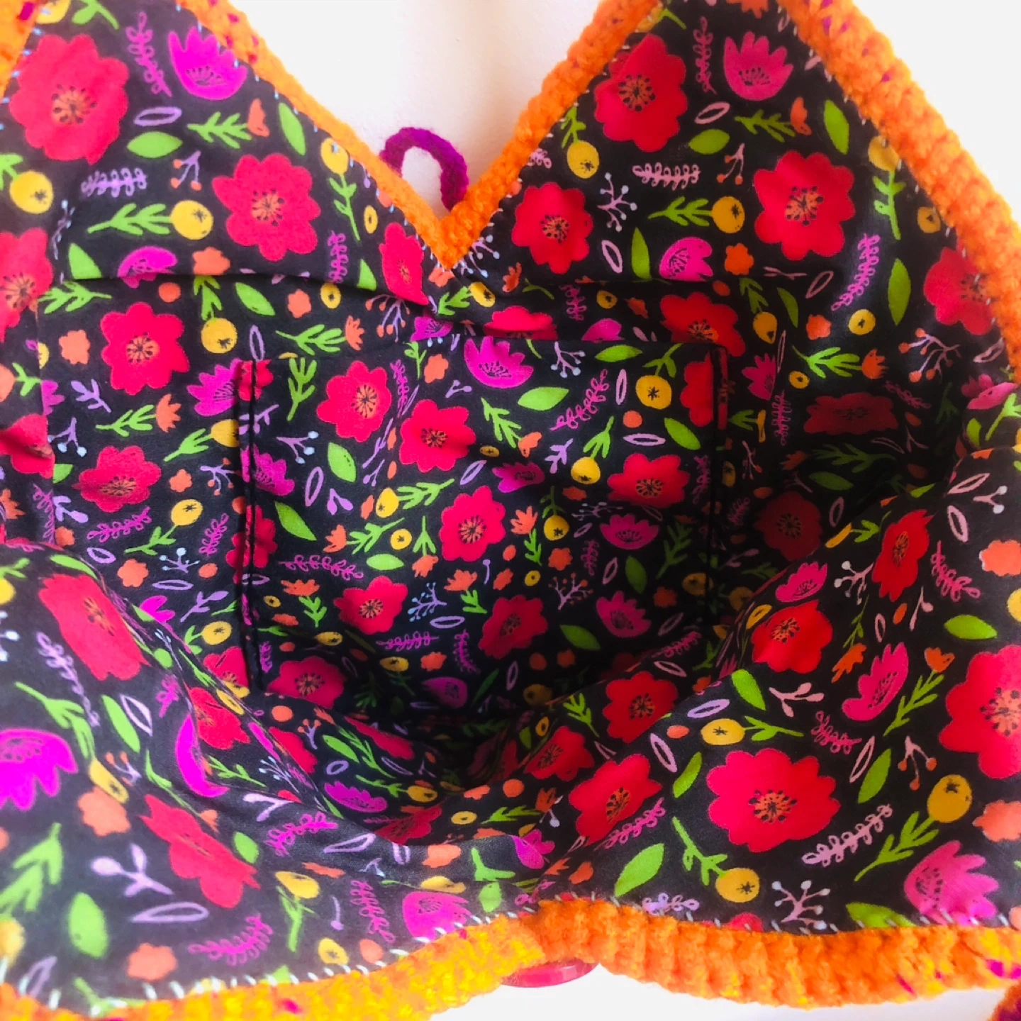 This handmade crocheted handbag features a vibrant patchwork design with colorful floral appliques. It's lined with a fun floral fabric. A single pink button fastens the top.