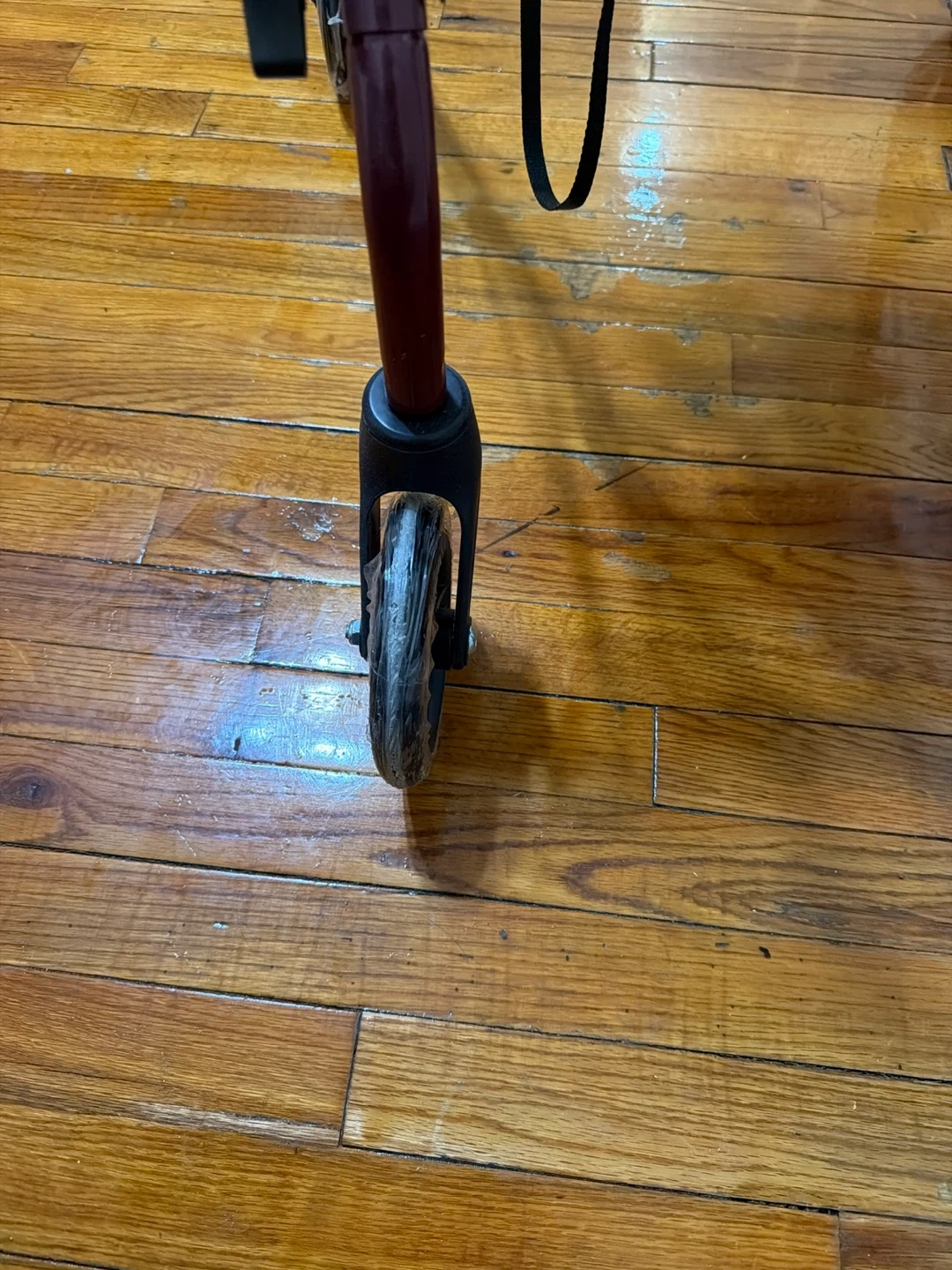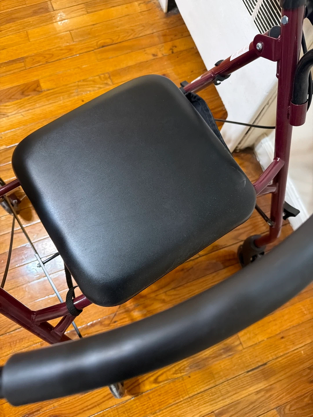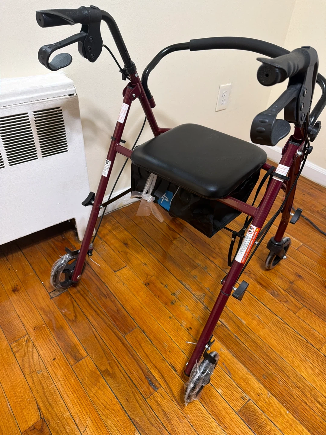 This 4-wheel walker features a built-in seat for resting. It includes a storage bag underneath the seat. The walker has adjustable handles and hand brakes for safety. It's a sturdy option for mobility assistance.