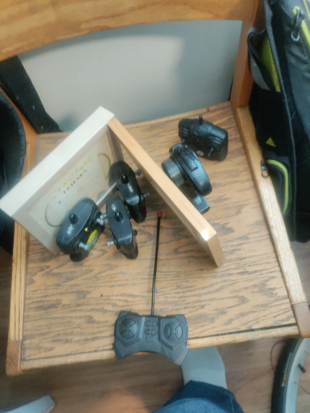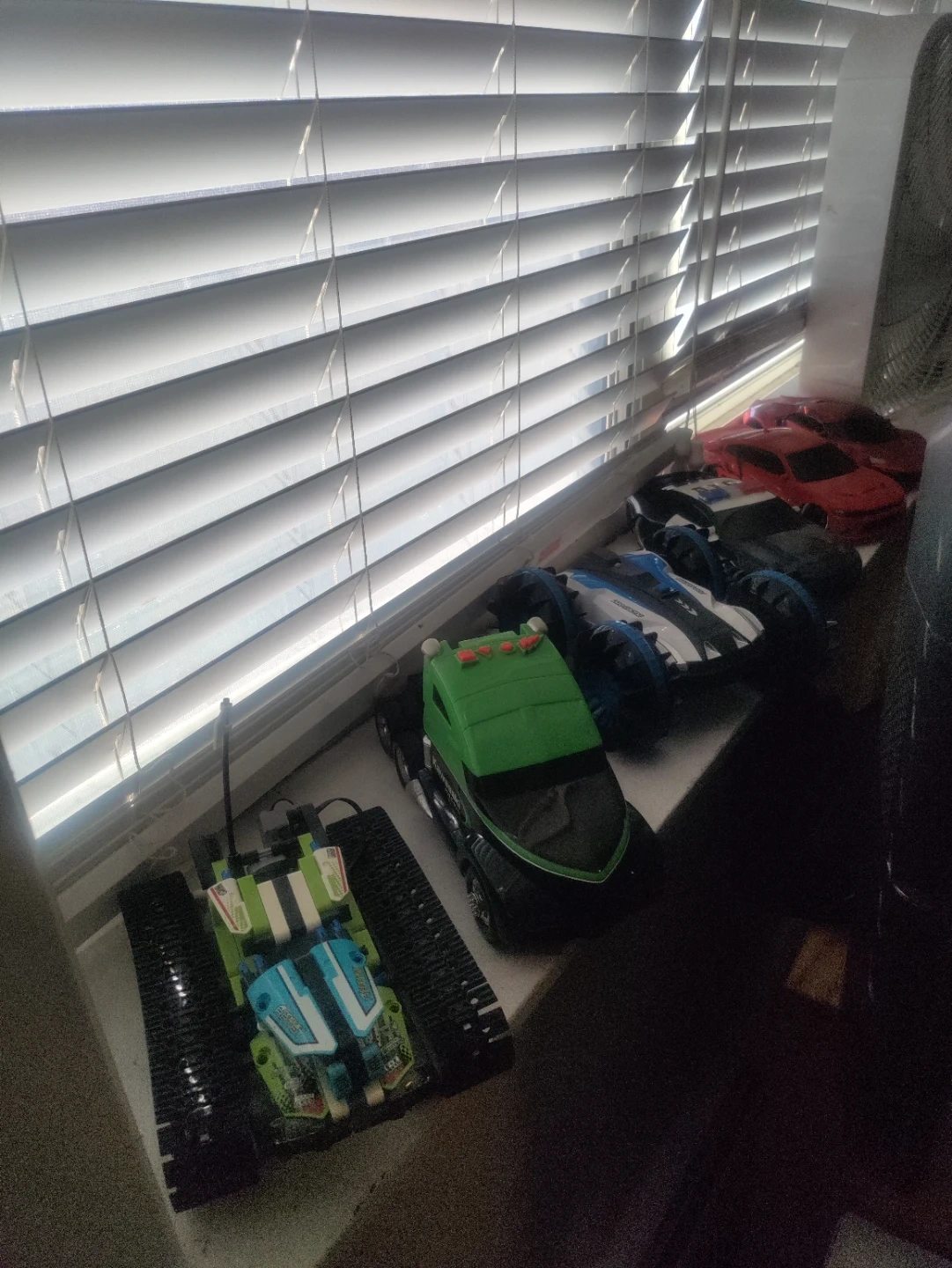 Collection of toy vehicles including monster trucks, race cars, and a remote-controlled tank. Some are Hot Wheels. Great for imaginative play!