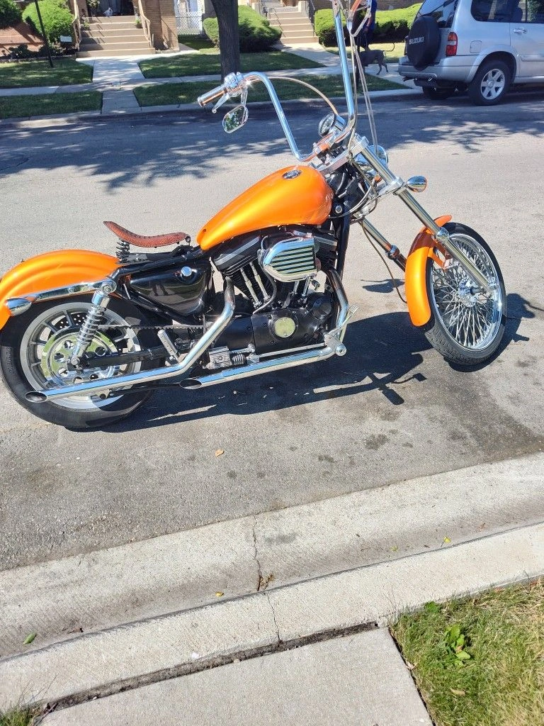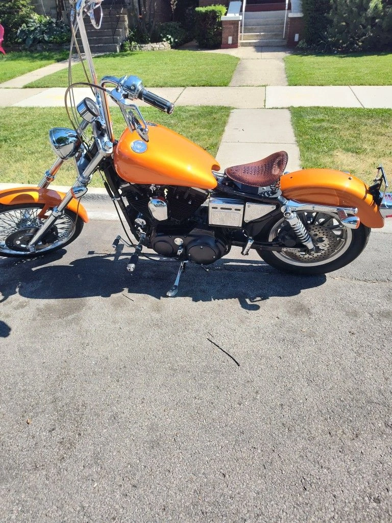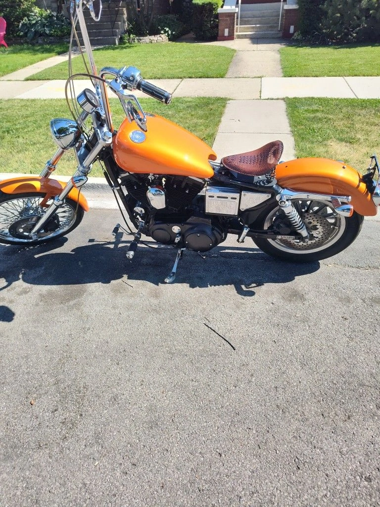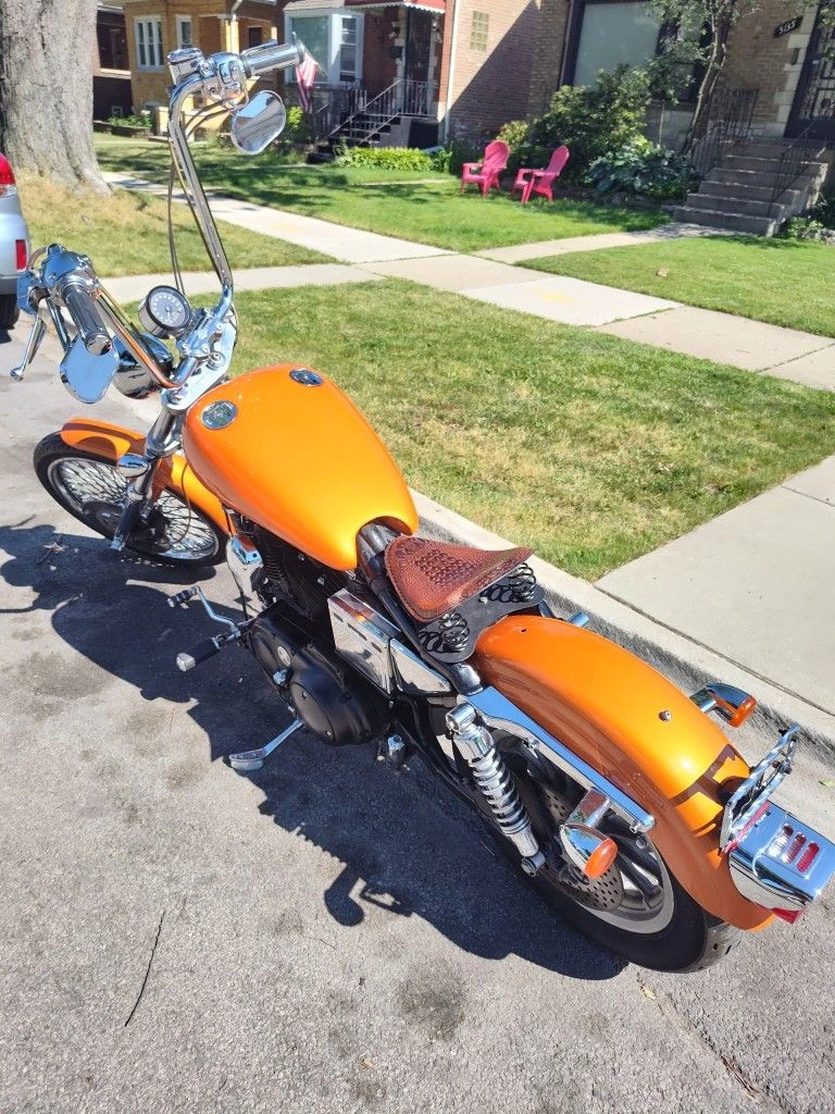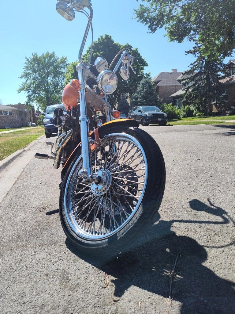 Just took her out to wash her up and tune her up, so the carb is clean and the bike is running great. Engine was rebuilt 1000 miles ago and runs like brand new. Features DynaTek 2000i-P single fire performance ignition, solo alligator seat with springs, stretched tank with custom Sunrise Orange paint, and re-geared for higher speeds (75mph highway). Extended wide-glide front end by Machine + Design with a 21" front twisted spoke wheel and 16" ape hangers with chrome controls. Includes saddlebags, 2-up seat, sissy bar with backrest, windshield (all hardware pictured), and a trickle charger for the battery. Let me know if you're interested!