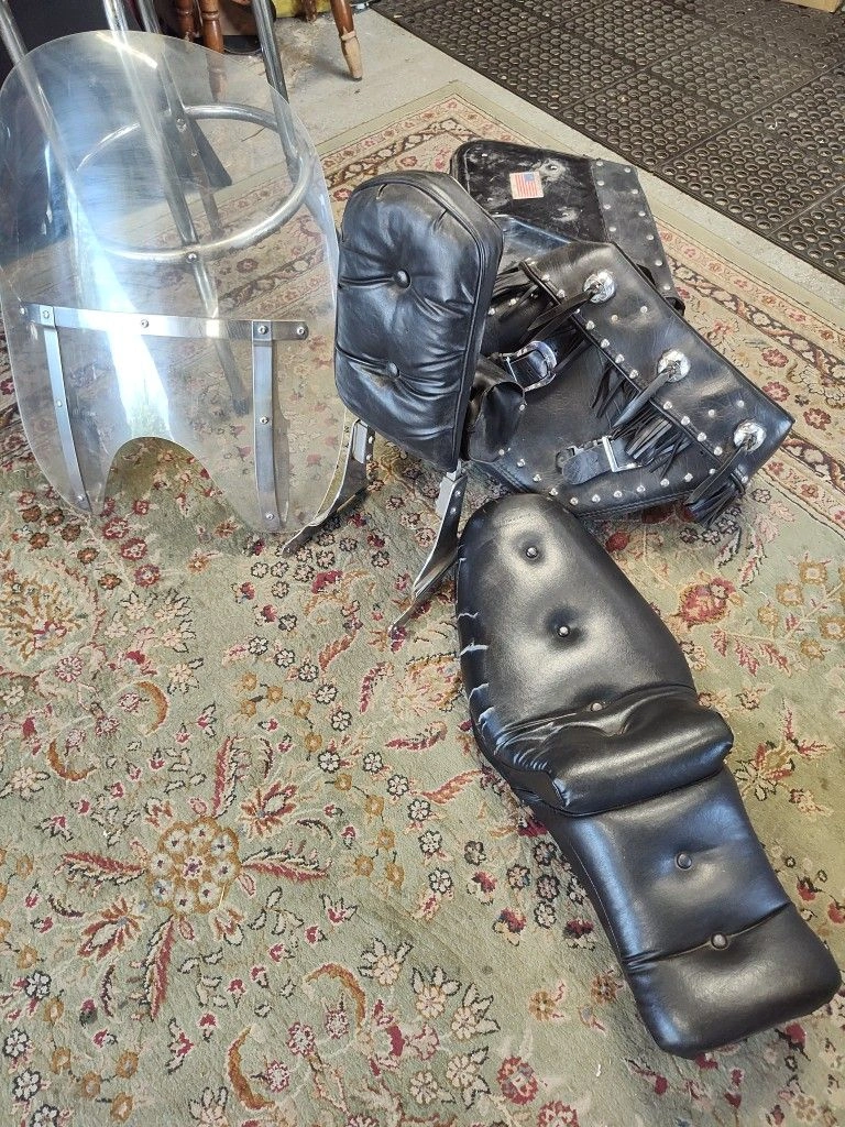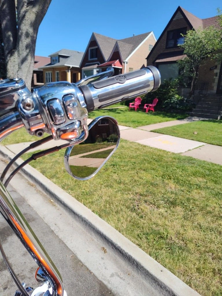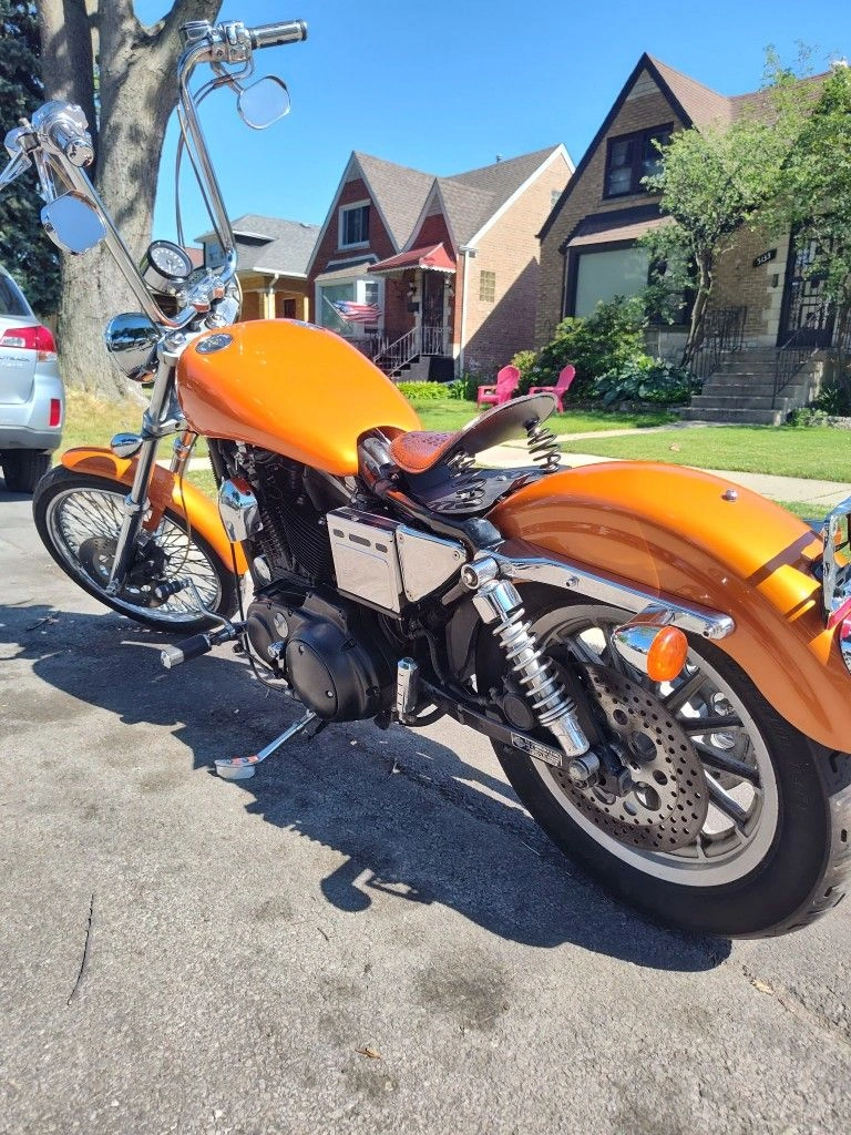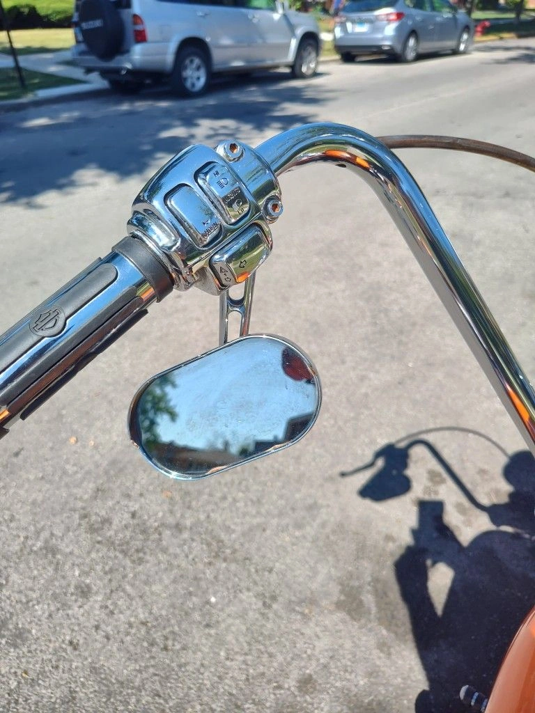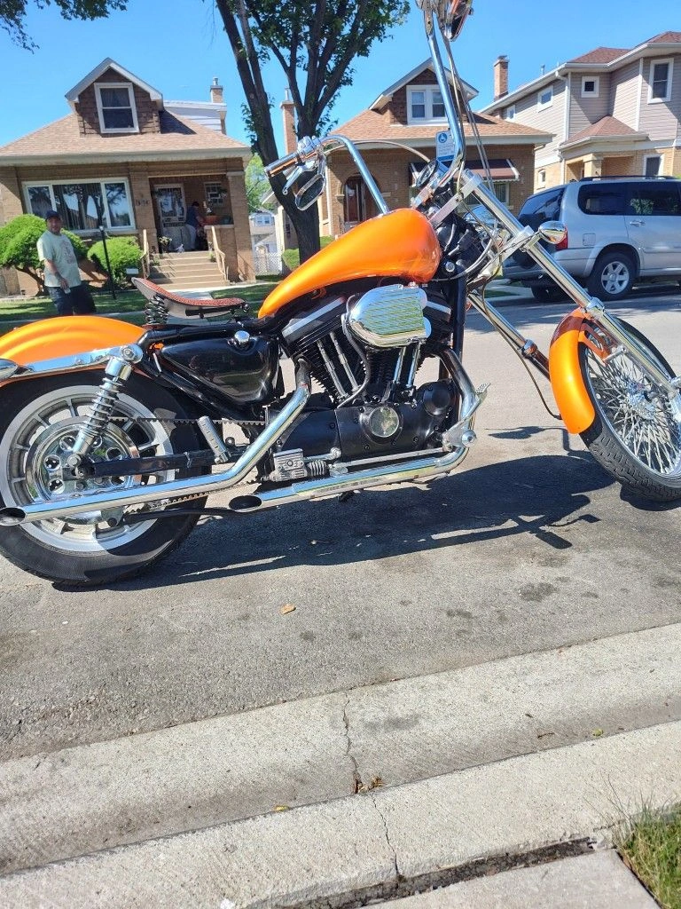 Just took her out to wash her up and tune her up, so the carb is clean and the bike is running great. Engine was rebuilt 1000 miles ago and runs like brand new. Features DynaTek 2000i-P single fire performance ignition, solo alligator seat with springs, stretched tank with custom Sunrise Orange paint, and re-geared for higher speeds (75mph highway). Extended wide-glide front end by Machine + Design with a 21" front twisted spoke wheel and 16" ape hangers with chrome controls. Includes saddlebags, 2-up seat, sissy bar with backrest, windshield (all hardware pictured), and a trickle charger for the battery. Let me know if you're interested!