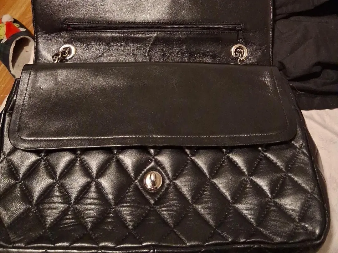 Classic black quilted leather flap shoulder bag. Features a silver chain strap and turn-lock closure. Interior is lined in red leather with multiple compartments. Made in France.