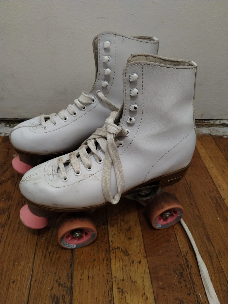 White roller skates with pink wheels. Lace up with a velcro strap. Used condition. They are extremely good quality, with strong support and expensive brand as well. Size 8 in women.