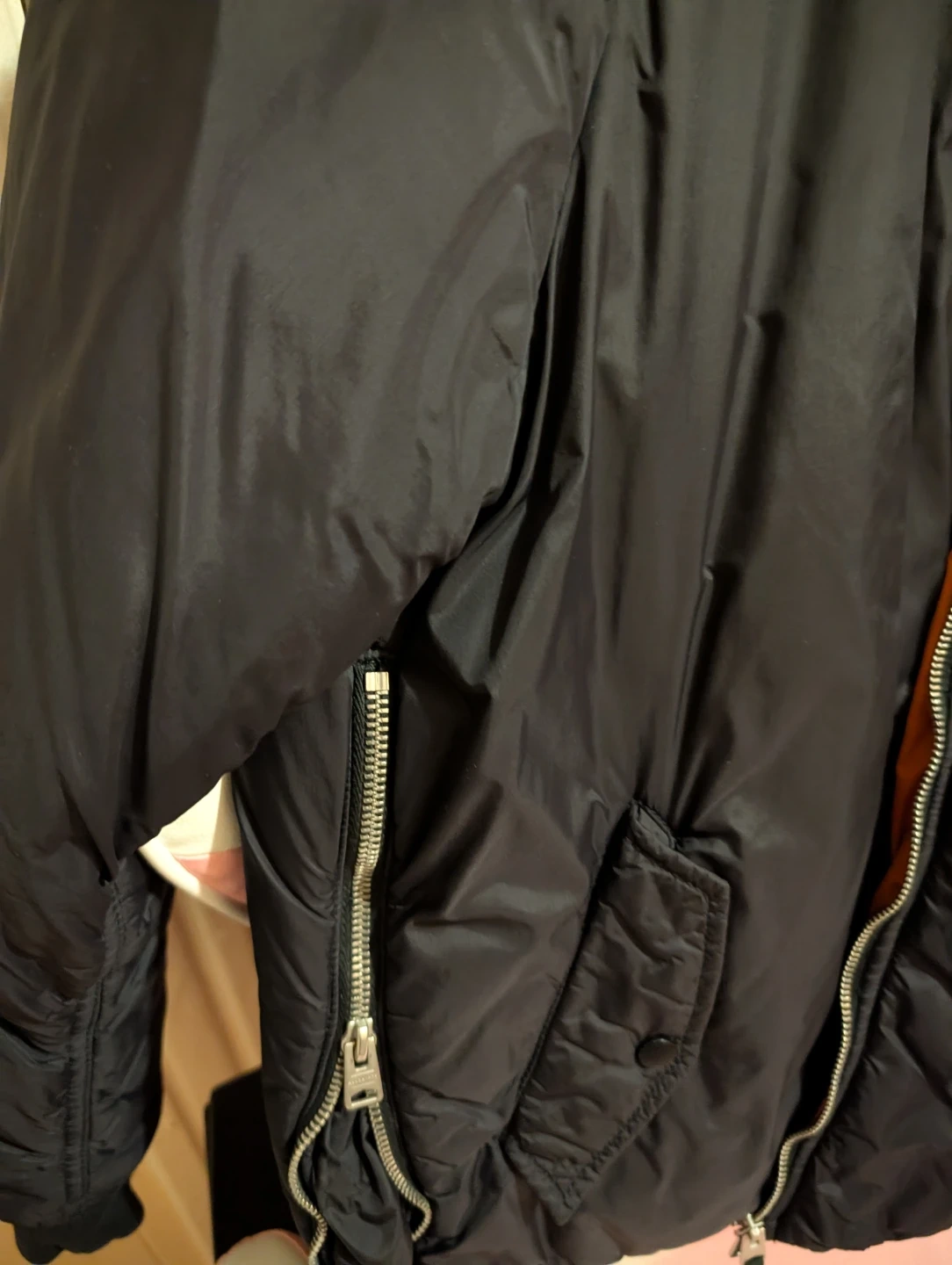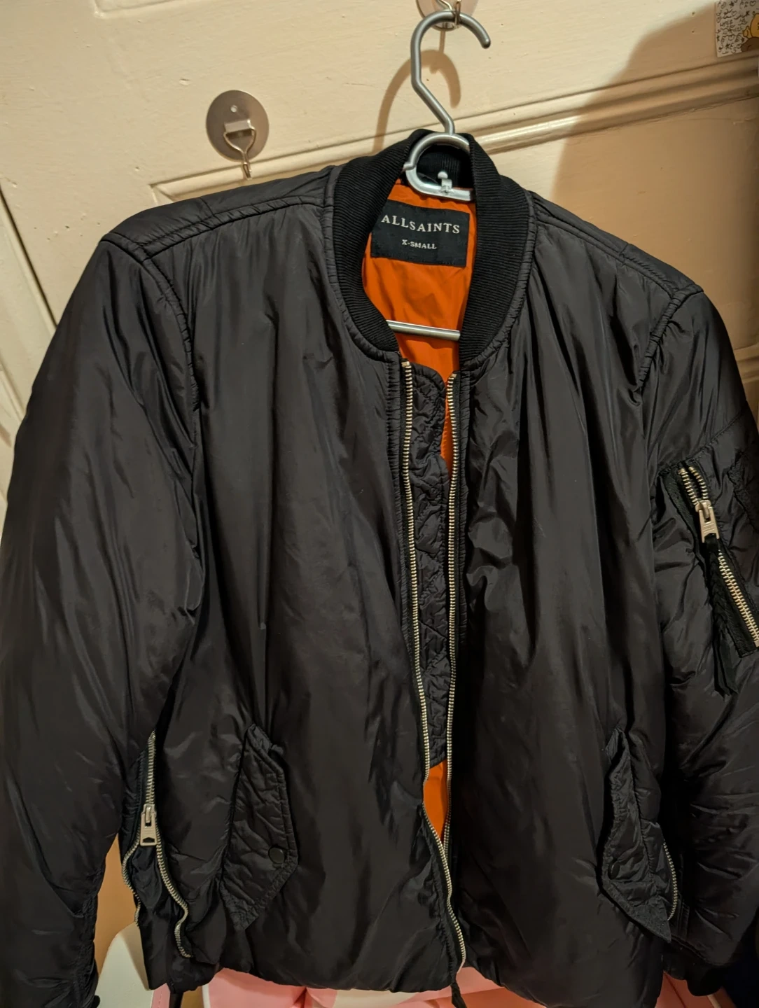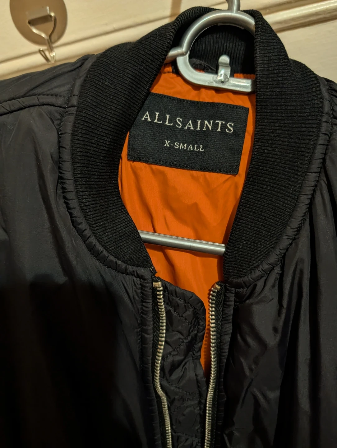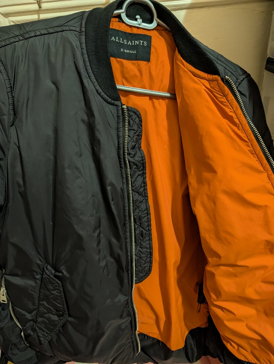 ALLSAINTS bomber jacket in black with a bright orange lining. It's an X-small size. The jacket features zippered pockets and a quilted detail on the sleeves. It's a classic bomber style!