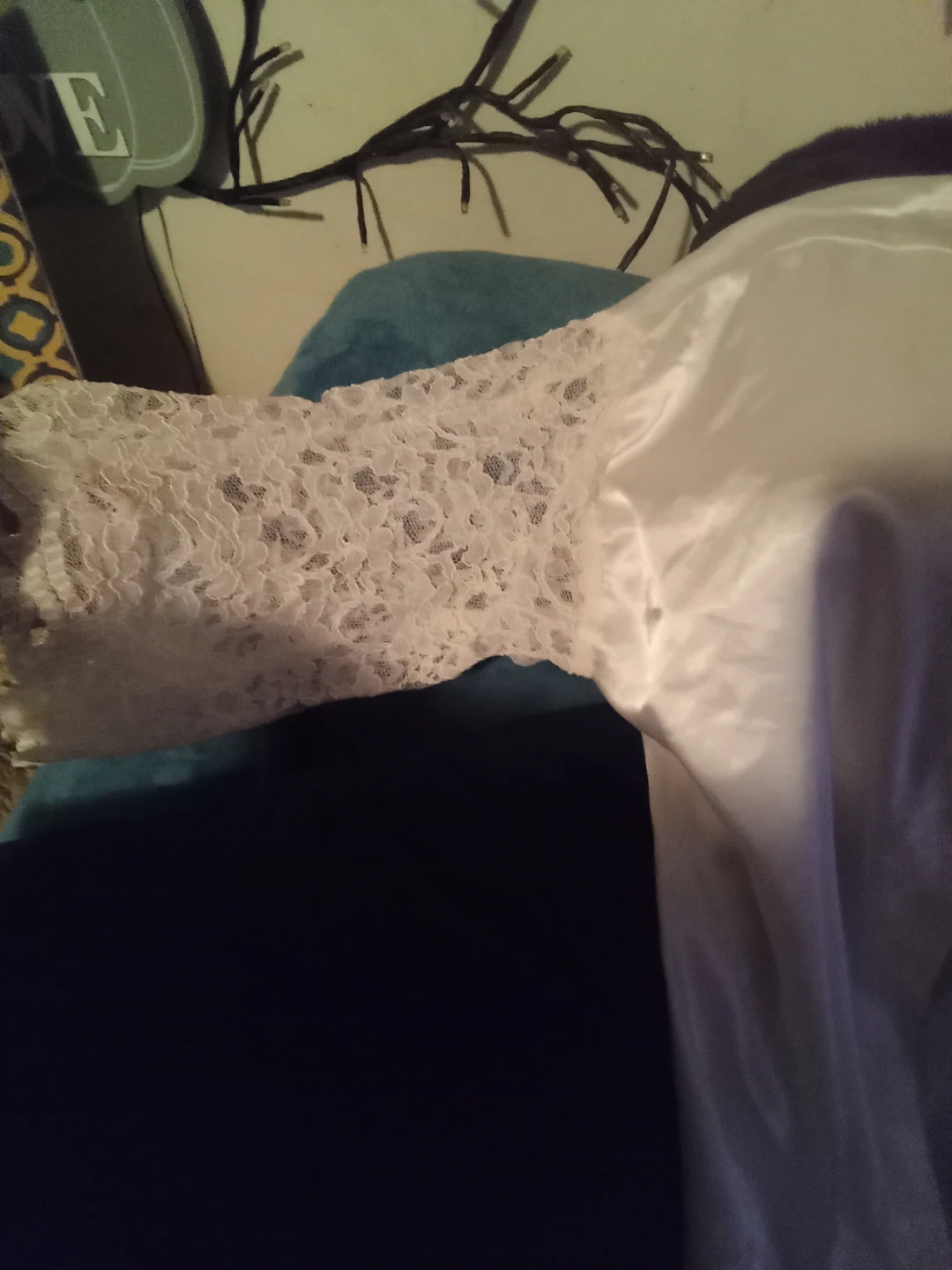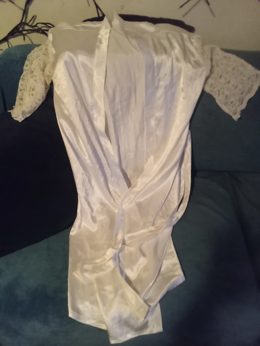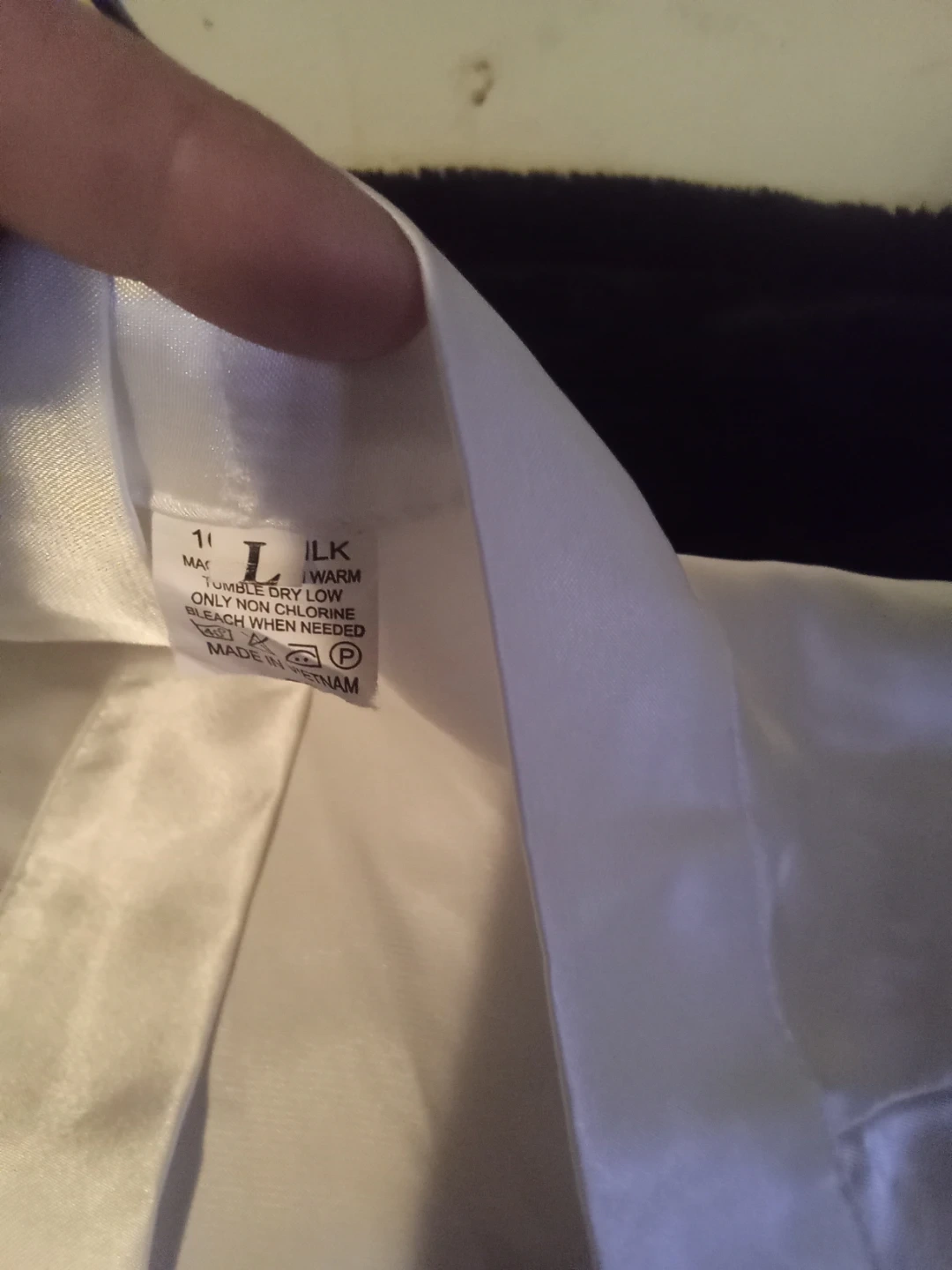 This white robe is made of 100% silk. It features lace detailing on the sleeves. Size is large. Made in Vietnam. Never worn. Picture don't do justice on how beautiful this silk robe is.