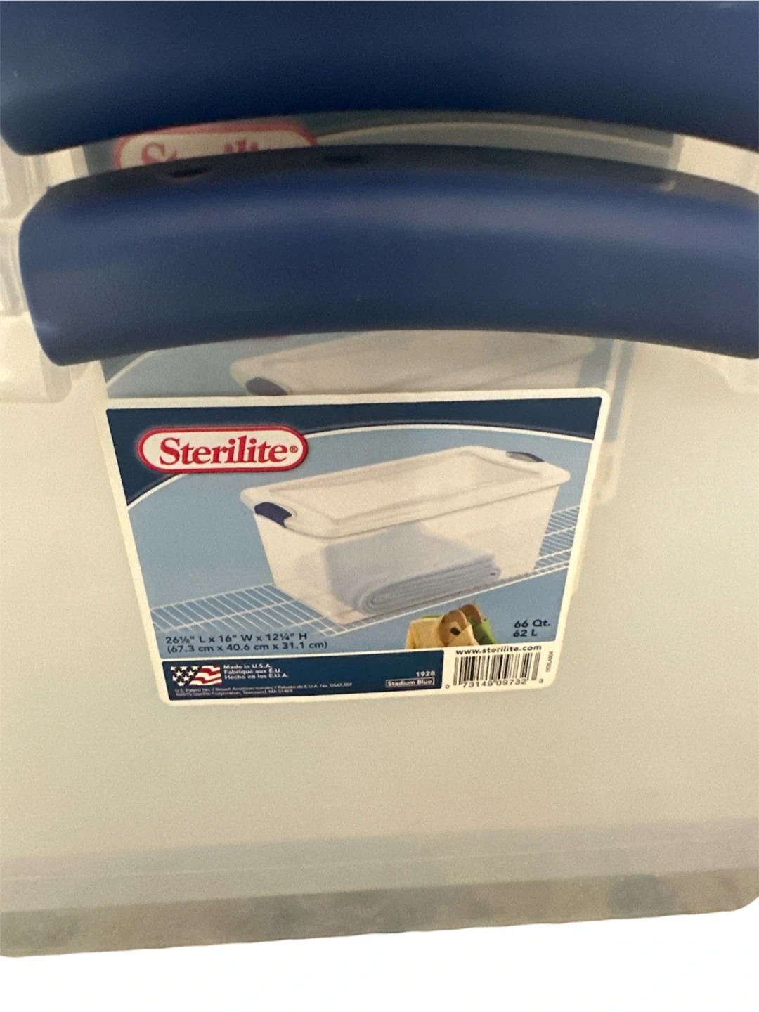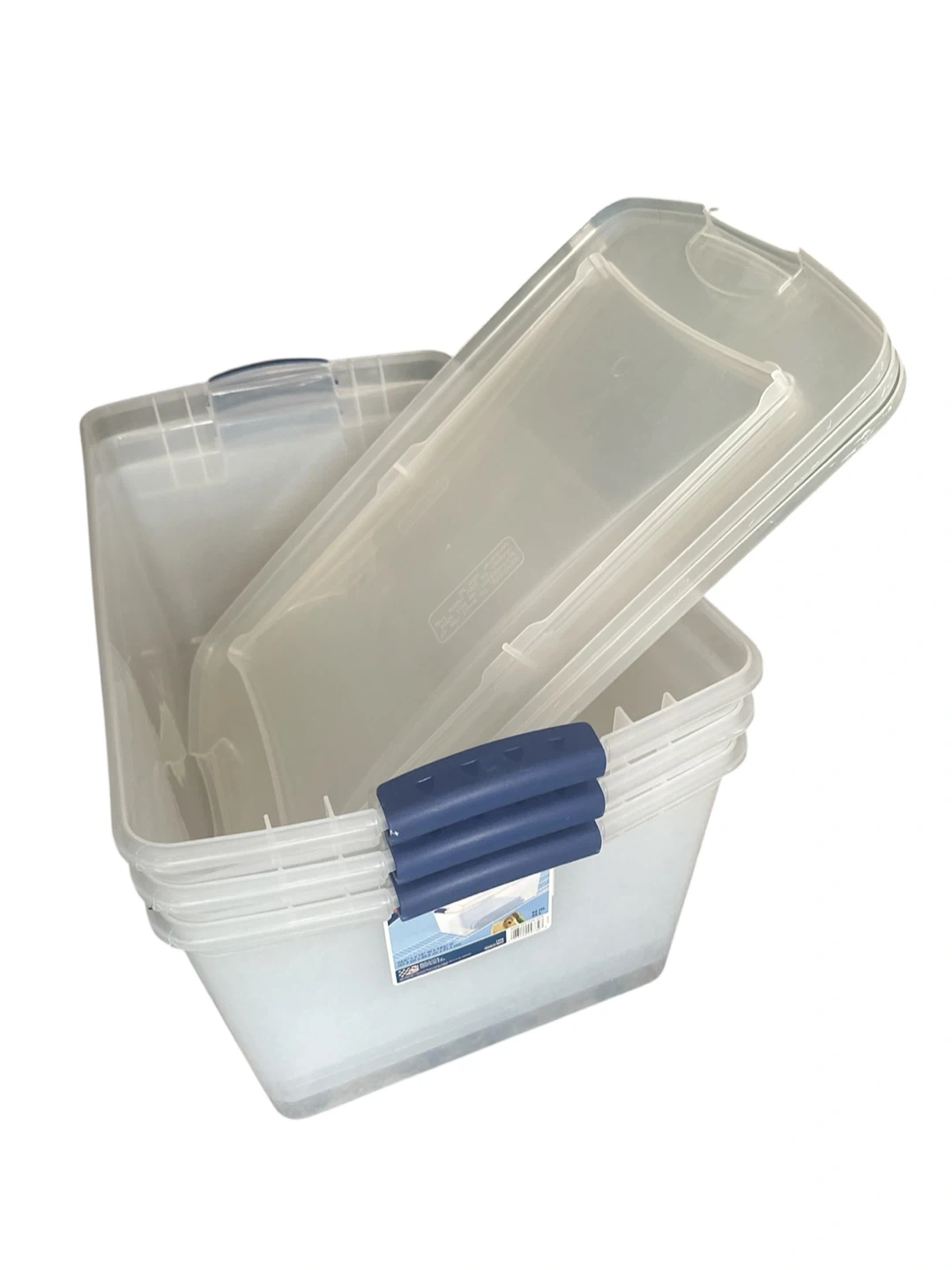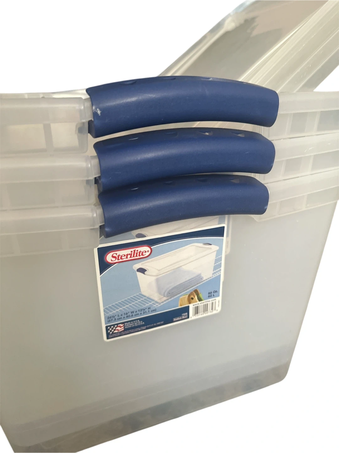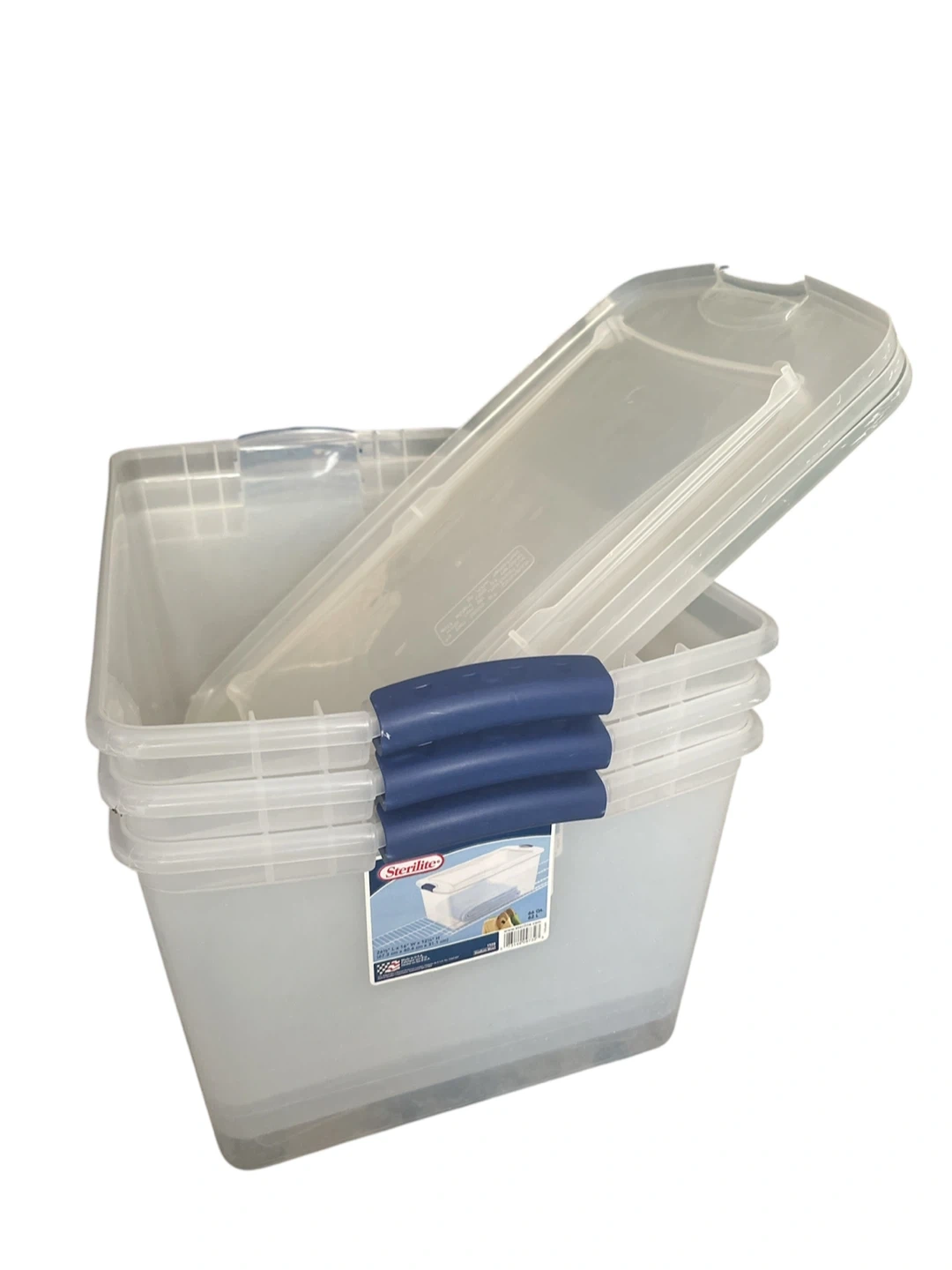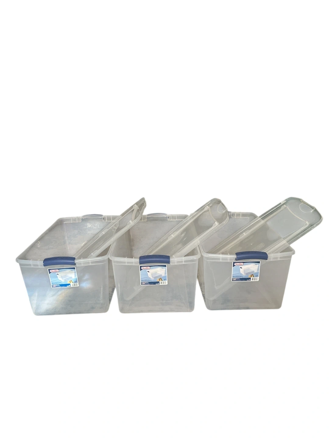This 3-pack of Sterilite storage totes comes with lids. Each tote measures 26 1/4" L x 16" W x 12 1/2" H. They are made of clear plastic with blue latches. Perfect for organizing. Cash only. Pickup only. #home #storage #organization #totebox