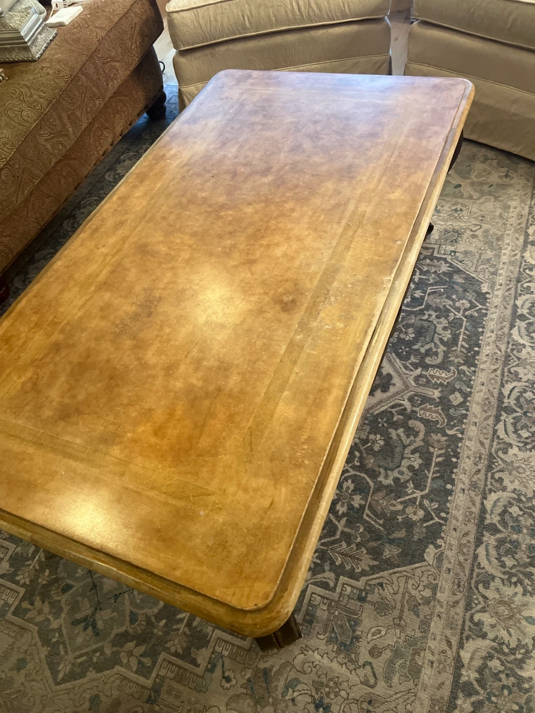 Selling a coffee table. It features a light brown stone top and decorative metal legs. Perfect for adding a touch of elegance to your living room!