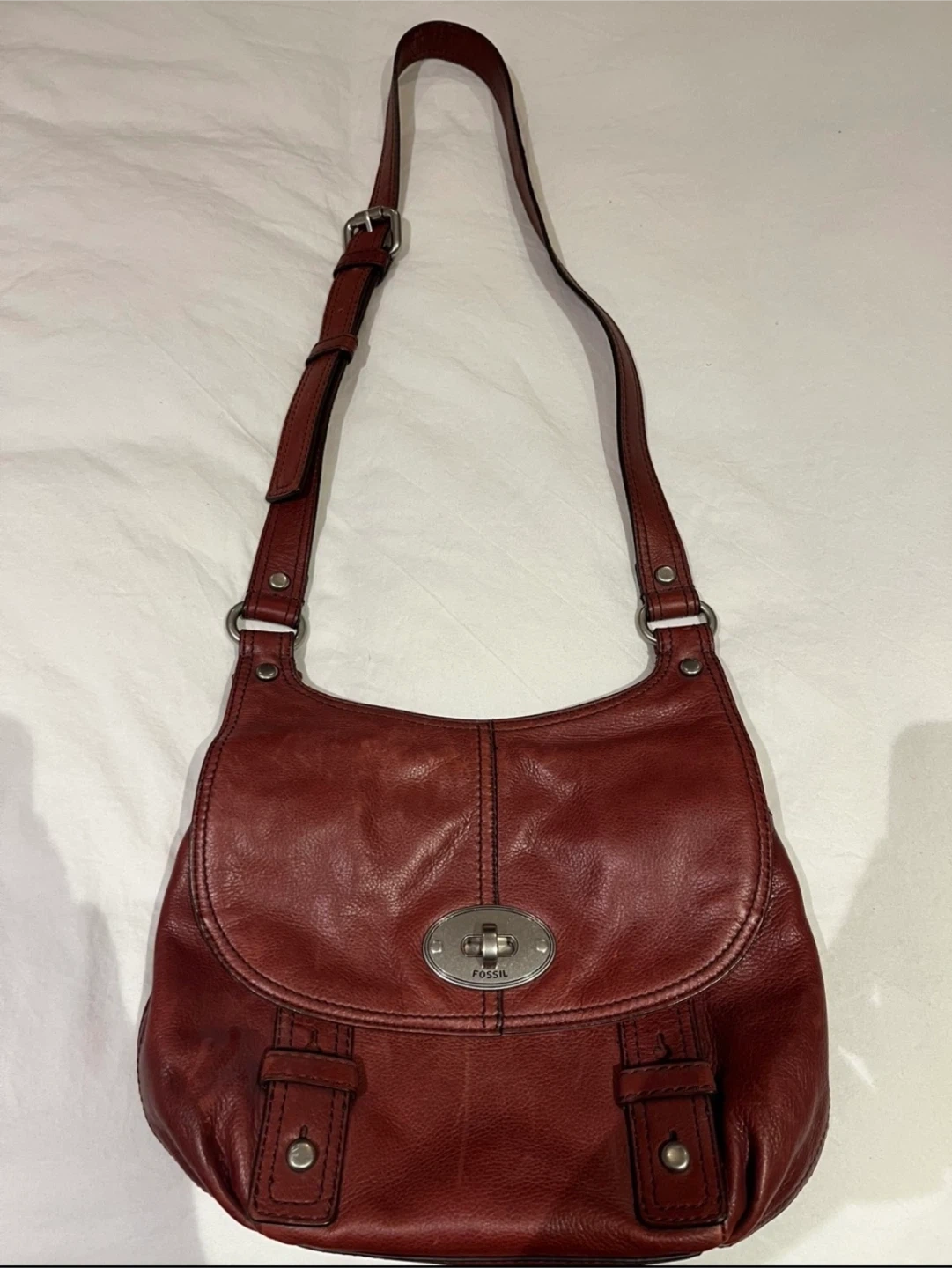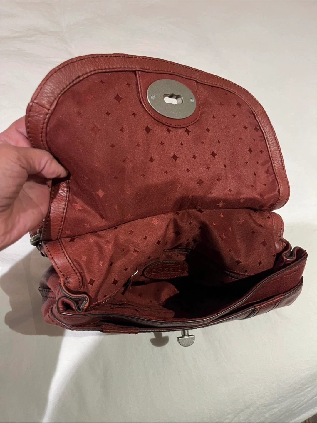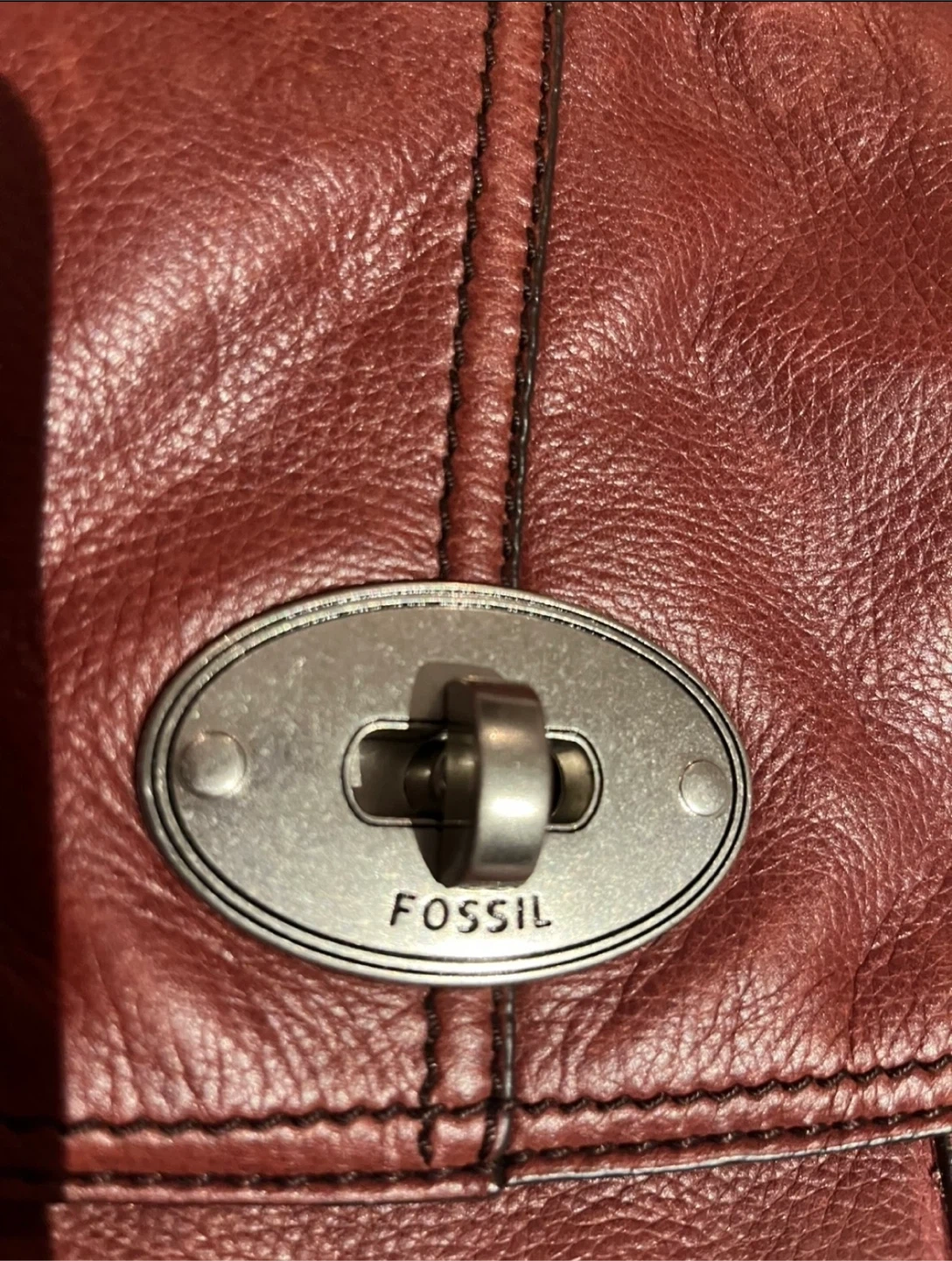 This is a burgundy leather crossbody bag from Fossil. It's made of genuine leather and has a fabric lining. The bag features an adjustable strap and a turn-lock closure.