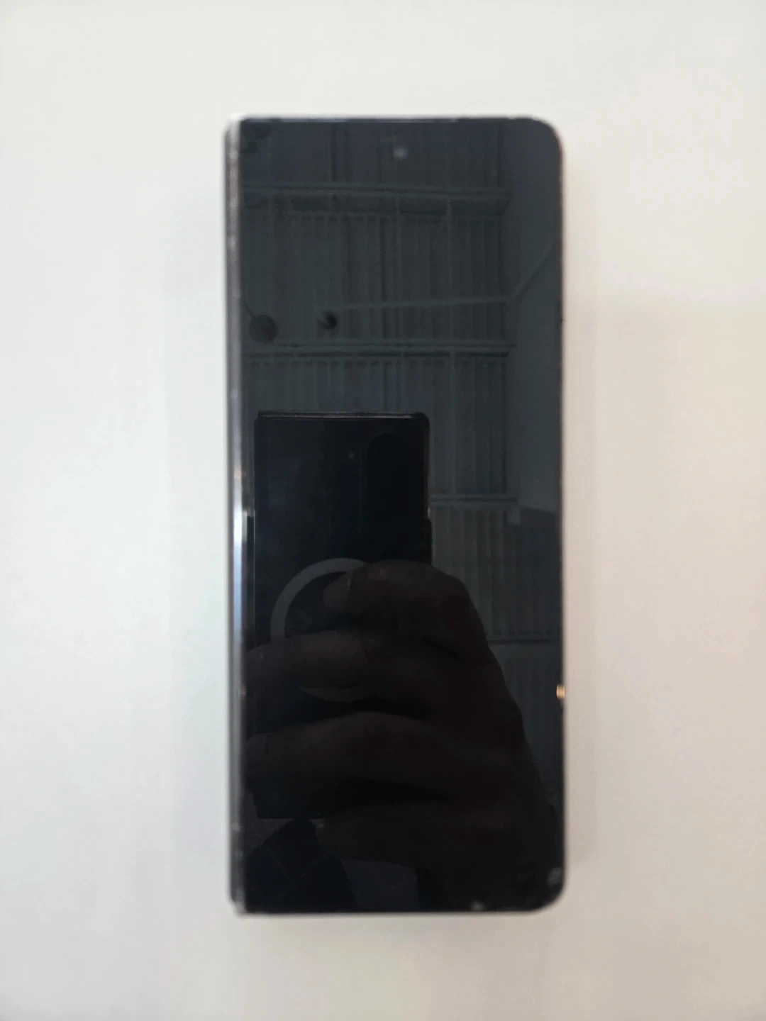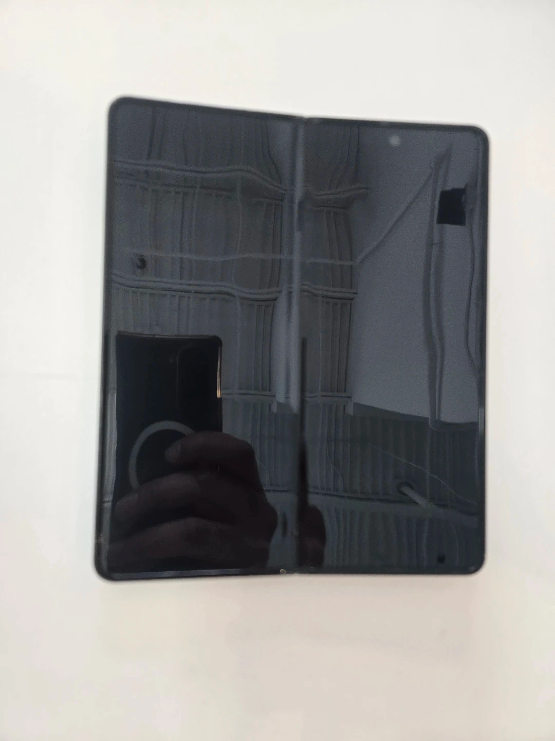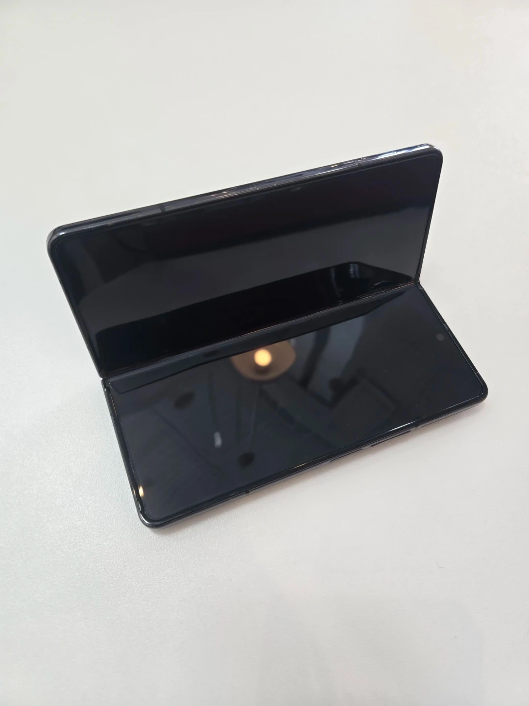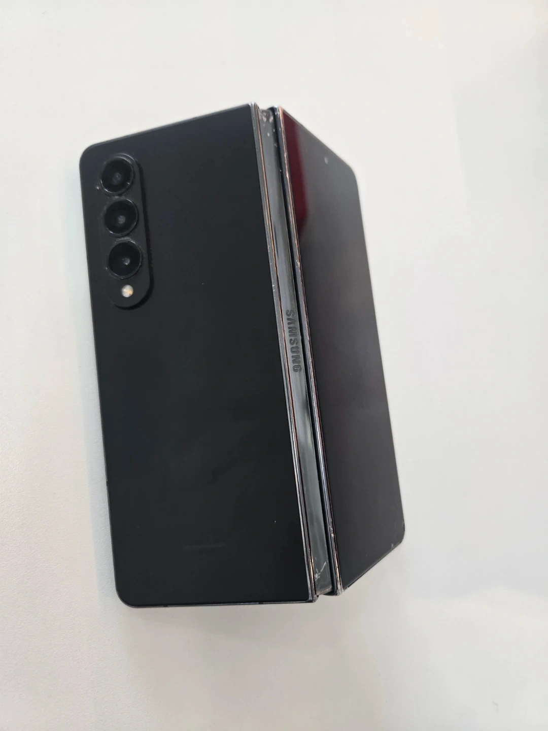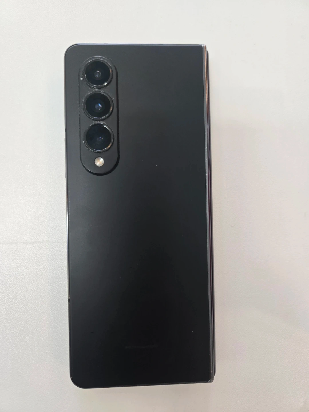 This is a black Samsung Galaxy Z Fold 4. It's a foldable smartphone with a large inner display. It features a triple-lens rear camera system.