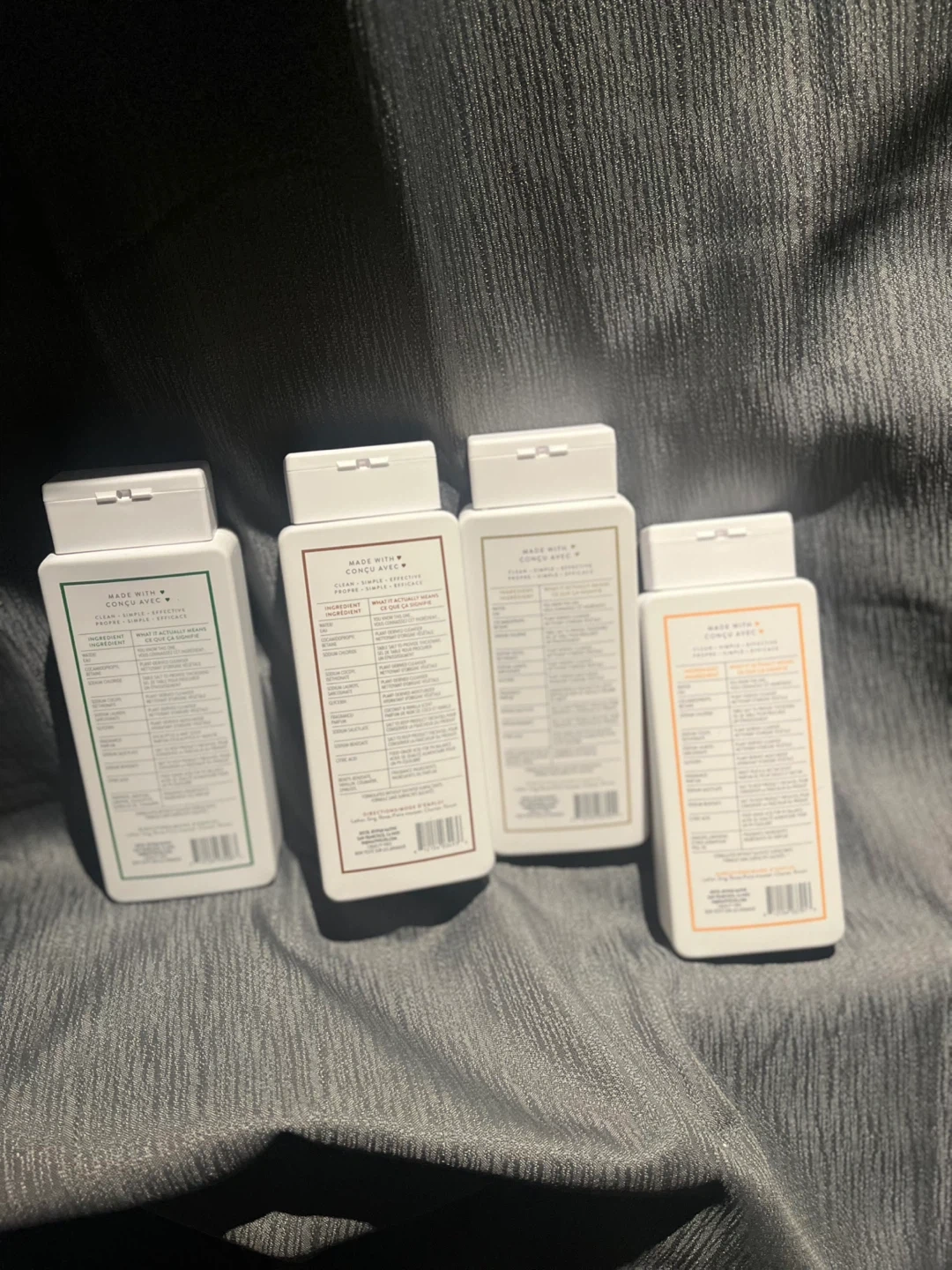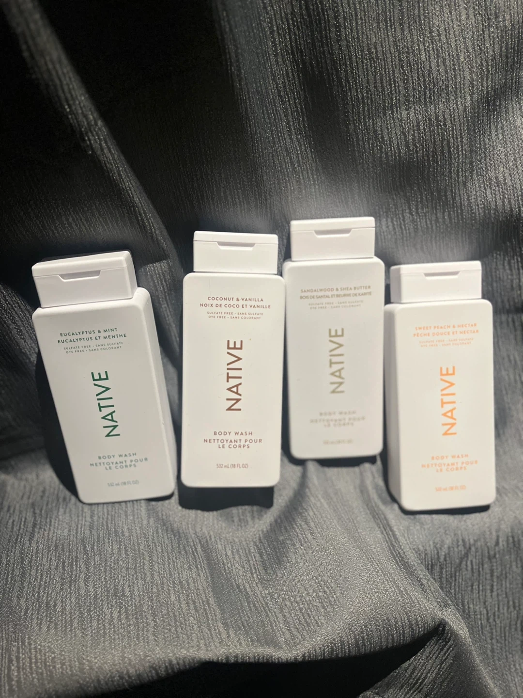 This set includes four Native body washes in Eucalyptus & Mint, Coconut & Vanilla, Sandalwood & Shea Butter, and Sweet Peach & Nectar scents. Each bottle is 10 fl oz (295 mL). These body washes are free of sulfates and parabens. It's great for daily use!