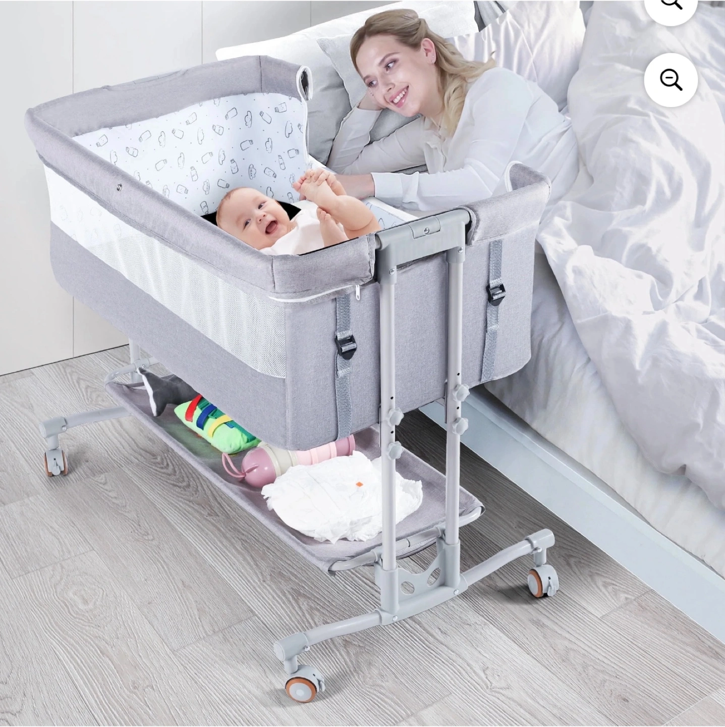 Selling a bedside bassinet crib for your little one! It's in great condition and perfect for keeping your baby close during those early months. The bassinet features a sturdy frame, breathable mesh sides, and a comfortable sleeping surface. It also has a convenient storage shelf underneath for diapers and other essentials. The color is a neutral gray, so it will easily match any nursery decor