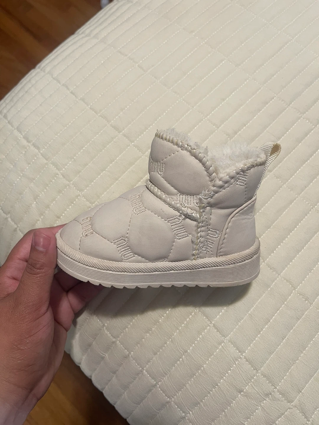 67These cute cream-colored baby booties are perfect for keeping your little one's feet warm this winter! They have a soft, quilted design and cozy faux fur lining.