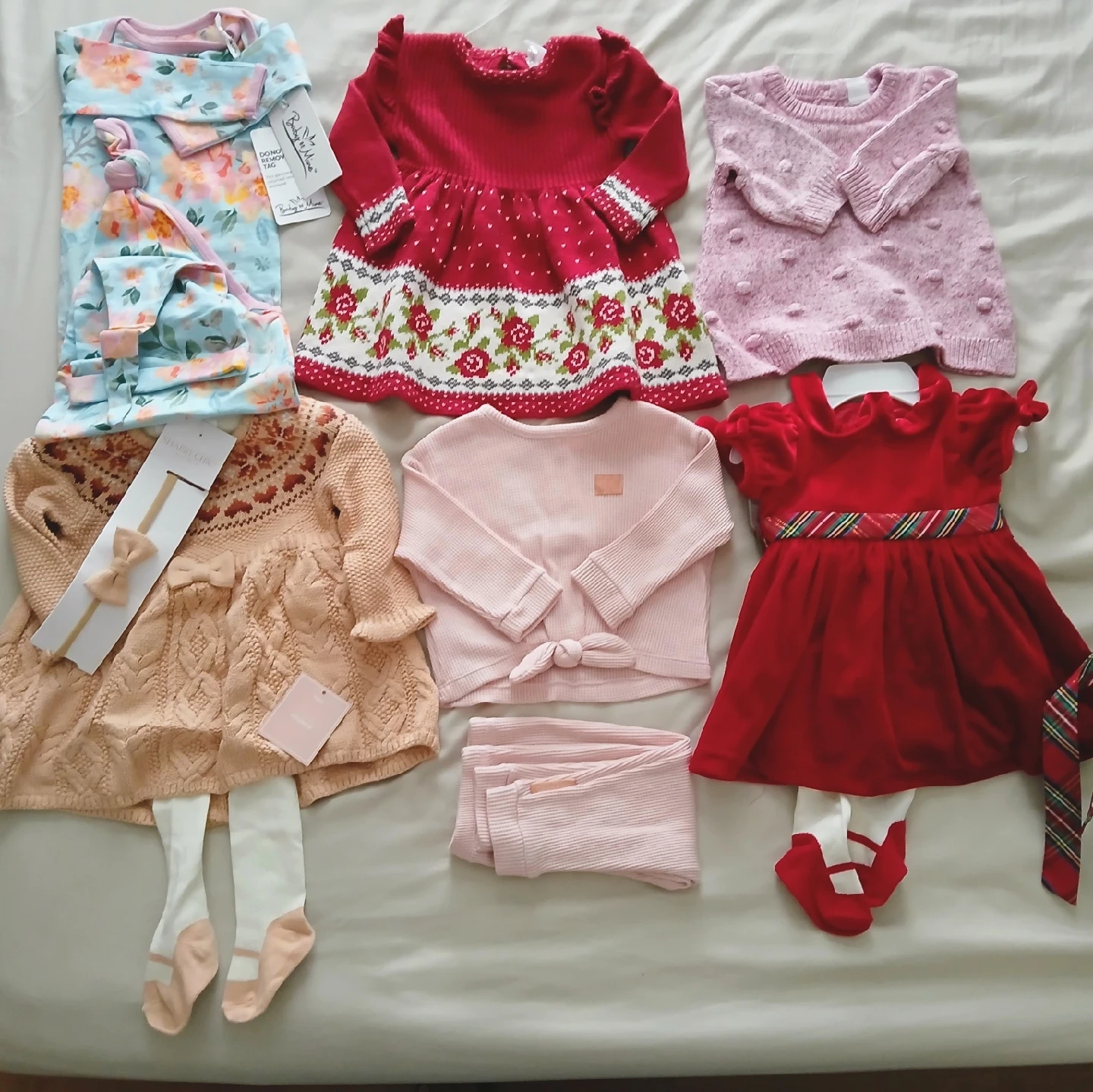 Selling a bundle of baby girl clothes! Included are a few dresses and a matching top and leggings set. Great for a little one's wardrobe! Brands like Shabby Chic, Baby Be Mine and Calvin Klein.