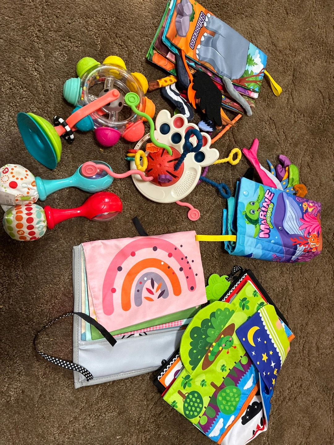 77This is a bundle of baby sensory toys, including soft books and other developmental toys. Great for early learning and sensory exploration!