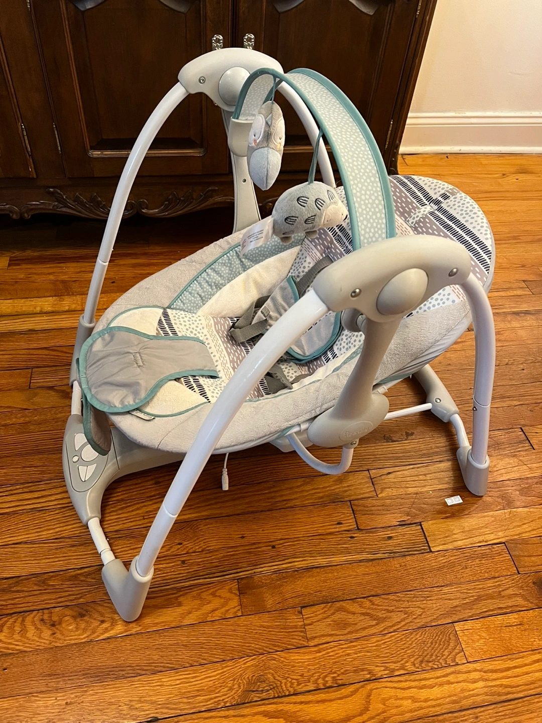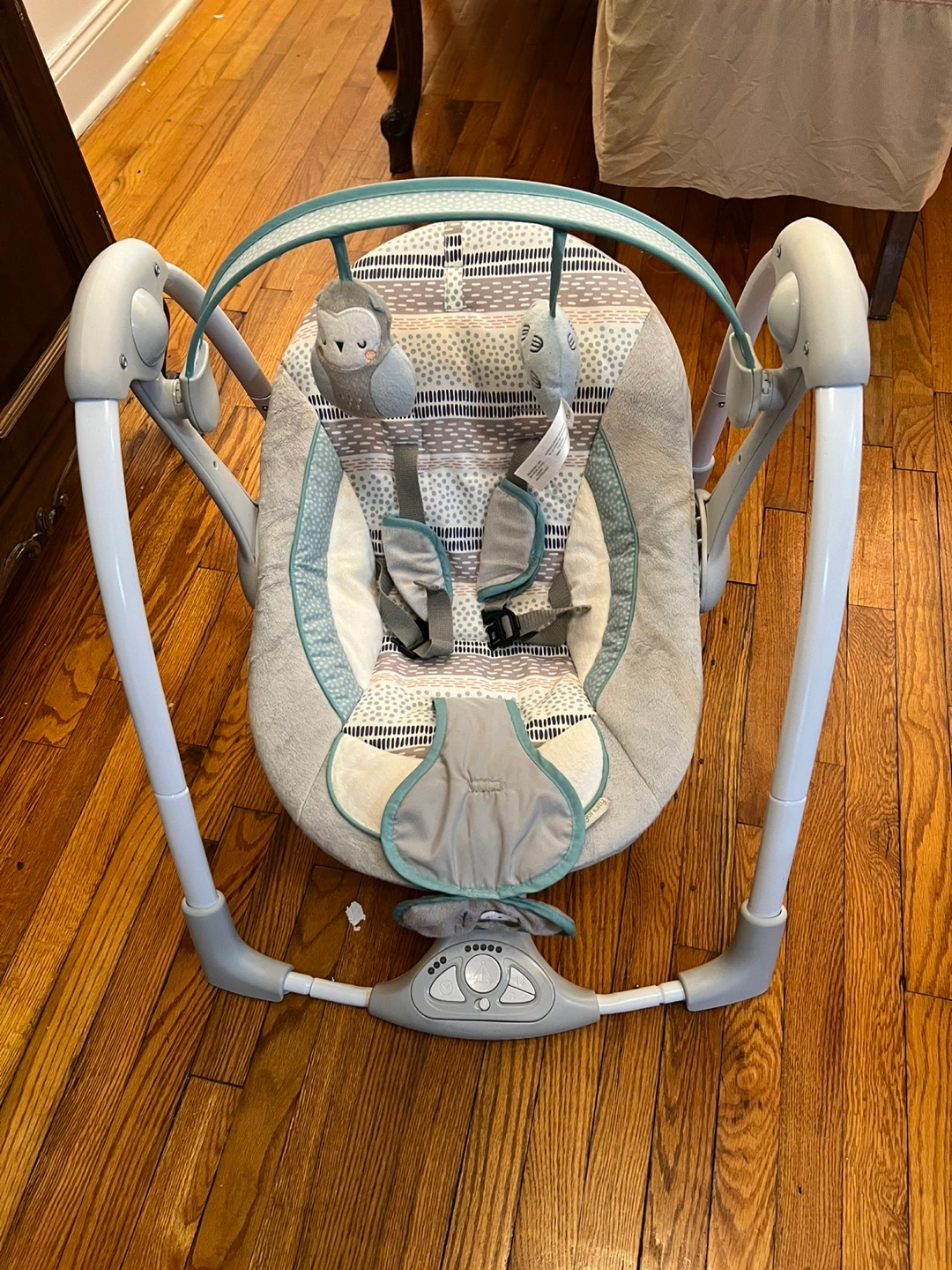 9Infant swing, gray and teal color scheme. Features multiple speeds and soothing sounds. Good condition, minor wear.