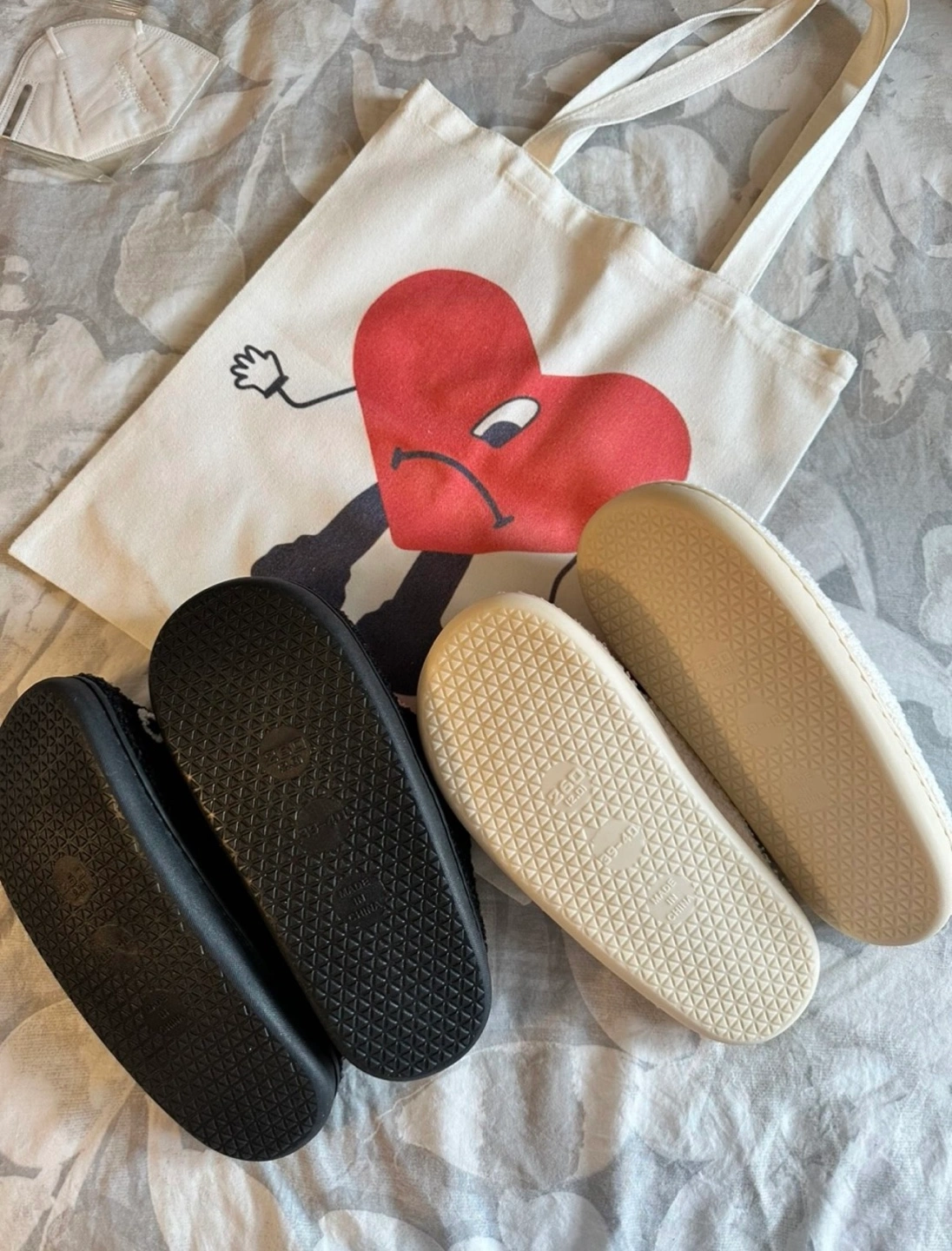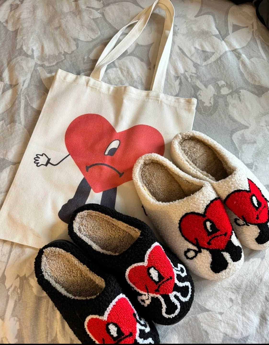 737Cozy Bad Bunny slippers featuring cute heart designs. Soft material, comfortable fit. One pair black, one pair off-white. Includes a tote bag! Tote has mark on the back but it’s washable!