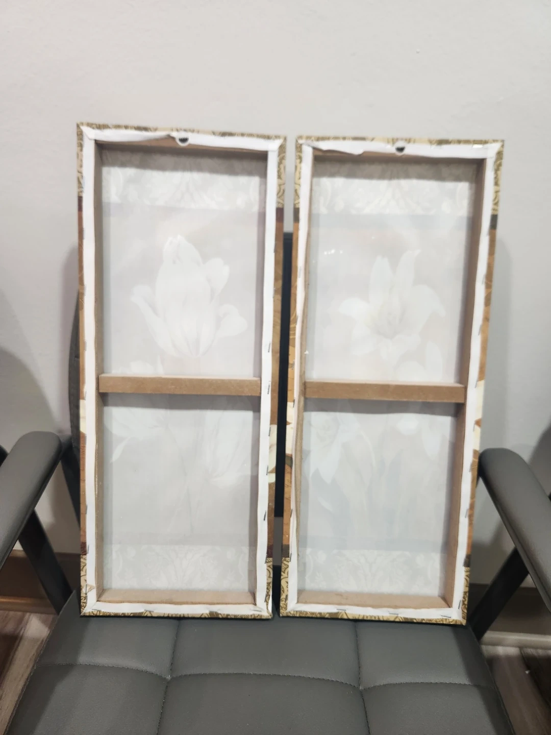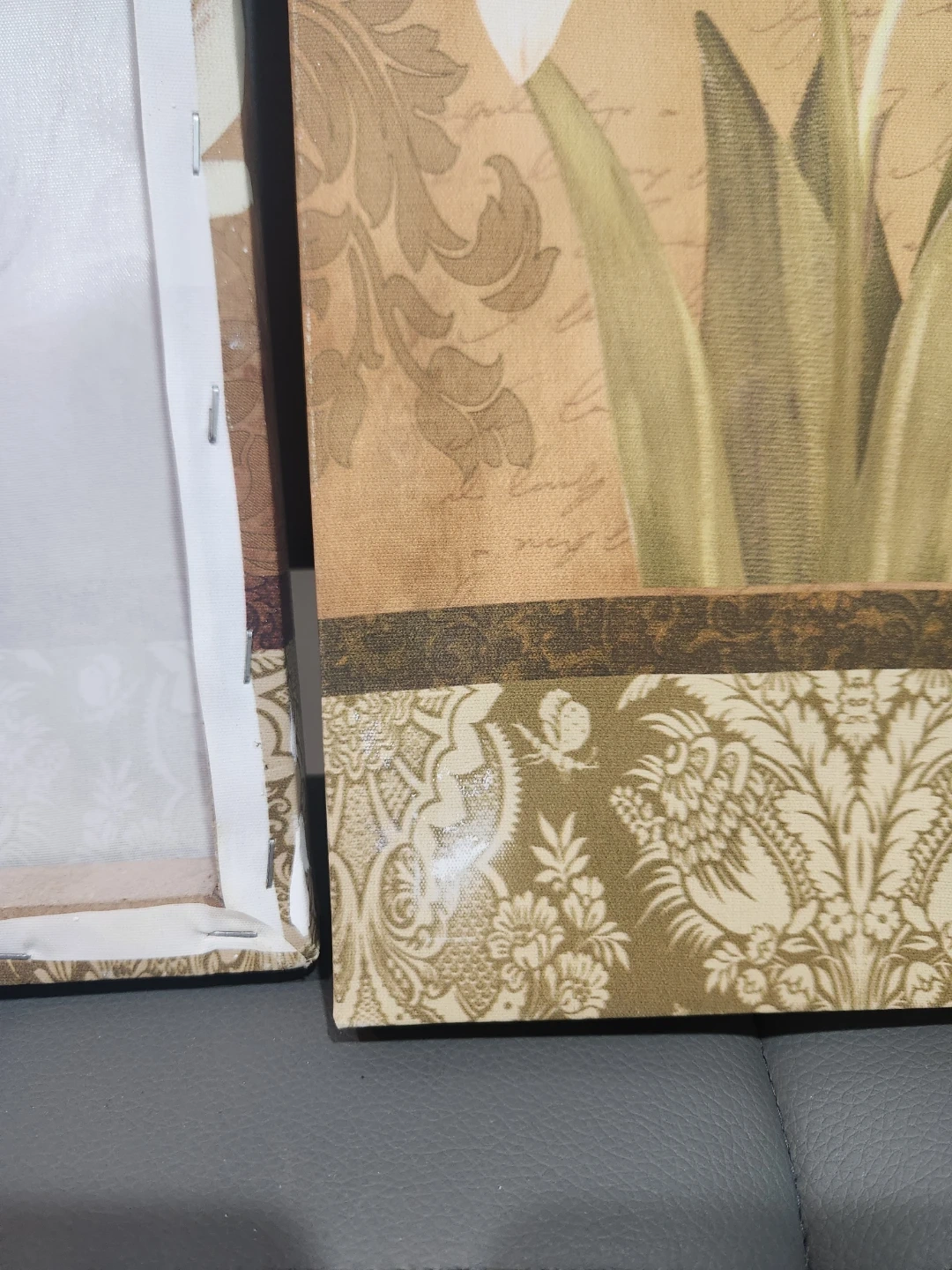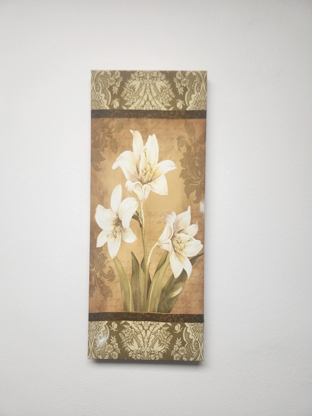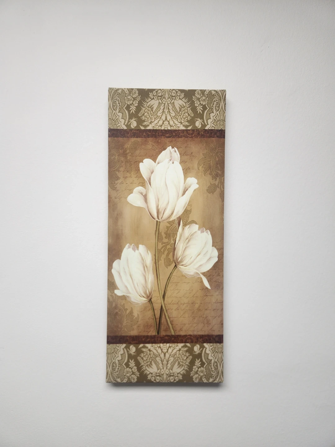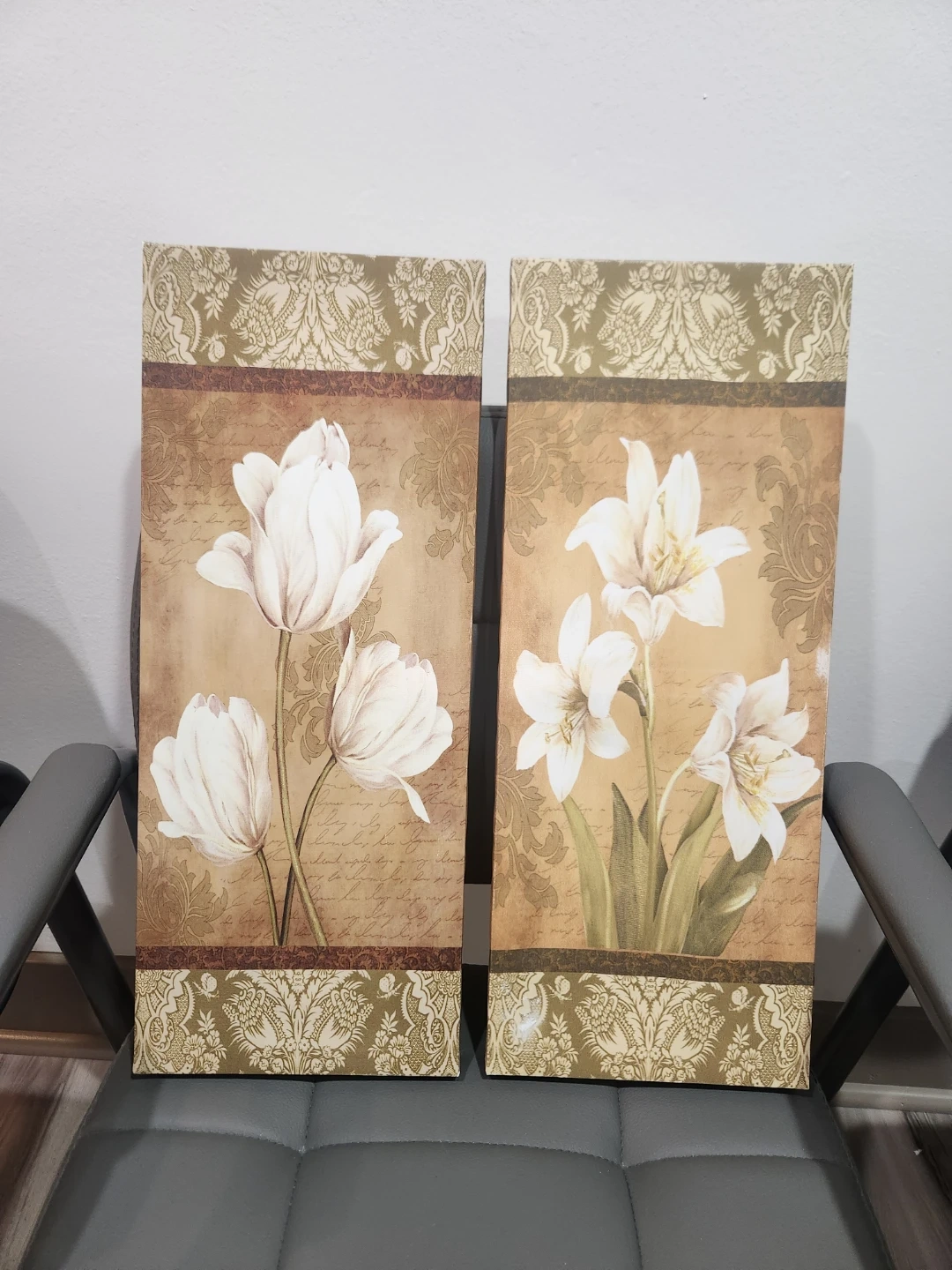This set includes two fabric prints featuring white tulips and lilies on a vintage-inspired background. They're perfect for adding a touch of elegance to any room. Each canvas is ready to hang.