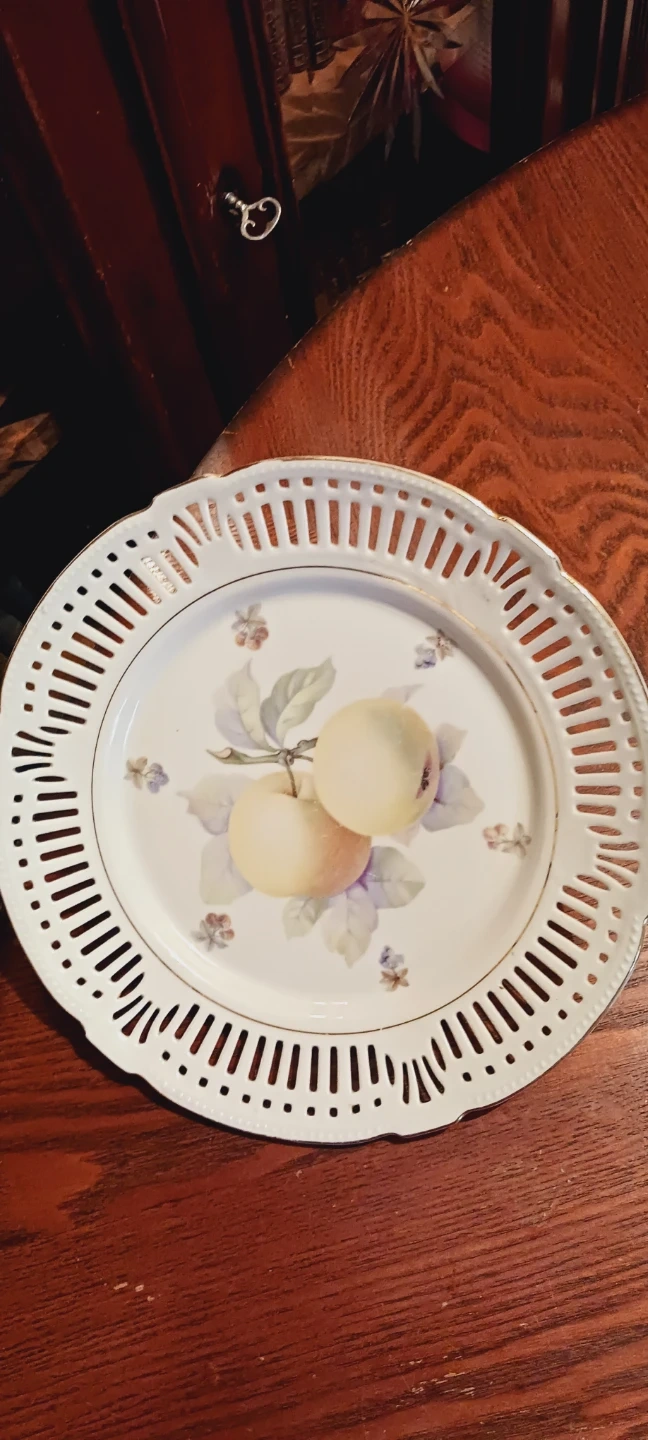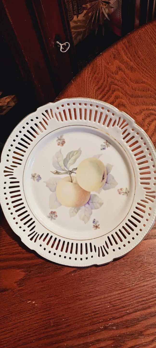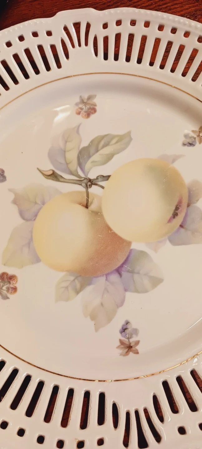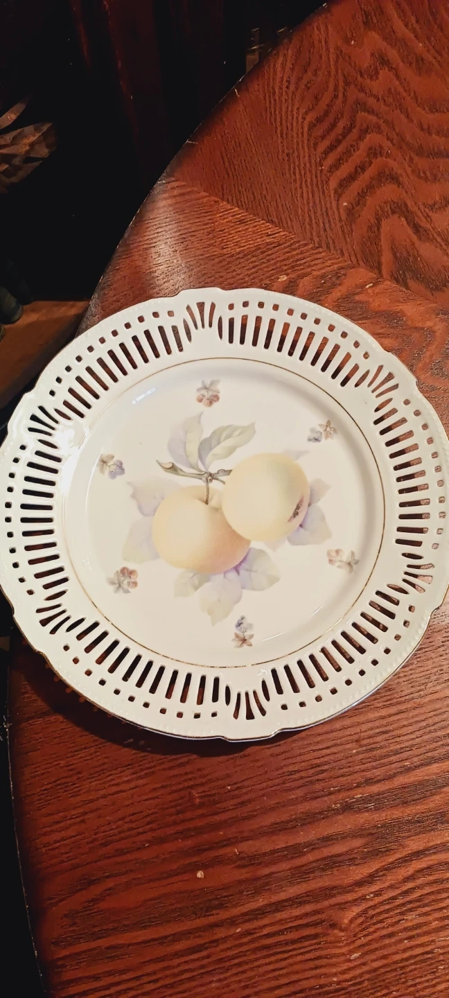 A beautiful decorative plate featuring a delicate apple motif. It's made of porcelain with a pierced, gold-trimmed edge. The mark on the back indicates Schwarzenhammer Bavaria, Germany, U.S. Zone. It's a lovely decorative plate for cake or as serving platter. 10" diameter. Excellent Mint condition. ALL MY PRICES ARE NEGOTIABLE !!