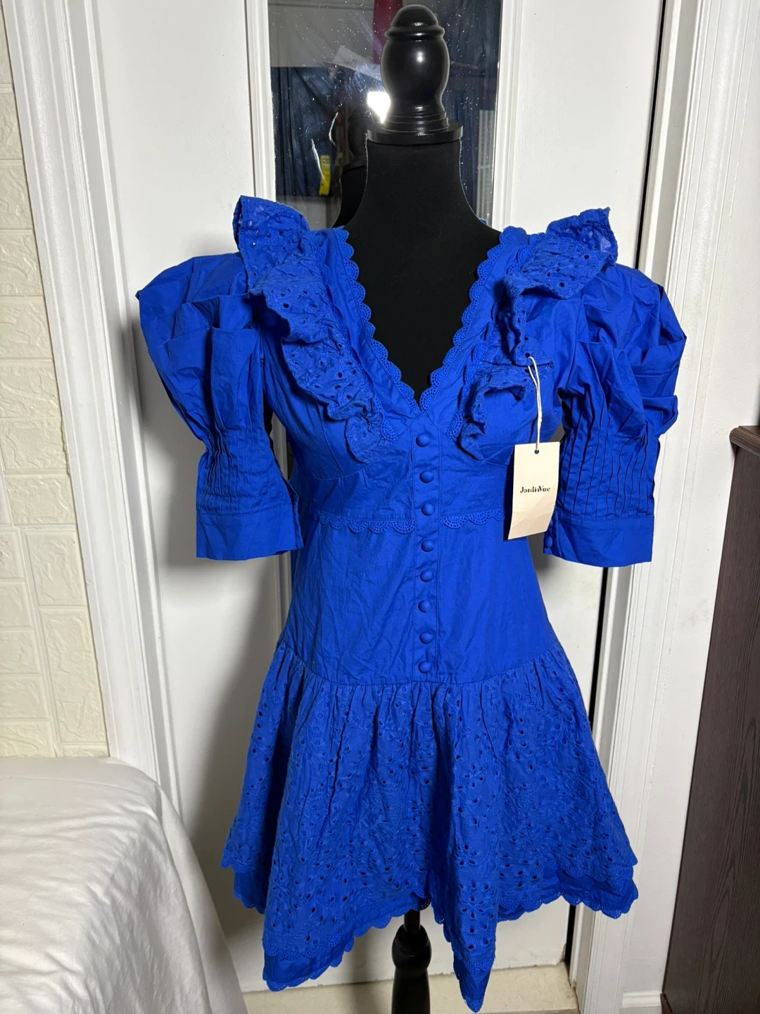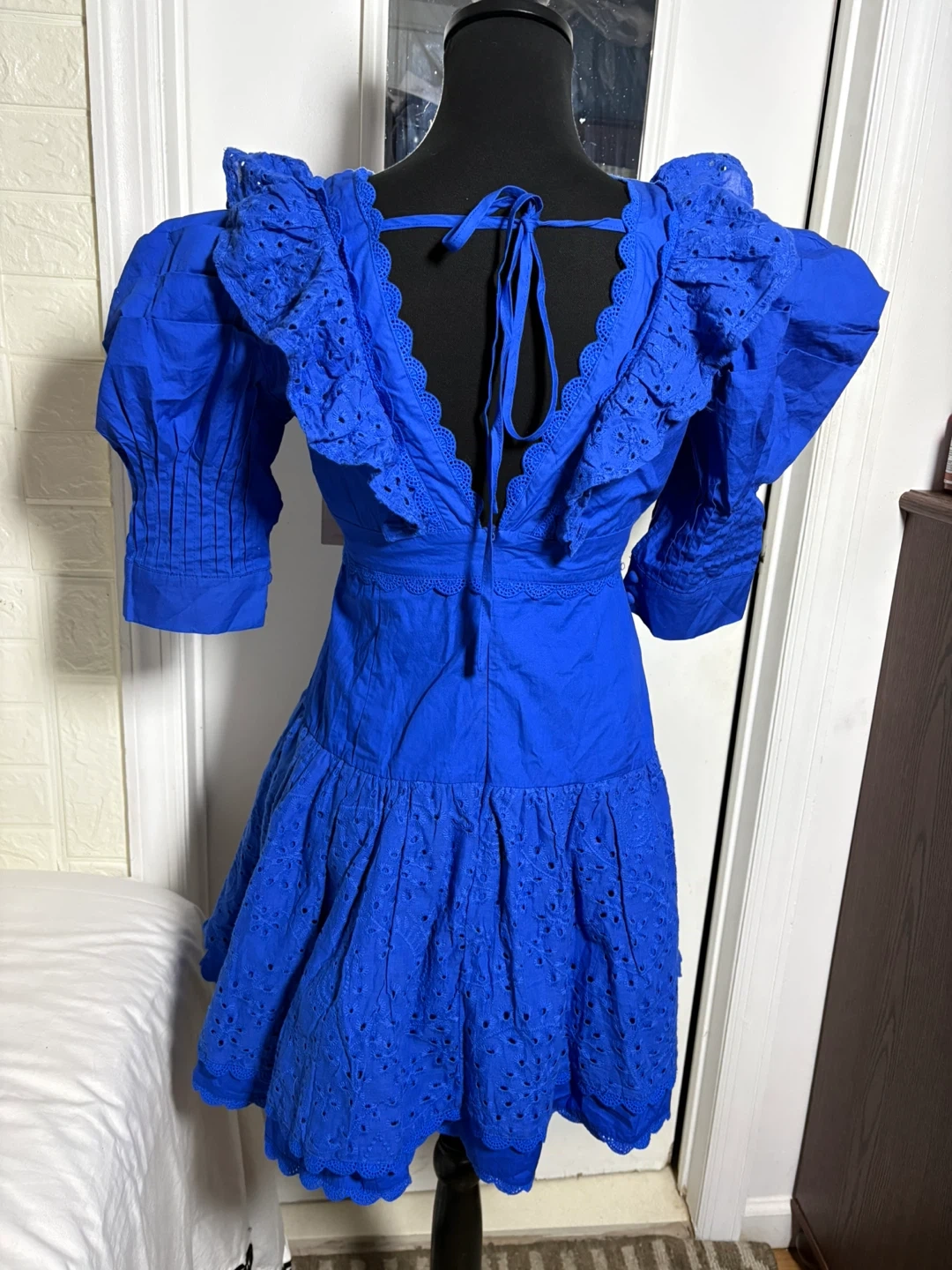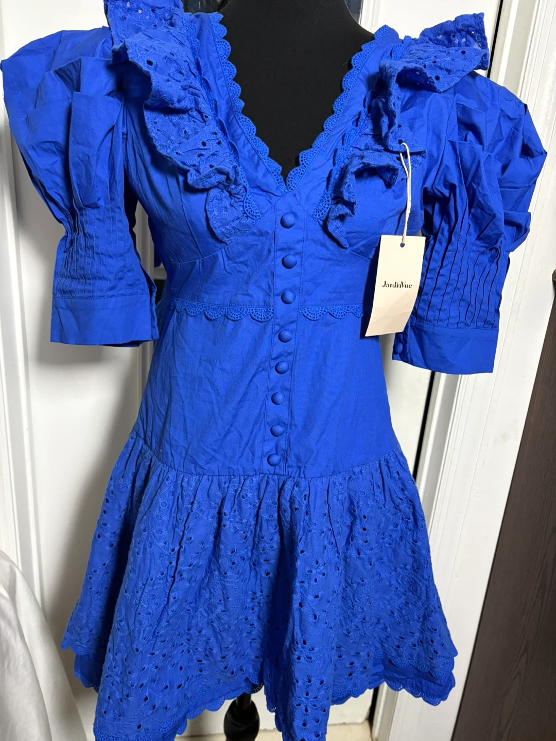 This charming mini dress comes in a vibrant blue with eye-catching ruffles and puff sleeves. It features a button-front closure and intricate eyelet detailing on the skirt. The fabric is lightweight and perfect for warmer weather.