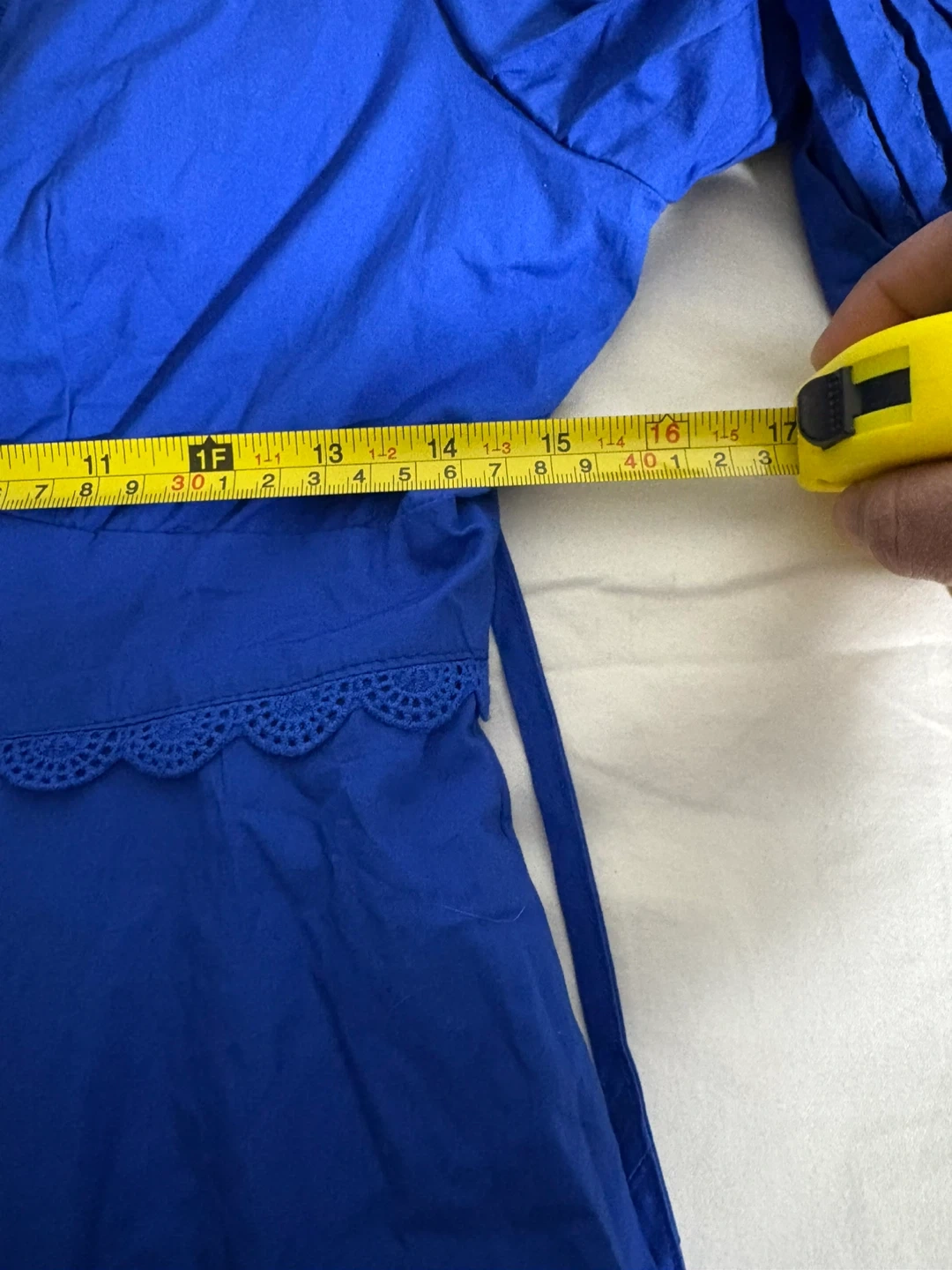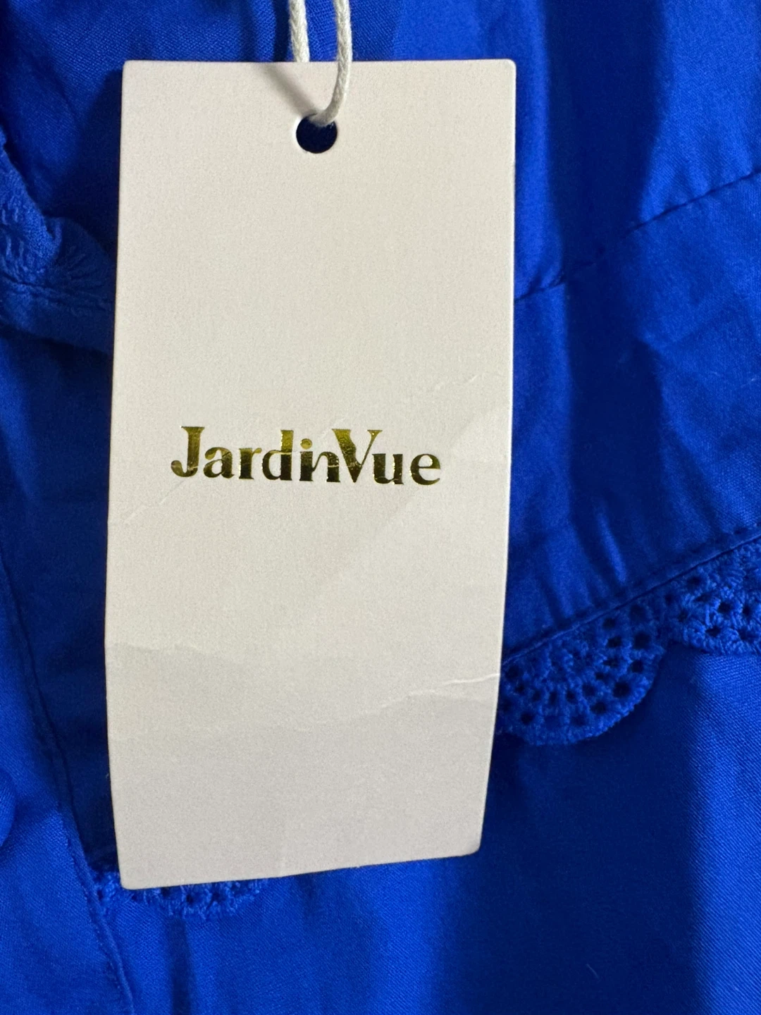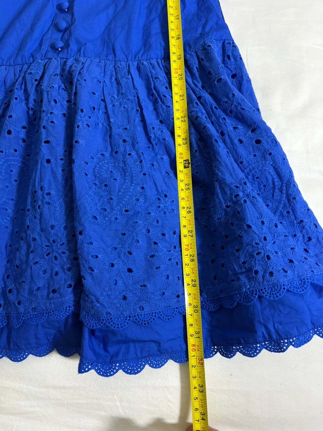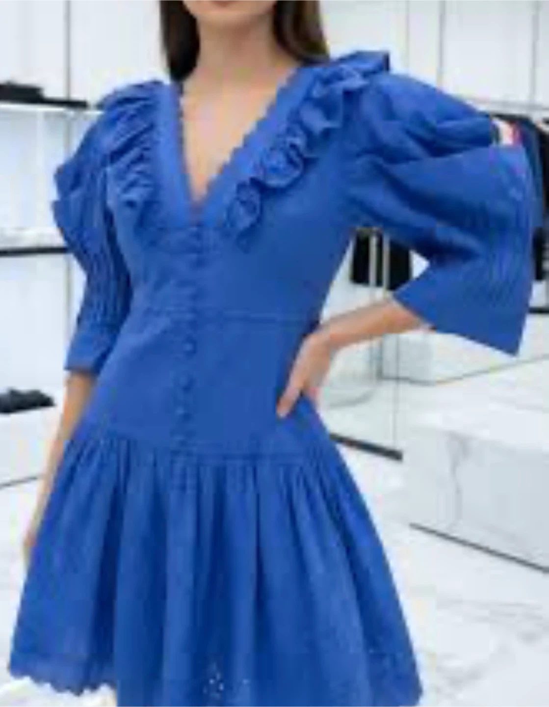 This charming mini dress comes in a vibrant blue with eye-catching ruffles and puff sleeves. It features a button-front closure and intricate eyelet detailing on the skirt. The fabric is lightweight and perfect for warmer weather.