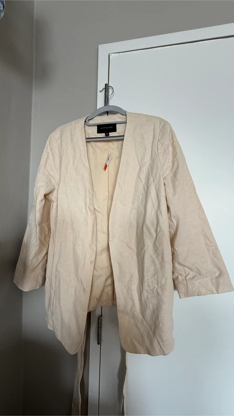 60Selling a Banana Republic blazer in size medium. It's a beautiful beige color and made from a comfortable linen blend. Perfect for layering or wearing on its own!