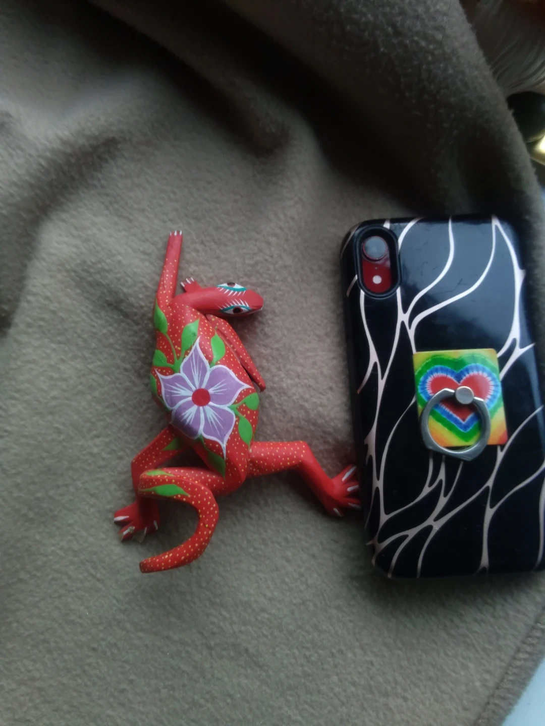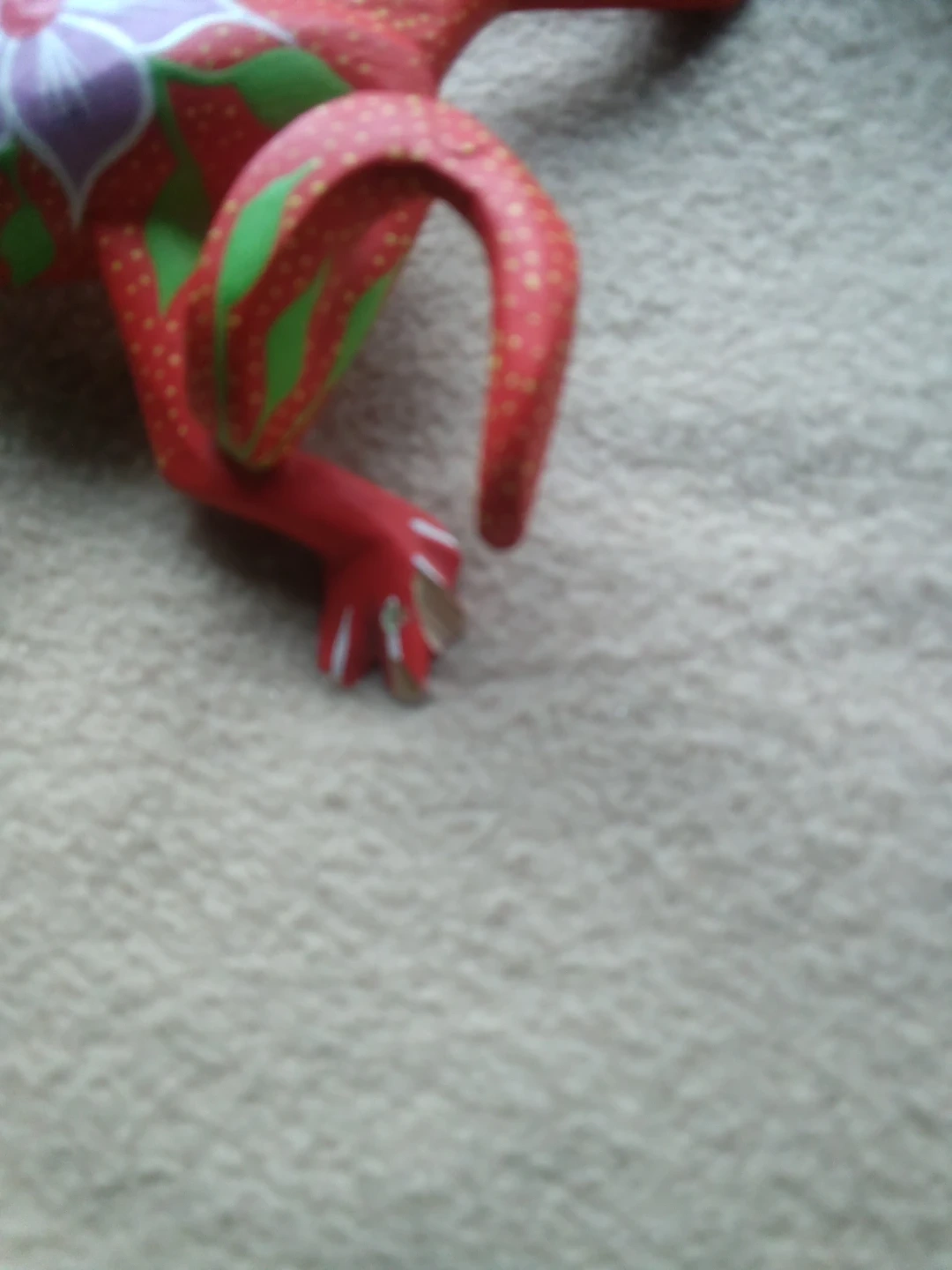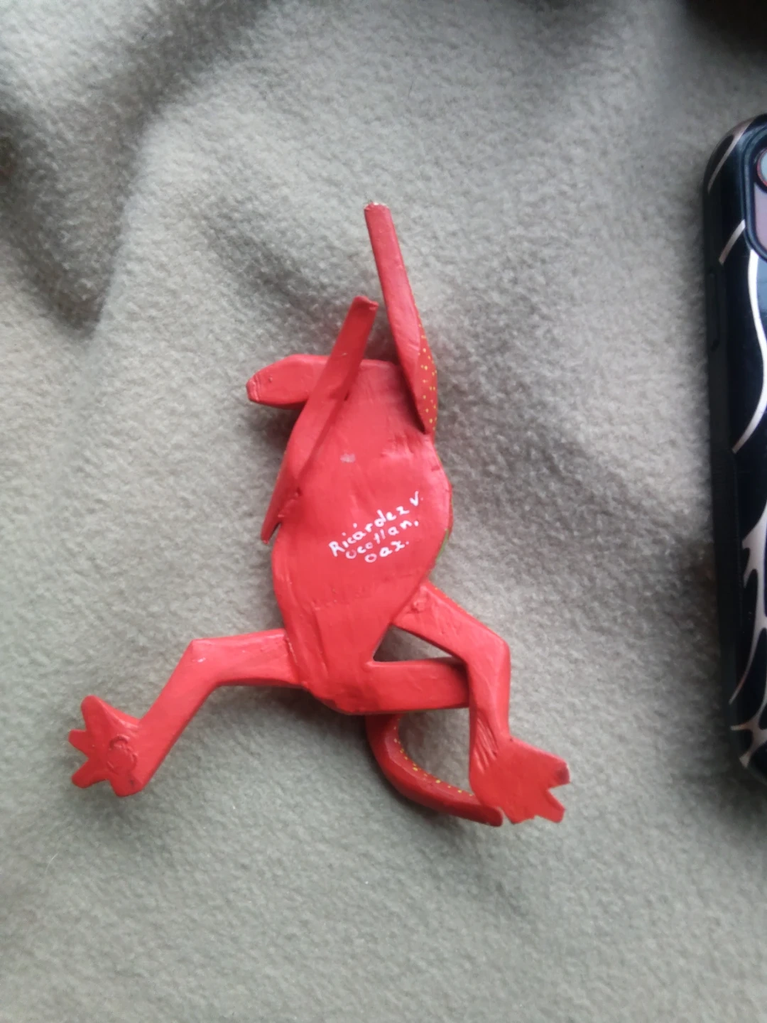 This is a colorful, hand-painted wooden frog figurine. It's bright red with green leaf accents and a purple and white flower design. The bottom is signed 'Ricardo V. Oax.'.