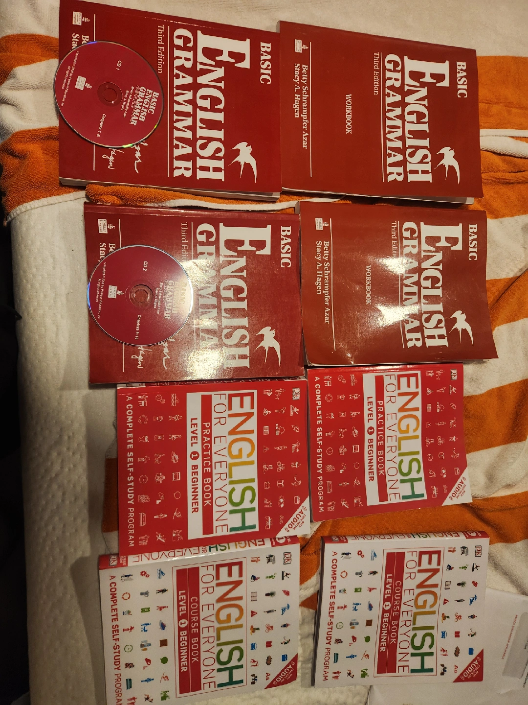 I have a collection of English learning books for sale! Includes: - Basic English Grammar, Third Edition (book and workbook) by Betty Schrampfer Azar and Stacy A. Hagen - English for Everyone, Level 1 Beginner (course book and practice book)
