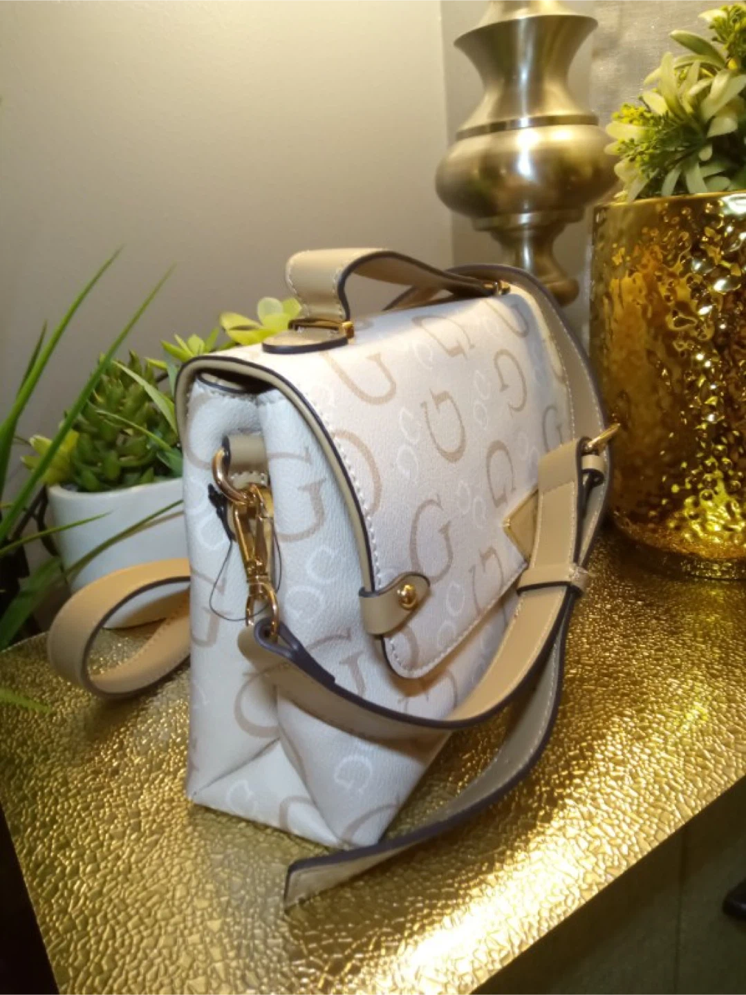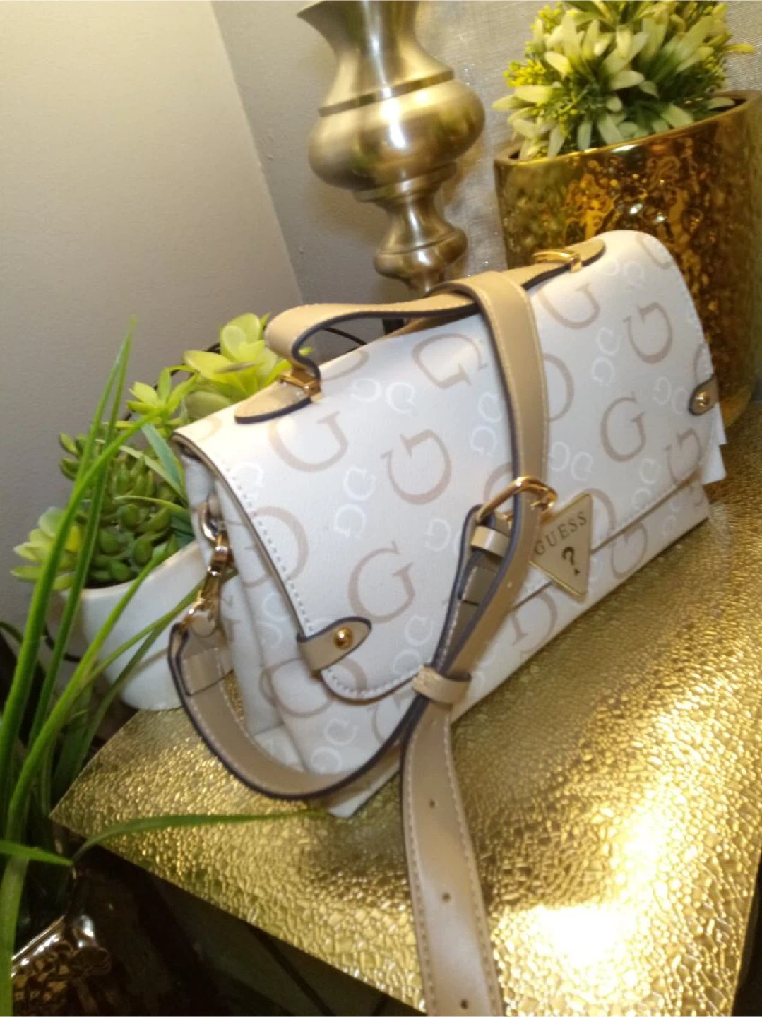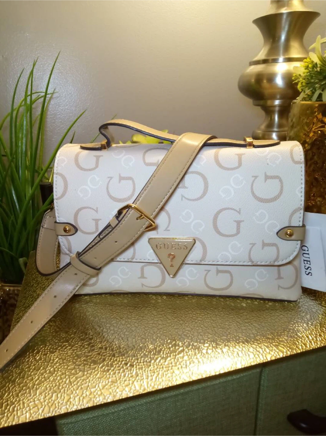 Here's a cute Guess shoulder bag! It features a cream and beige color scheme with the Guess logo patterned throughout. Perfect for adding a touch of style to any outfit