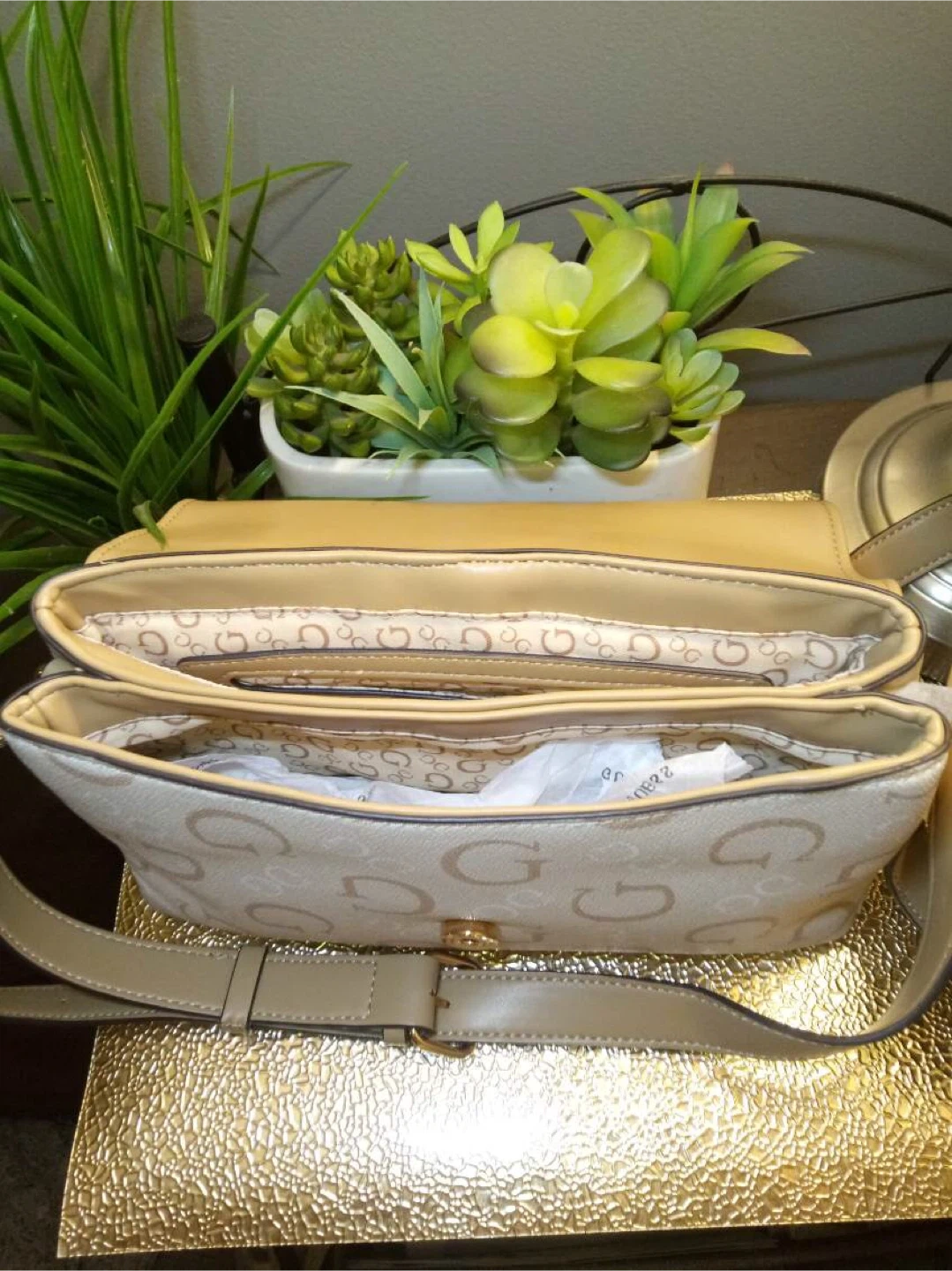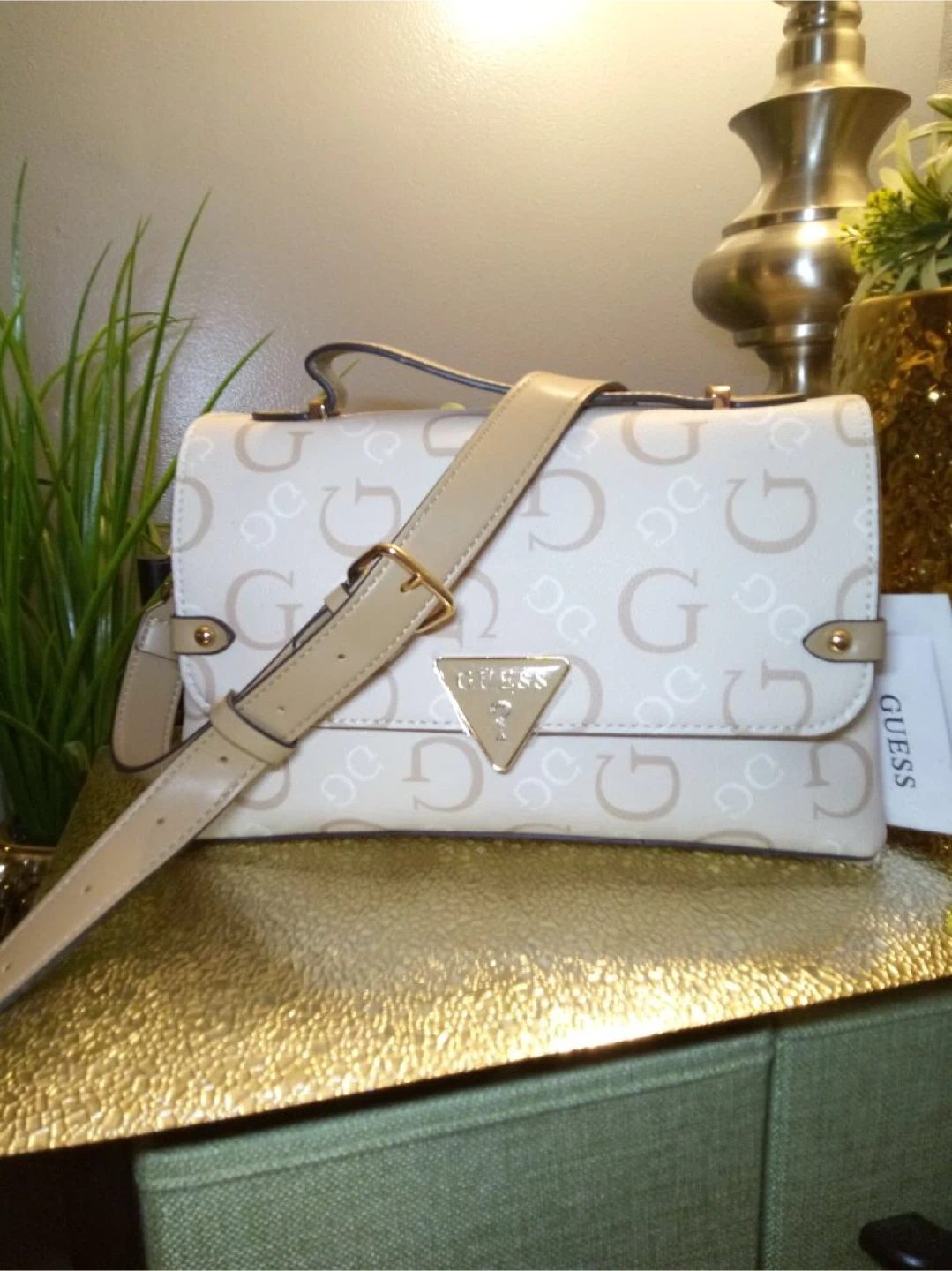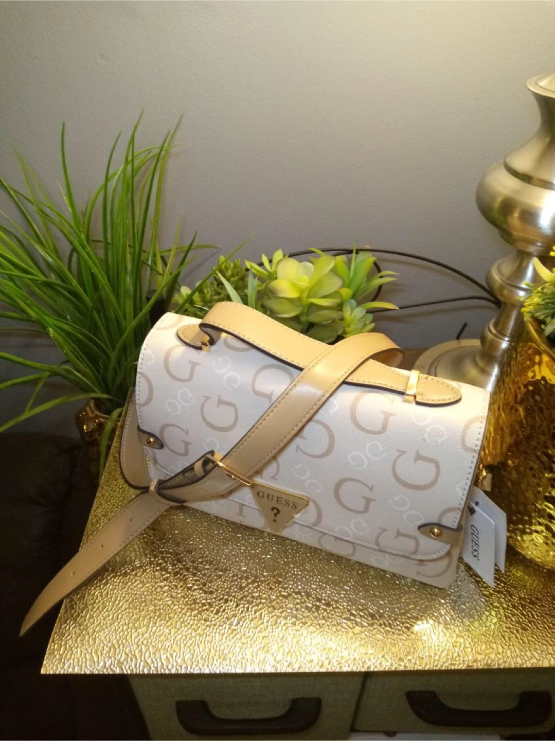 Here's a cute Guess shoulder bag! It features a cream and beige color scheme with the Guess logo patterned throughout. Perfect for adding a touch of style to any outfit