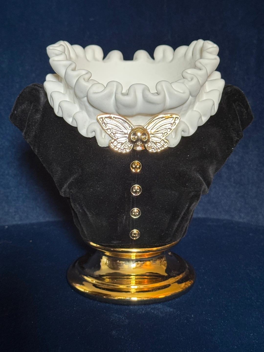 This is a bust trinket holder. It features a black velvet-like material for the dress and a white ruffled collar. There is a gold butterfly with a skull on the chest and gold buttons down the front. The base is also gold.