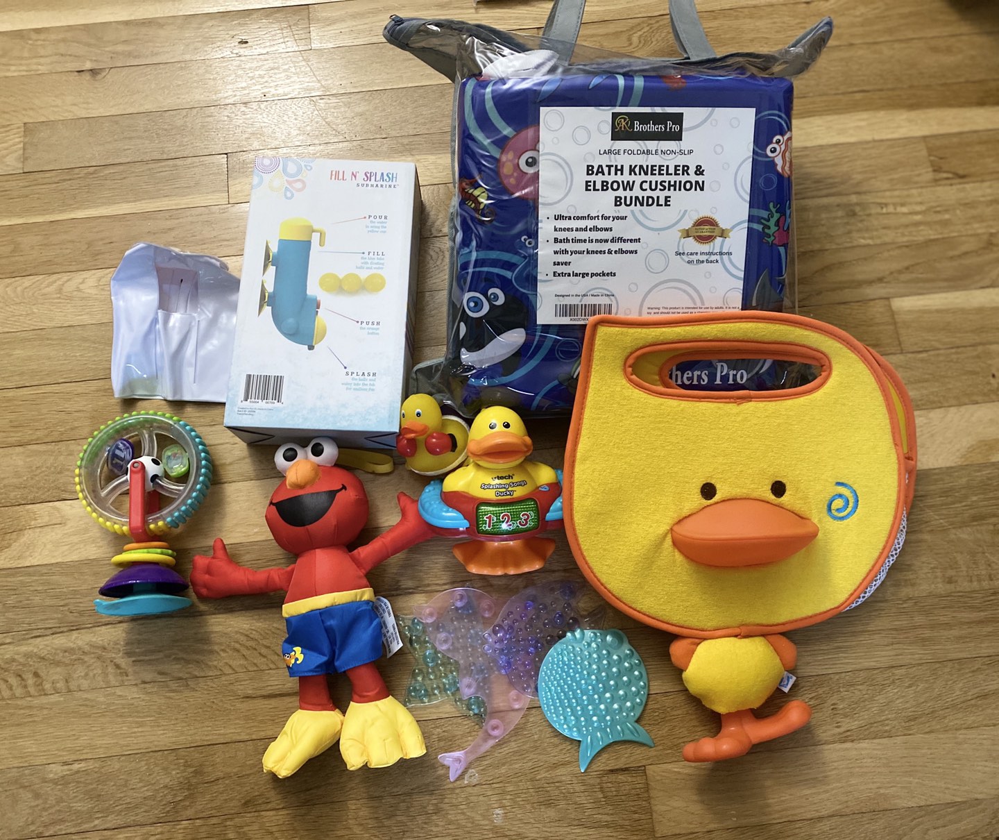 0Everything is NEW except the wheel and vtech duck (used less than 1yr) 1. Spout cover 2. Fill N' Splash toy (retail $13) 3. Bath kneeler & elbow cushion (retails $30) 4. Anti-slip pads 5. wheel toy (used less than 1 yr) 6. vtech duck (sound works great & used less than 1 yr) 7. Duck toy organizer 8. Elmo swim doll 9. Rubber ducky