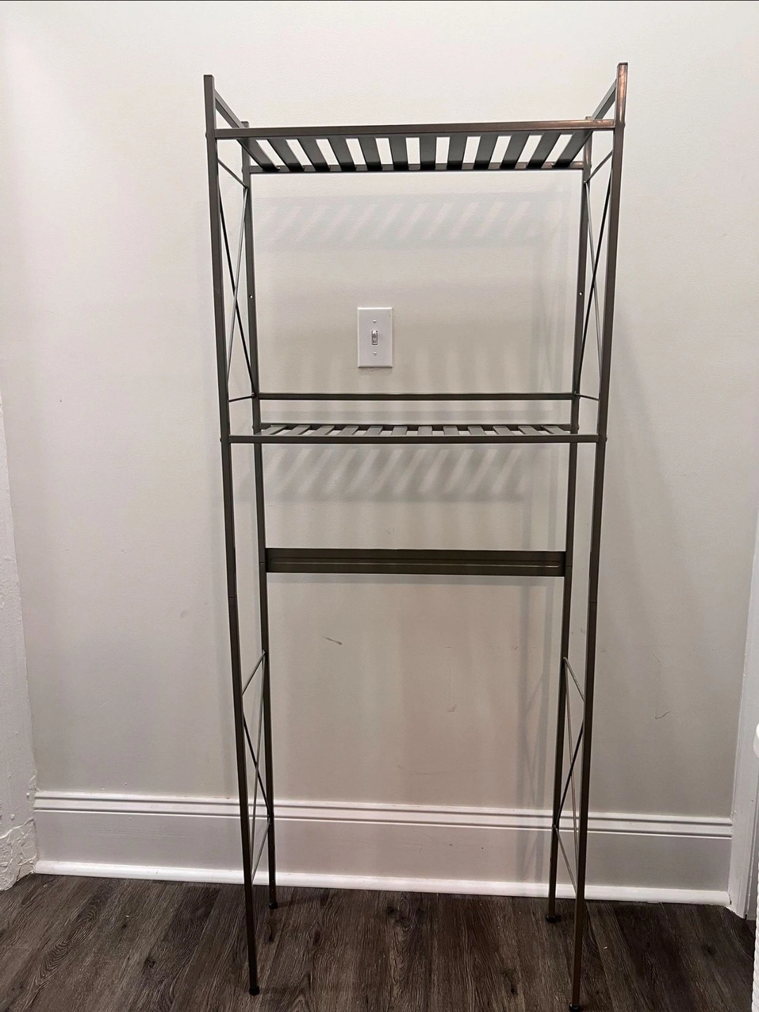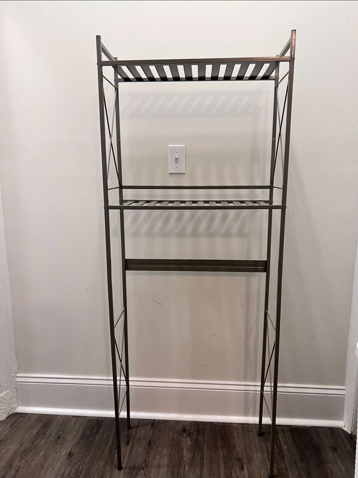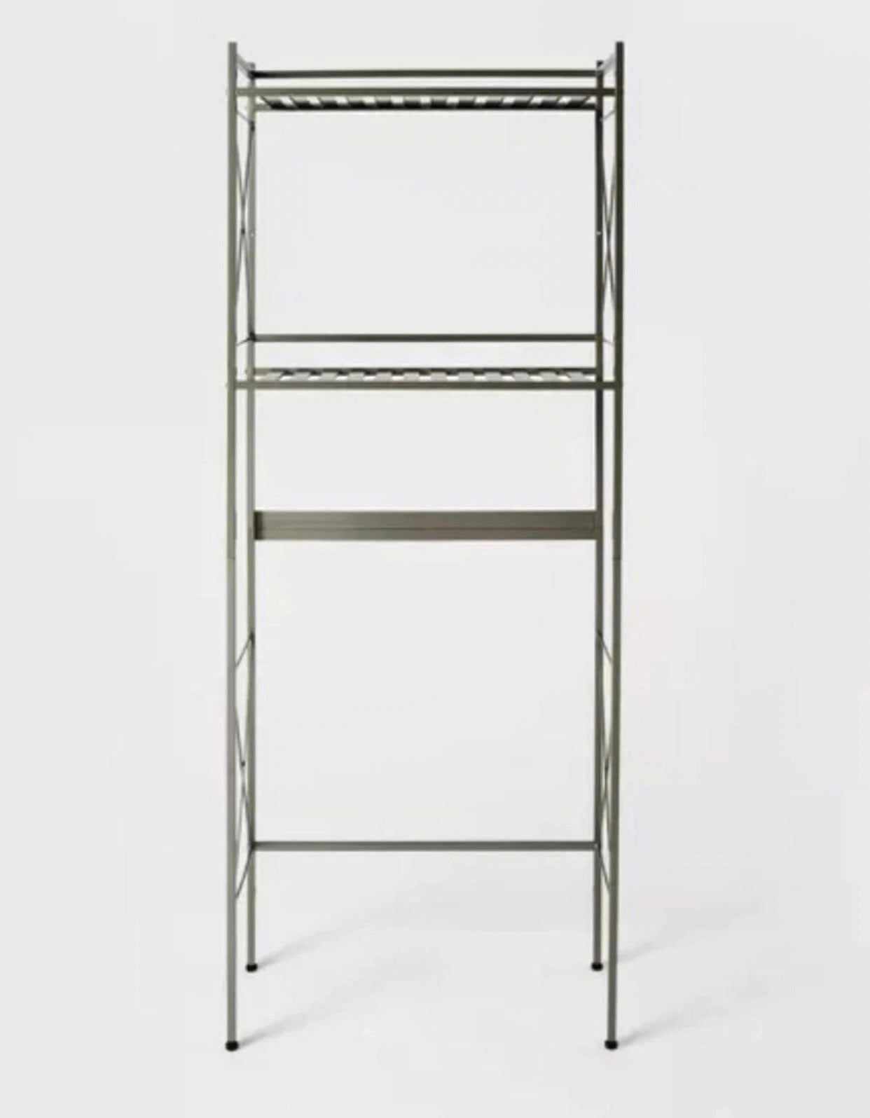 5Bathroom shelving unit in satin nickel finish. Dimensions: 24” W x 61” H x 9.5” D Check out my other listings—things are priced to sell and moving fast! UpCycle NYC is your local source for furniture, electronics, home decor, clothing, shoes, and accessories — vintage, designer, modern, and name brand. We have sofas, armchairs, tables, chairs, dressers, rugs, lamps, mirrors, TV stands, beds, mattresses, kitchenware, cookware, appliances, tools, wooden items, leather goods, video game consoles, phones (iPhone, etc.), cameras, bicycles, outdoor gear, sneakers, jewelry, collectibles, and much more. Many of our items are refurbished or in very good used condition, often offered in discounted bundles or sets. Color: Silver Material: Metal Mounting: Free standing Type: Bathroom shelving & Storage