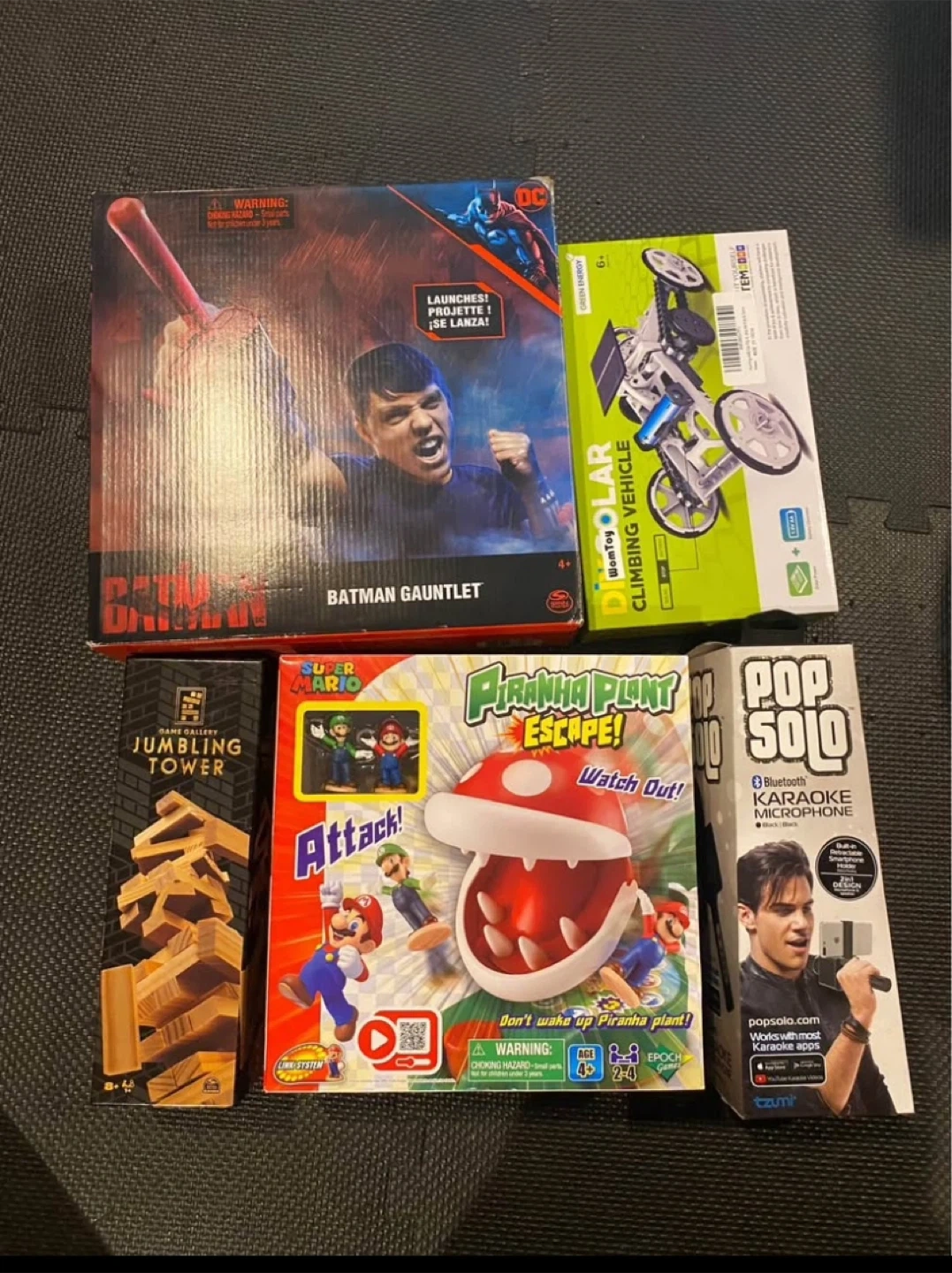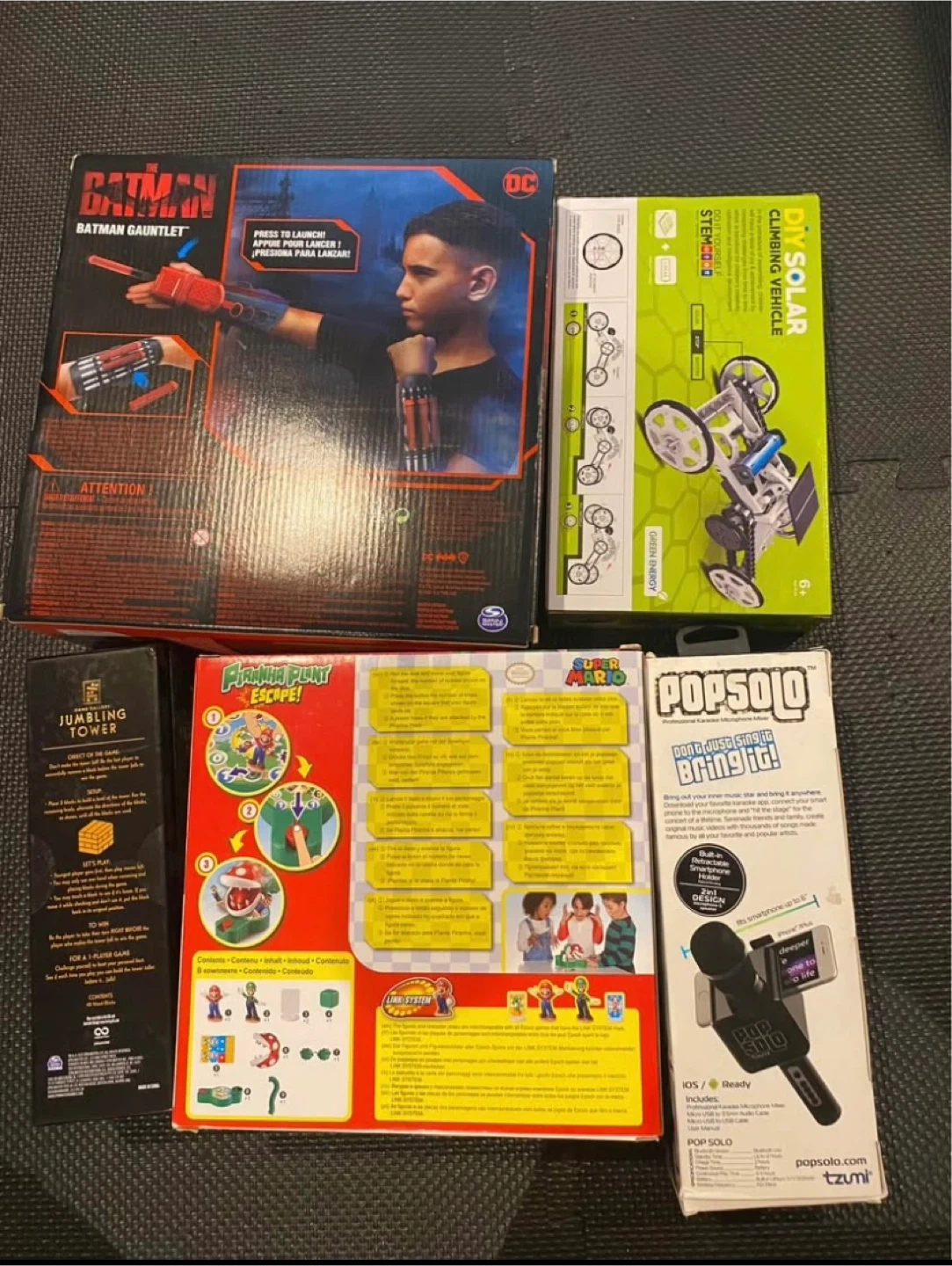 10Selling a variety of games and toys! Included are the Batman Gauntlet, a Jumbling Tower game, the Super Mario Piranha Plant Escape game, a Bluey Solar Climbing Vehicle, and a Pop Solo Bluetooth Karaoke Microphone