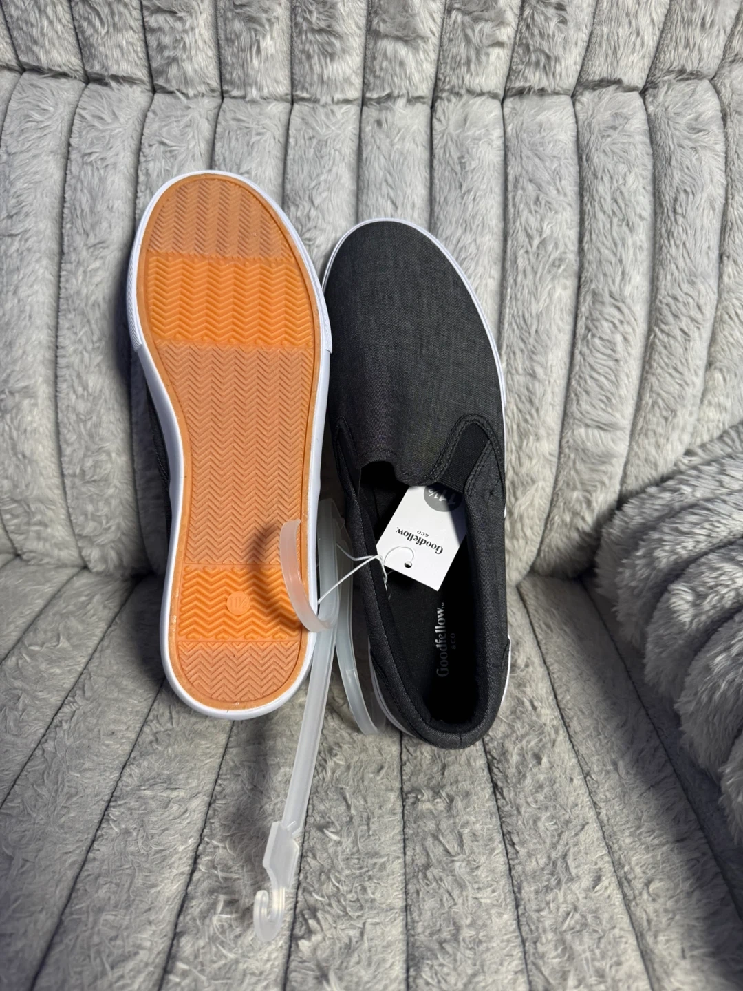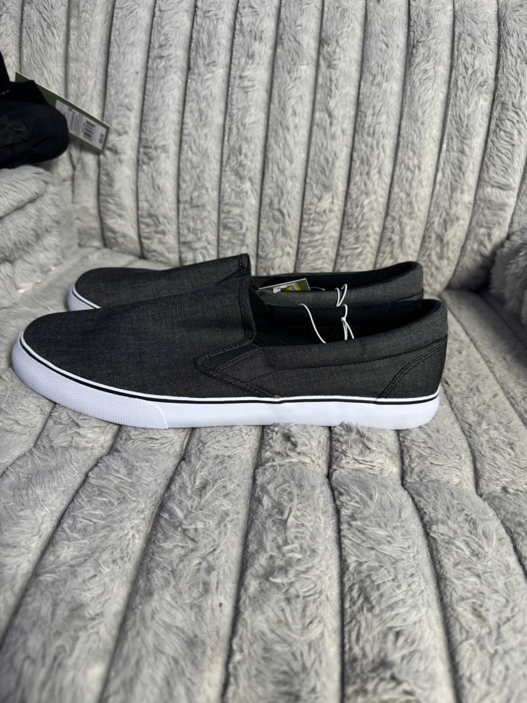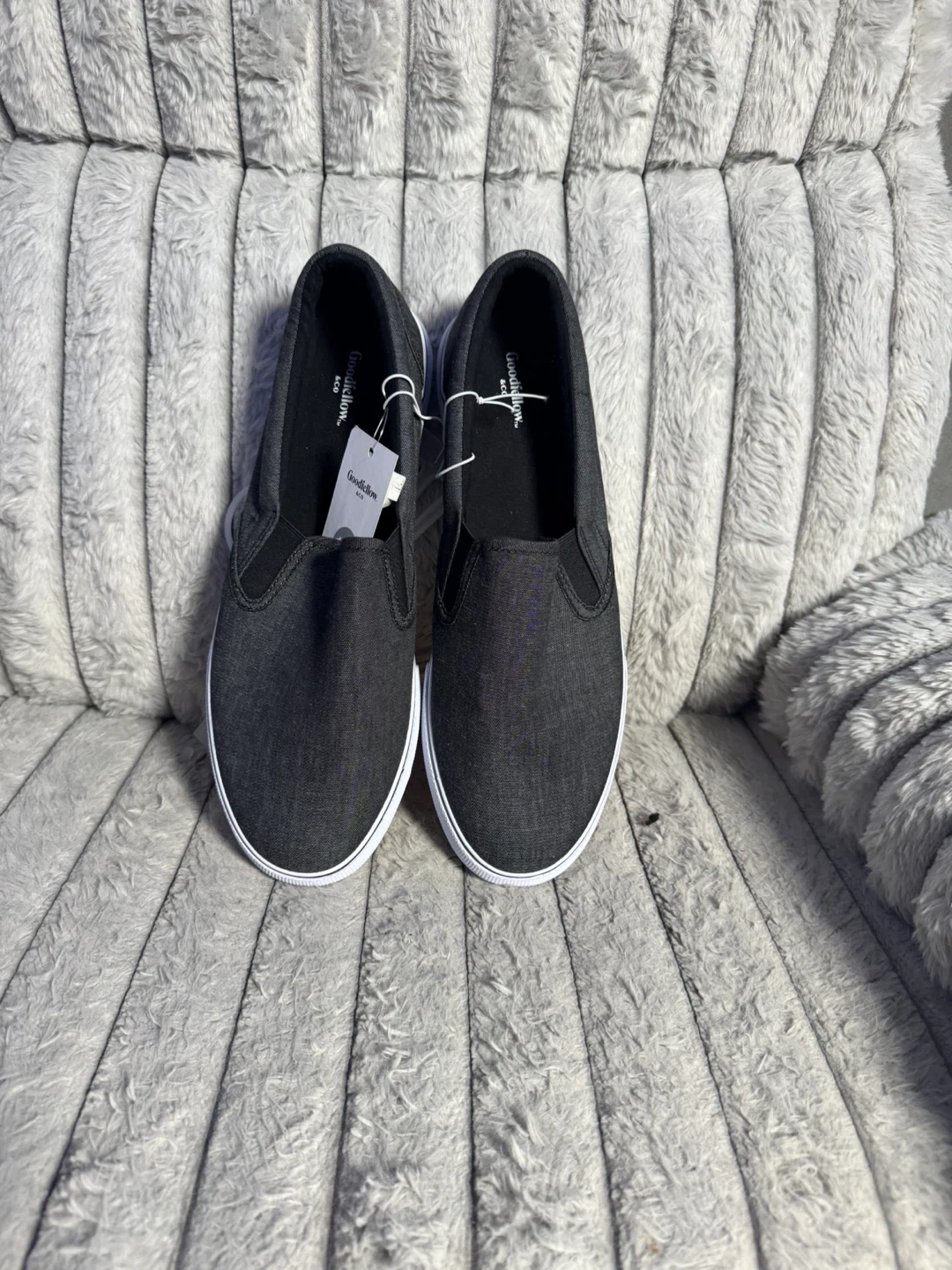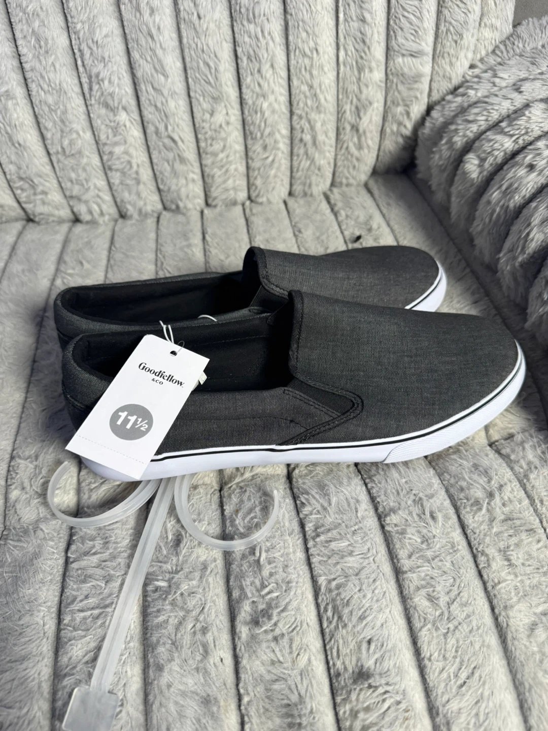 Men's dark gray slip-on shoes by Goodfellow & Co. These casual shoes are size 11.5. They're made with a canvas-like material and feature a white rubber sole. Easy to slide on and off!