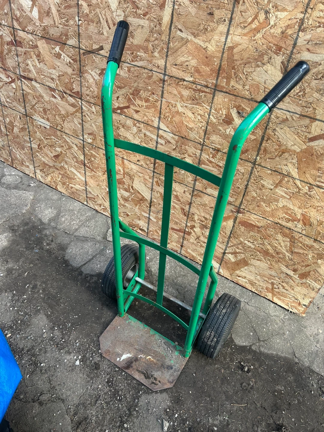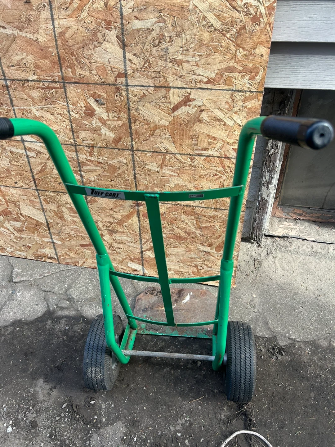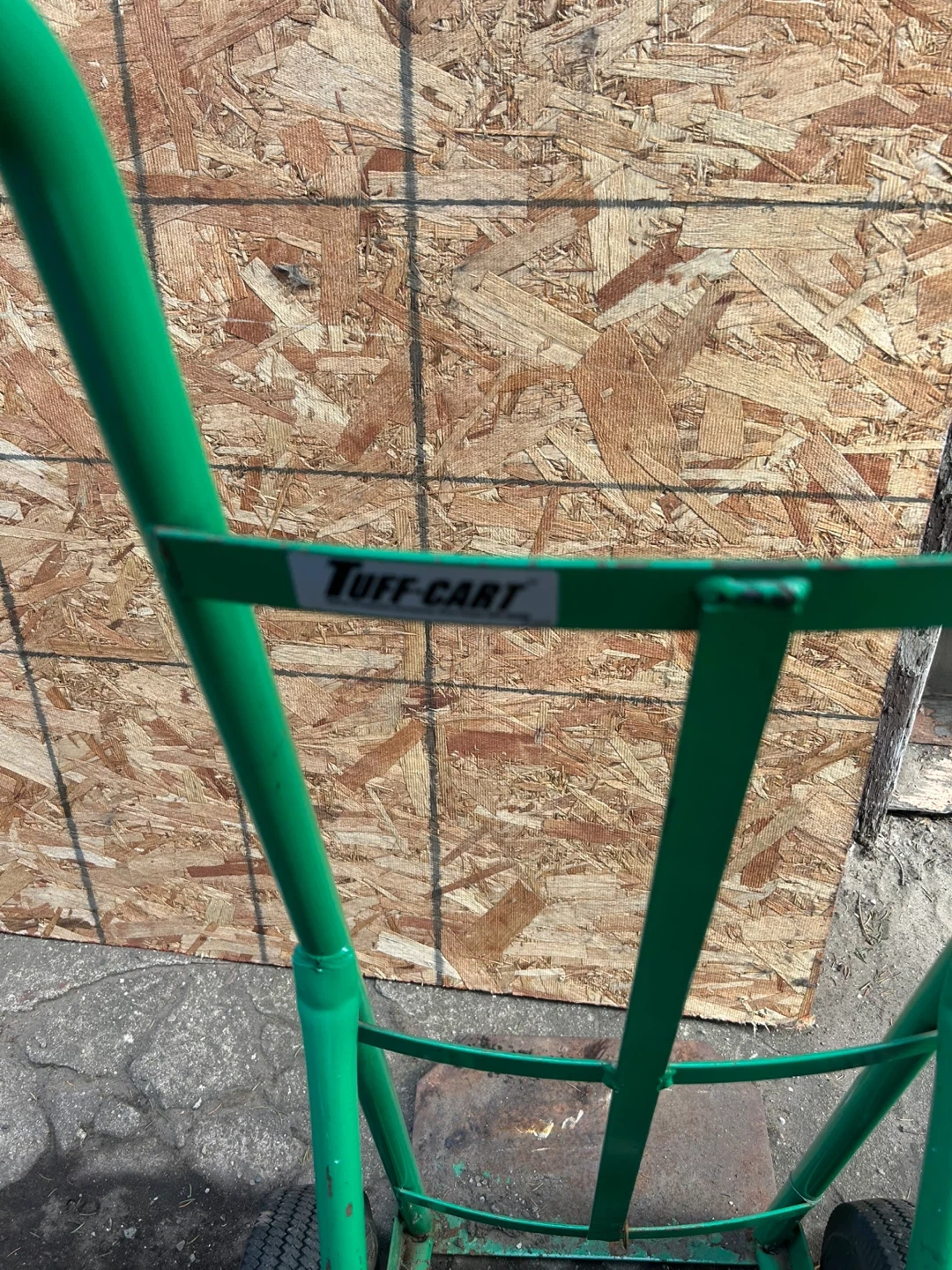 Green Tuff-Cart hand truck with two wheels. Steel construction. Handles measure 48" from the floor. Base plate measures 14" wide and 7" deep. It's useful for moving heavy items and boxes!