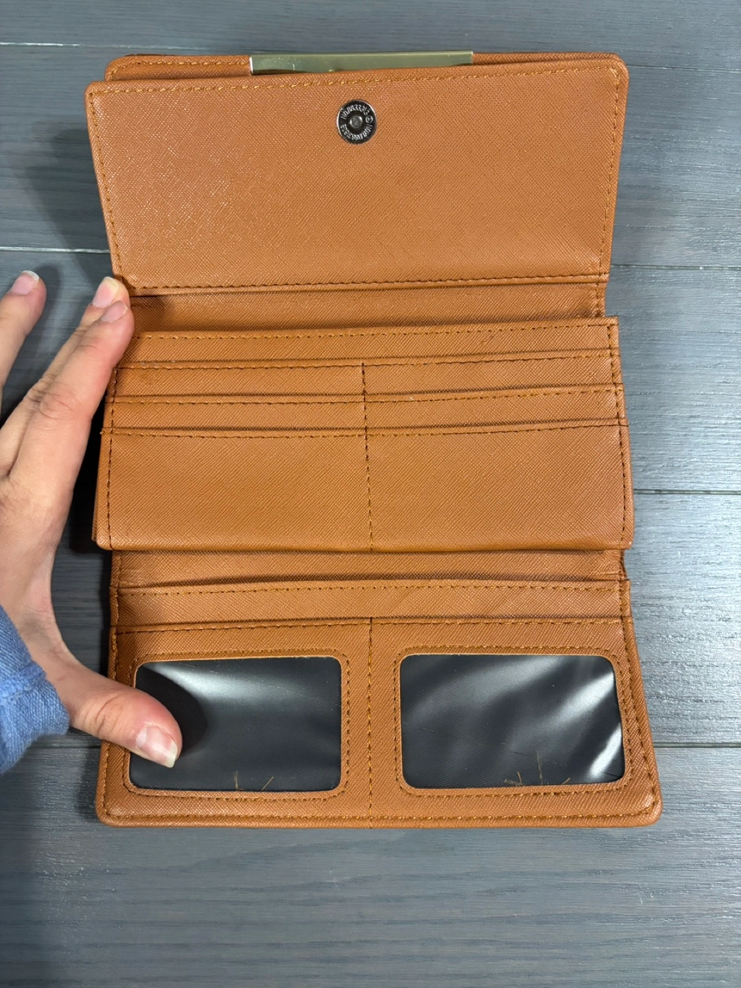 Brown faux leather wallet. Features a GG pattern and gold-tone hardware. Multiple card slots and compartments. Snap closure.
