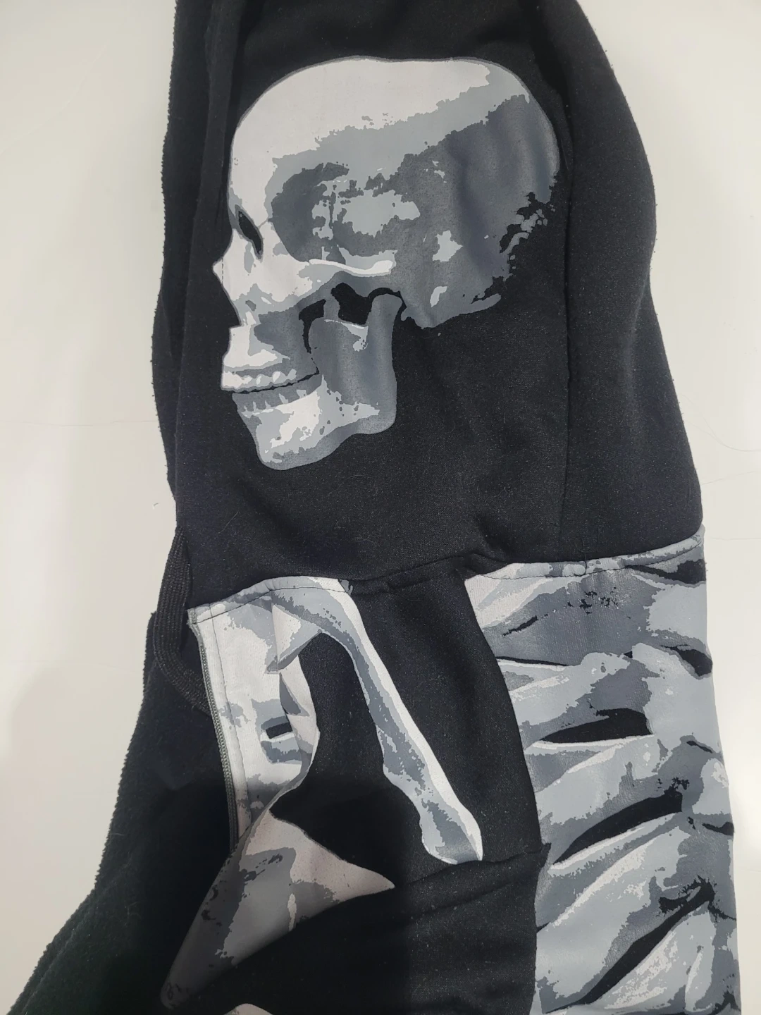 black zip-up hoodie with a skeleton print! design features a skull on the hood and a ribcage on the front. Sherpa like material on the inside.
