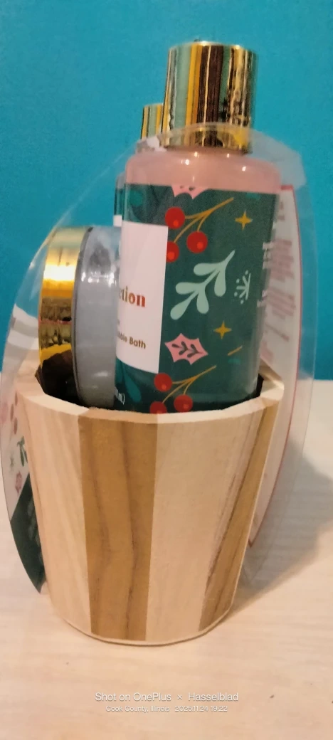 Here's a The Bath Collection set with a lovely Fallen Snow scent! It includes bubble bath, body wash, body lotion, and body scrub. The set comes in a cute wooden container, perfect for gifting or treating yourself