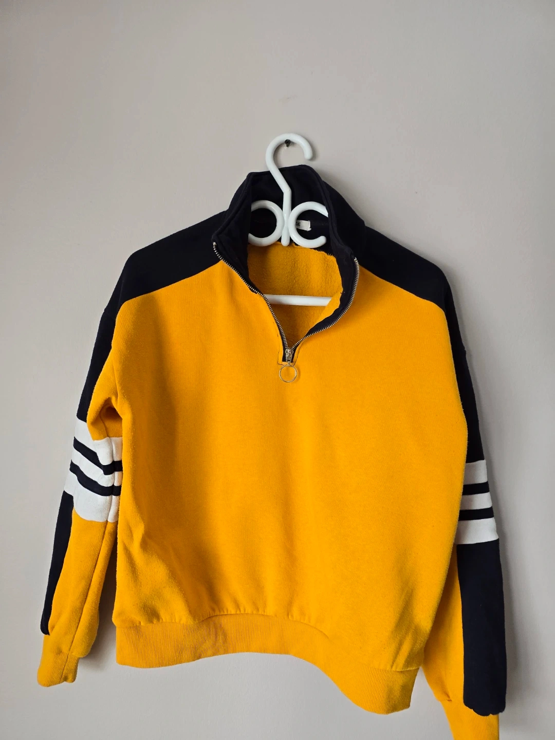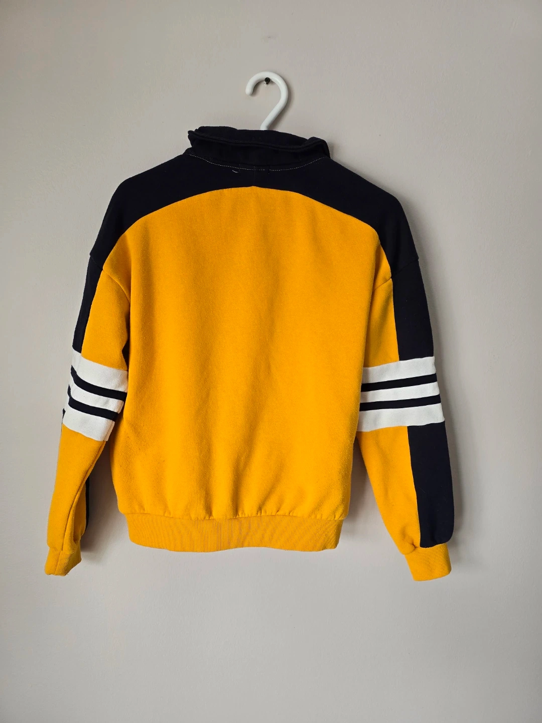 This comfy sweatshirt is yellow with navy blue sleeves and accents. It features a quarter-zip neckline and stripe details on the sleeves. A great casual piece for cooler weather!